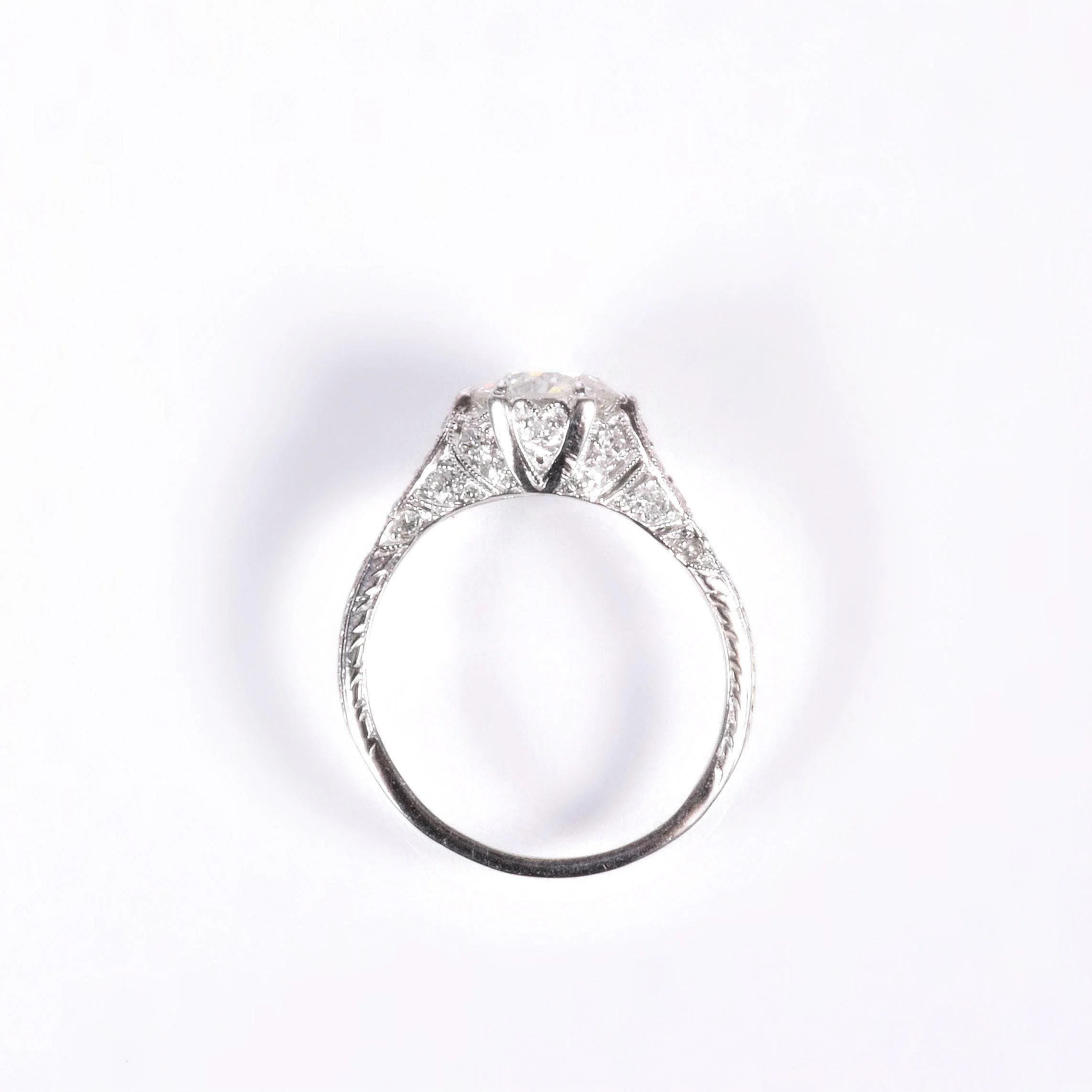 This Art Deco platinum 1.5 total diamond weight engagement ring is more than ready for its second debut with you! Classic in design, a shimmering, GIA certified 1 carat European cut diamond sits happily at the center amid a lightening layout of icy white tiny European diamonds on either side. As you study this beauty, you will see a darling heart shape north and south on the basket of the ring in addition to the wheat pattern on the shank. The wheat pattern was thought to signify a few things including a bountiful harvest, a connection to the natural world and fertility! This antique treasure will pair beautifully with a wedding band be it antique or modern.