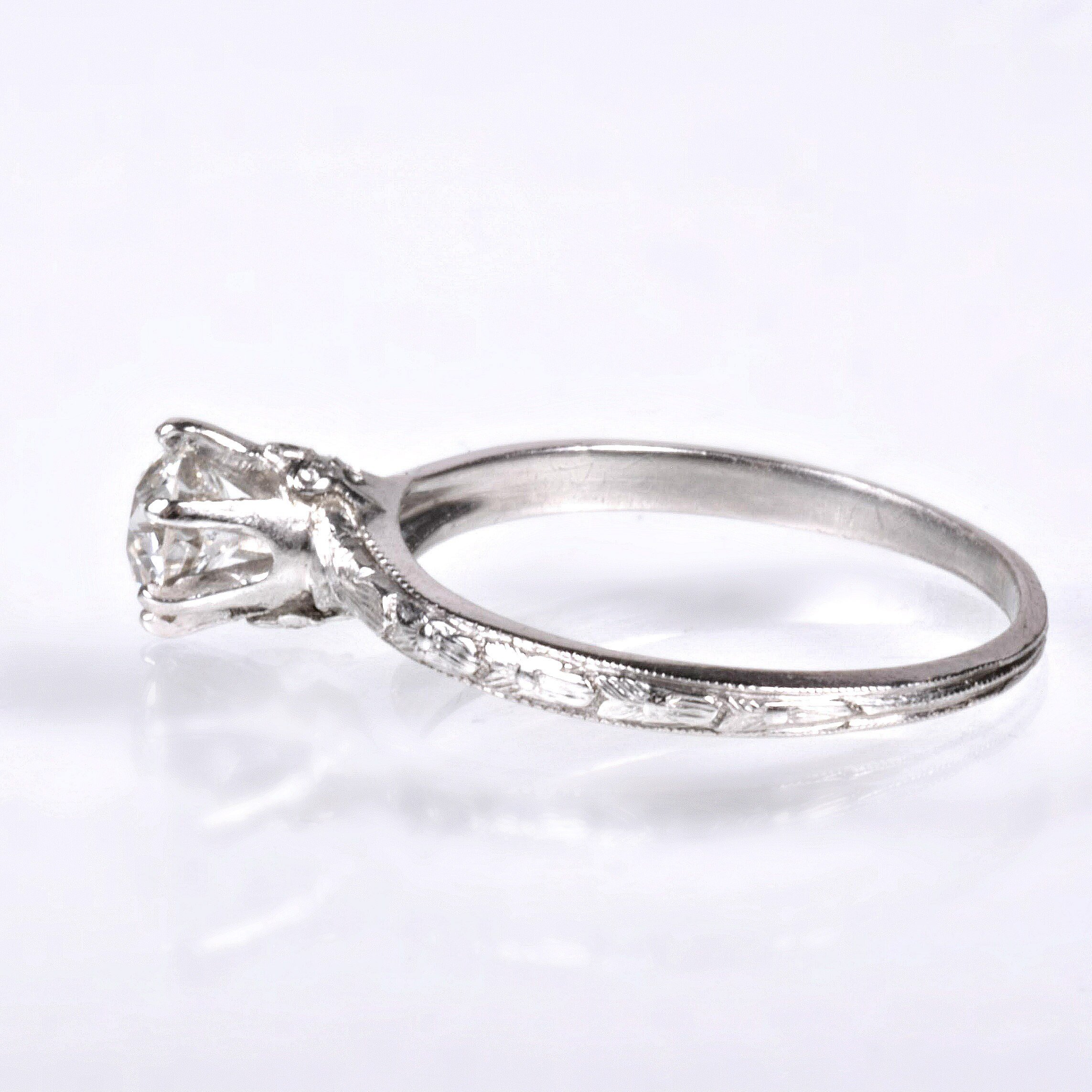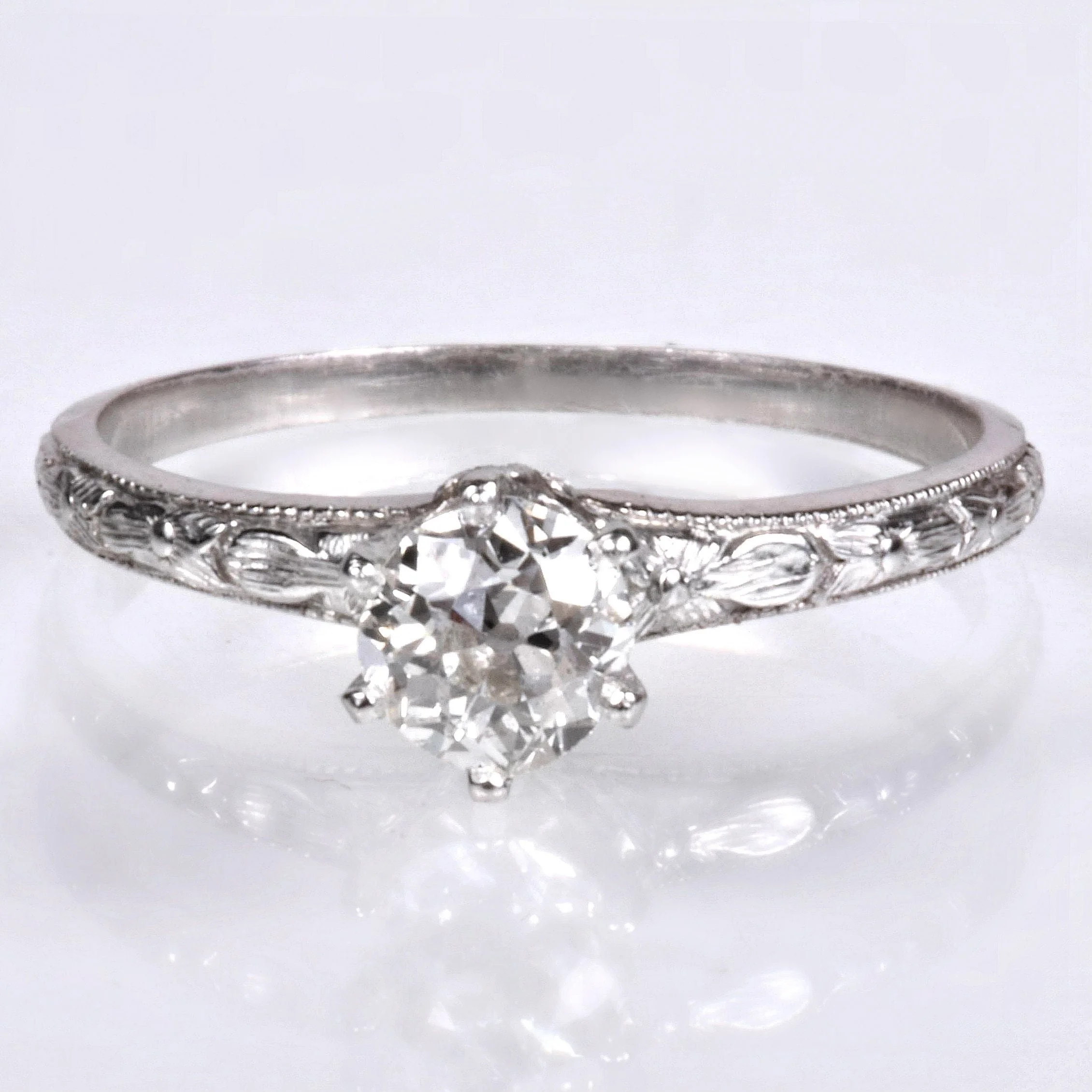 A killer old mine-cut diamond is celebrating life sitting in a lovely antique setting. This one has a somewhat higher profile, making it very easy to pair up with a complementing antique wedding band. Pretty little engraved flowers on the underneath side of the basket on each side, as well as on the shank....so romantic! Made of strong platinum, this is a classic, timeless beauty to propose with.