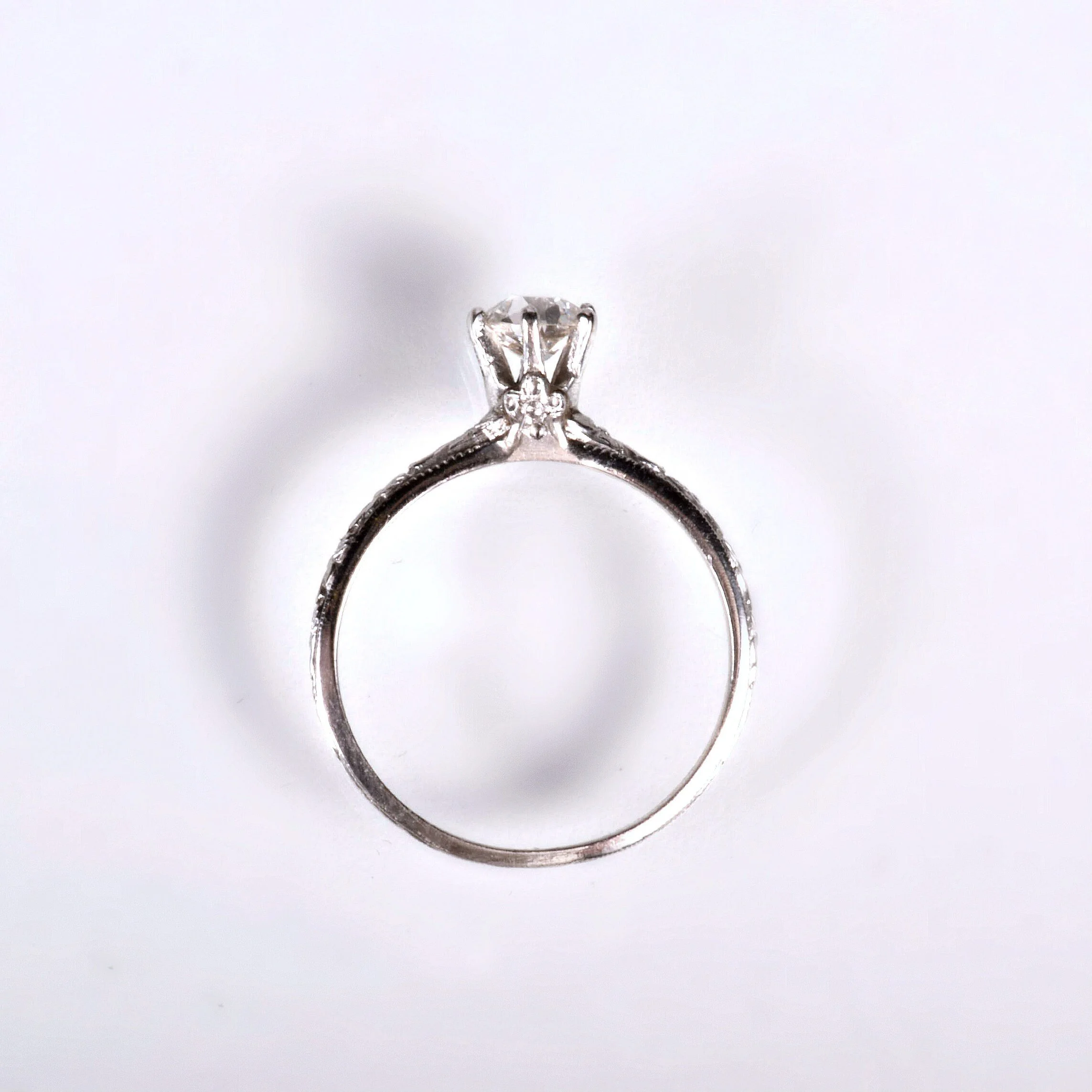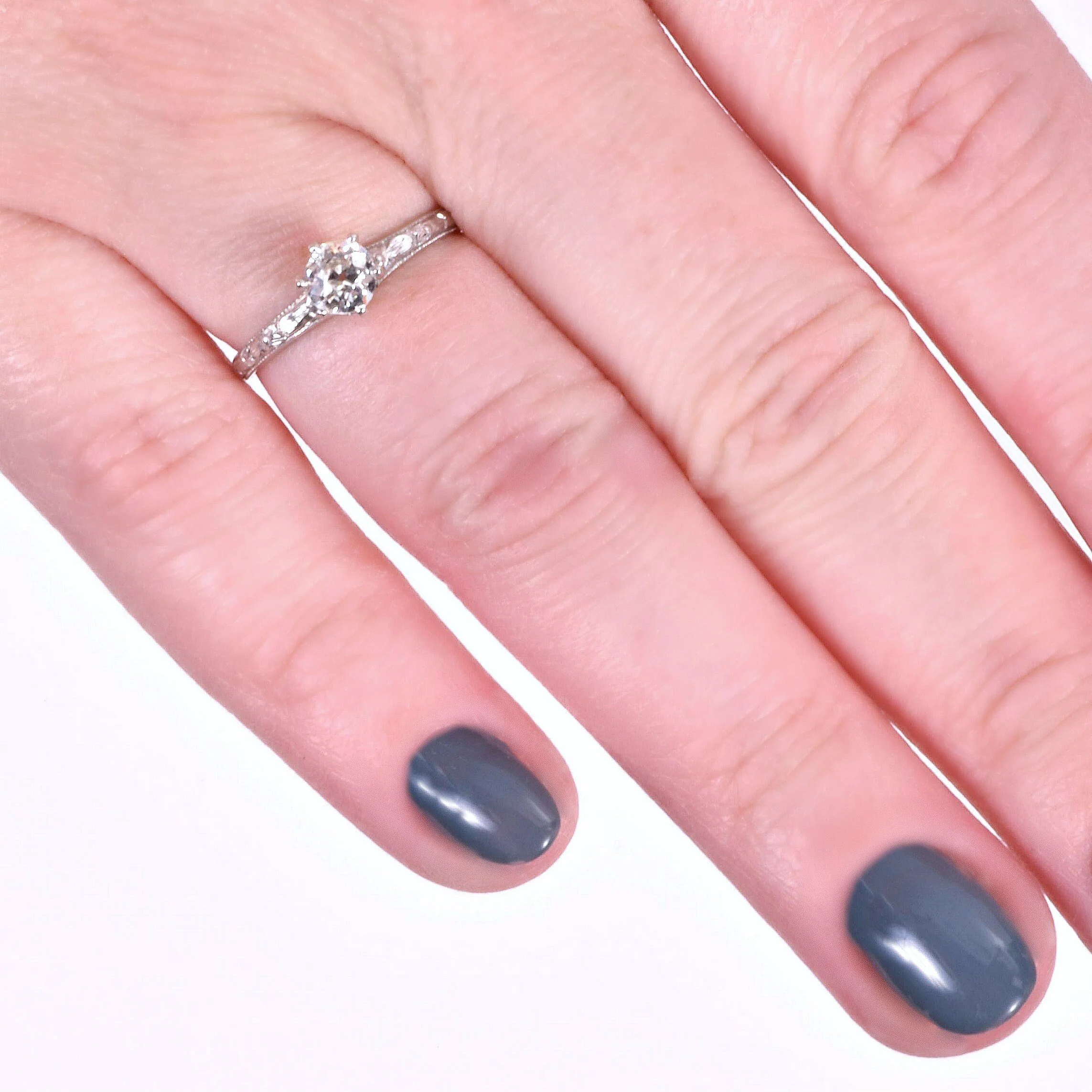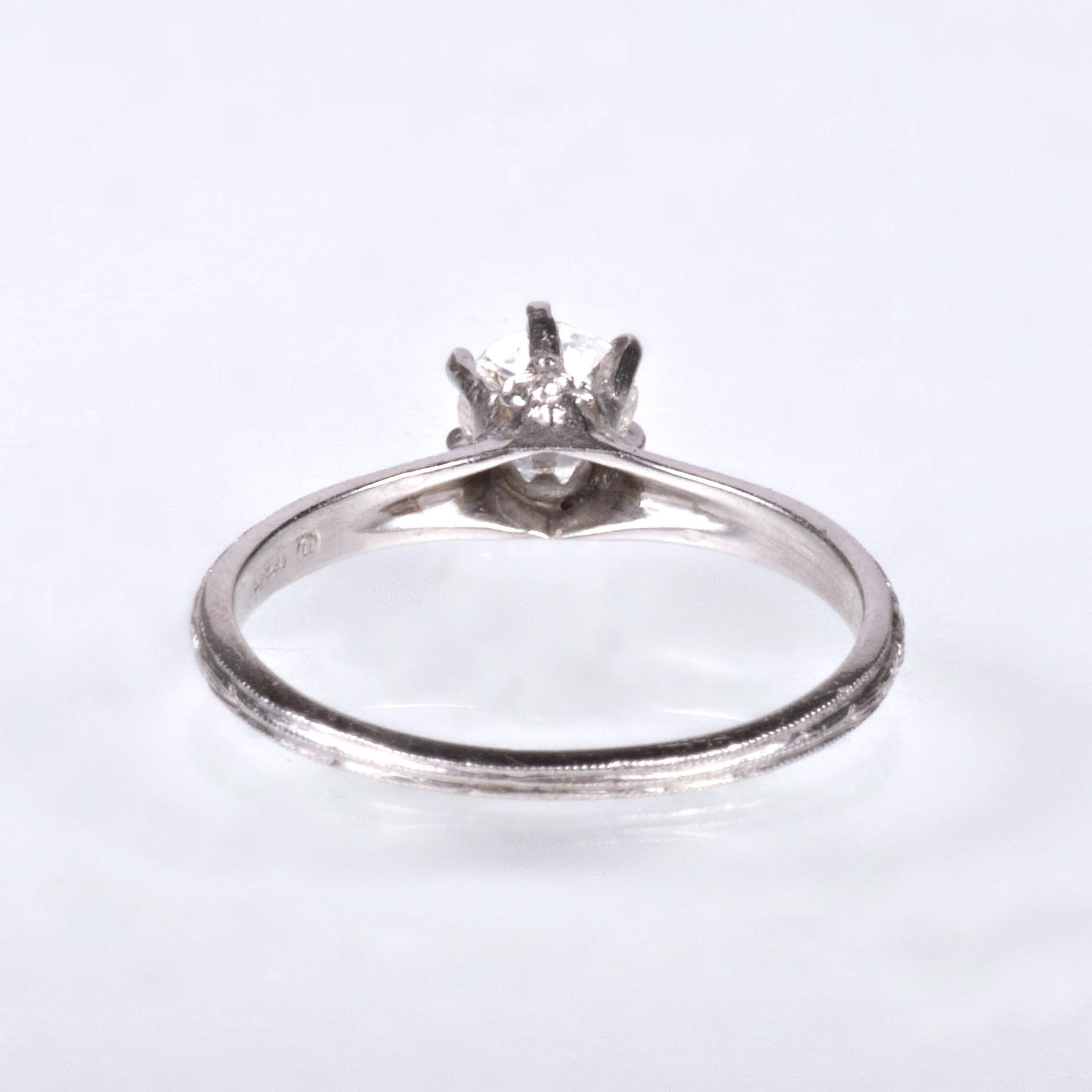 Antique Engagement Ring - Antique Platinum Old Mine Cut Diamond Engagement Ring Platinum Mine Cut Diamond =.41ct VS2/F Ring Size 5 (sizable) Ring measures approximately 5.8mm at center, back of band is 1.3mm wide.