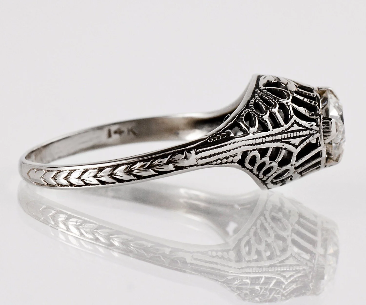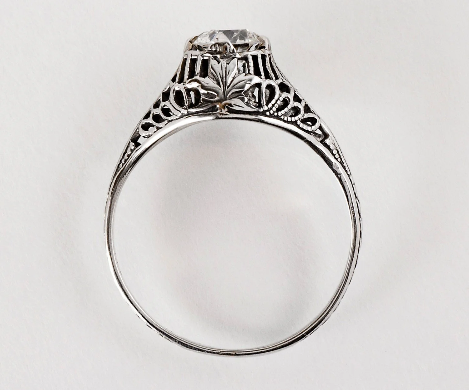 This ring is a wonderful example of the Edwardian period. The filigree work is gorgeous, and the European cut diamond sparkles beautifully! Filigree rings are so amazing because they are stunning from every angle!