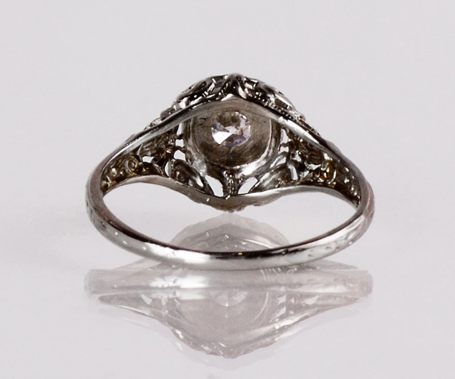 This Edwardian Era ring in bright 18n k white gold has gorgeous filigree detail and is in beautiful condition. The European Cut center diamond is of wonderful clarity and color.