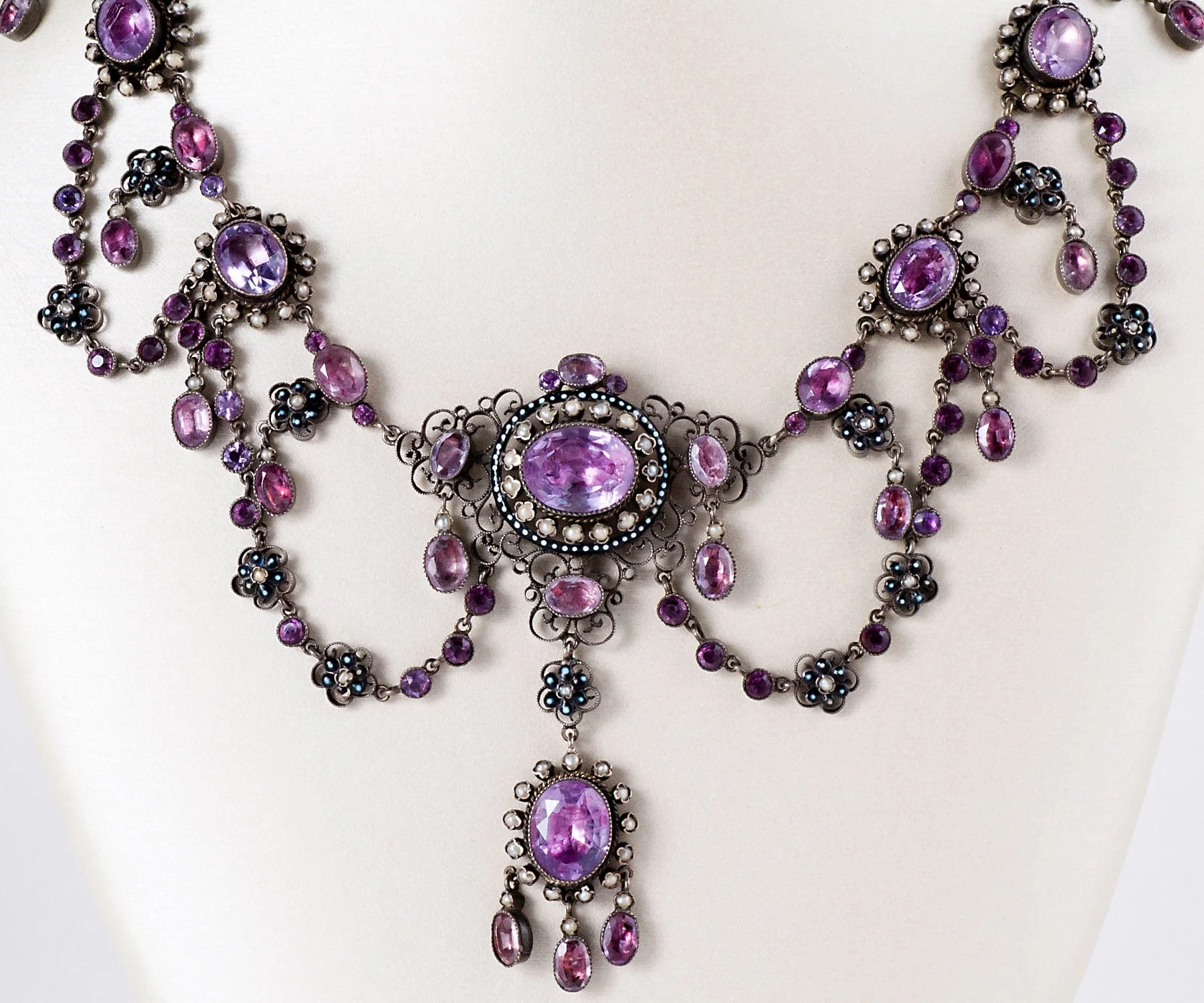 Antique Georgian Amethyst Necklace: Seed Pearl & Enamel Flowers