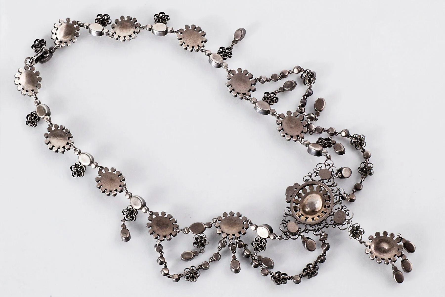 Exquisite Antique Georgian (1790 - 1810) Amethyst and Natural Seed Pearl Necklace. This necklace was crafted in both gold and silver as was common during this period. This stunning piece boasts hand faceted natural amethyst gemstones with enamel flowers. Sweeping dangling sections of small faceted amethyst and enamel sections fall dramatically. This rare statement piece would surely be a true treasure for any woman who appreciates historical Georgian jewelry.