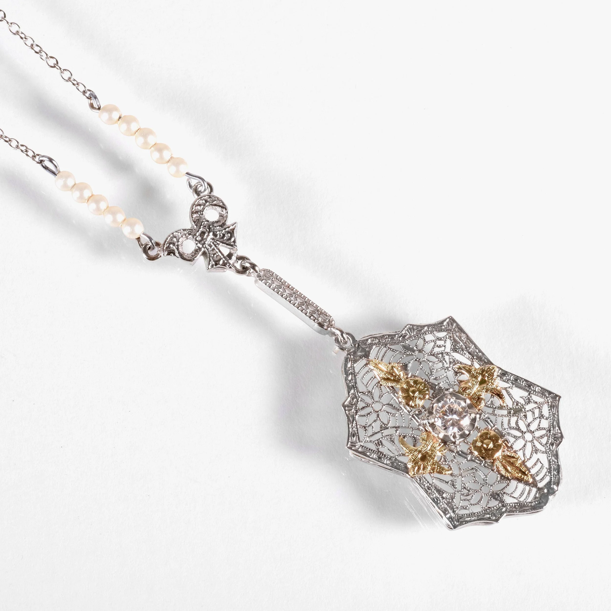 Antique Necklace - Antique 10k Yellow & White Gold Edwardian Filigree Diamond and Seed Pearl Necklace 10k Yellow & White Gold 1 Transitional Diamond =.20ct VS1/H Seed Pearls Pendant measures approximately 2" tall and .75" wide 10k white gold chain measures 16" long