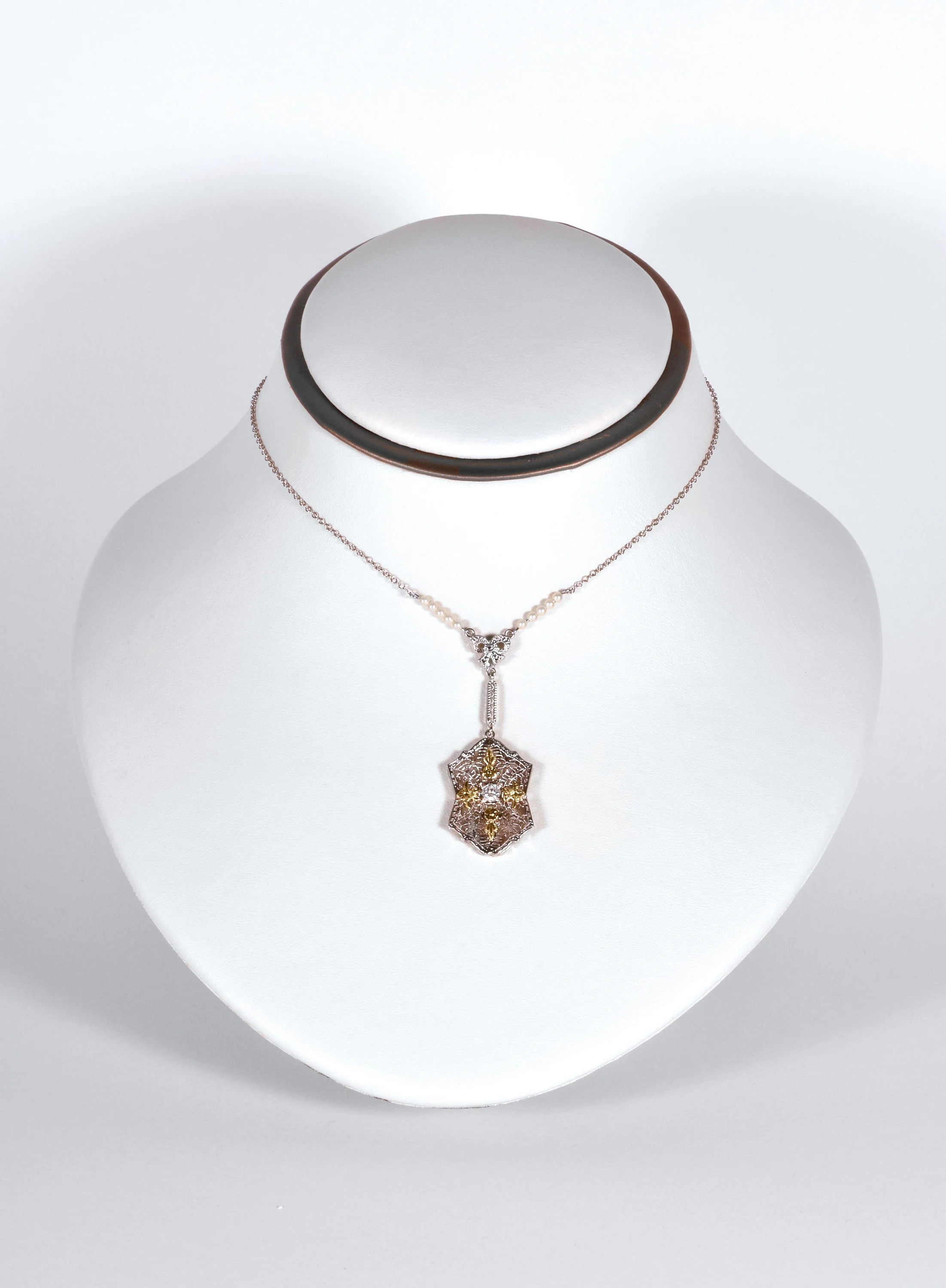 Antique Necklace - Antique 10k Yellow & White Gold Edwardian Filigree Diamond and Seed Pearl Necklace
