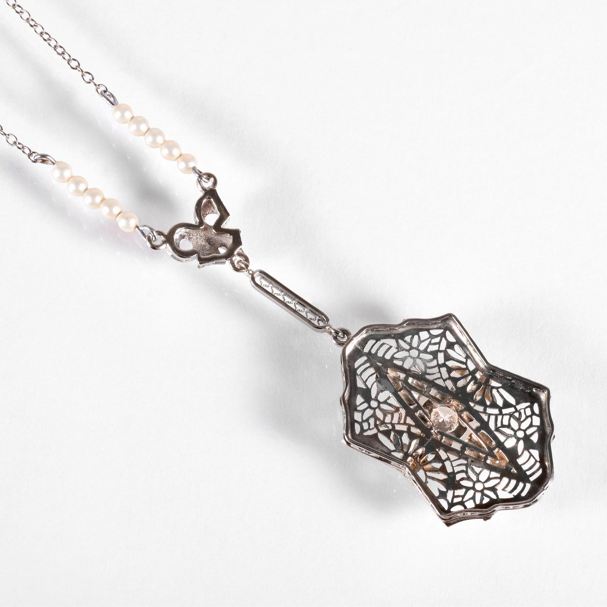 Antique Necklace - Antique 10k Yellow & White Gold Edwardian Filigree Diamond and Seed Pearl Necklace 10k Yellow & White Gold 1 Transitional Diamond =.20ct VS1/H Seed Pearls Pendant measures approximately 2" tall and .75" wide 10k white gold chain measures 16" long