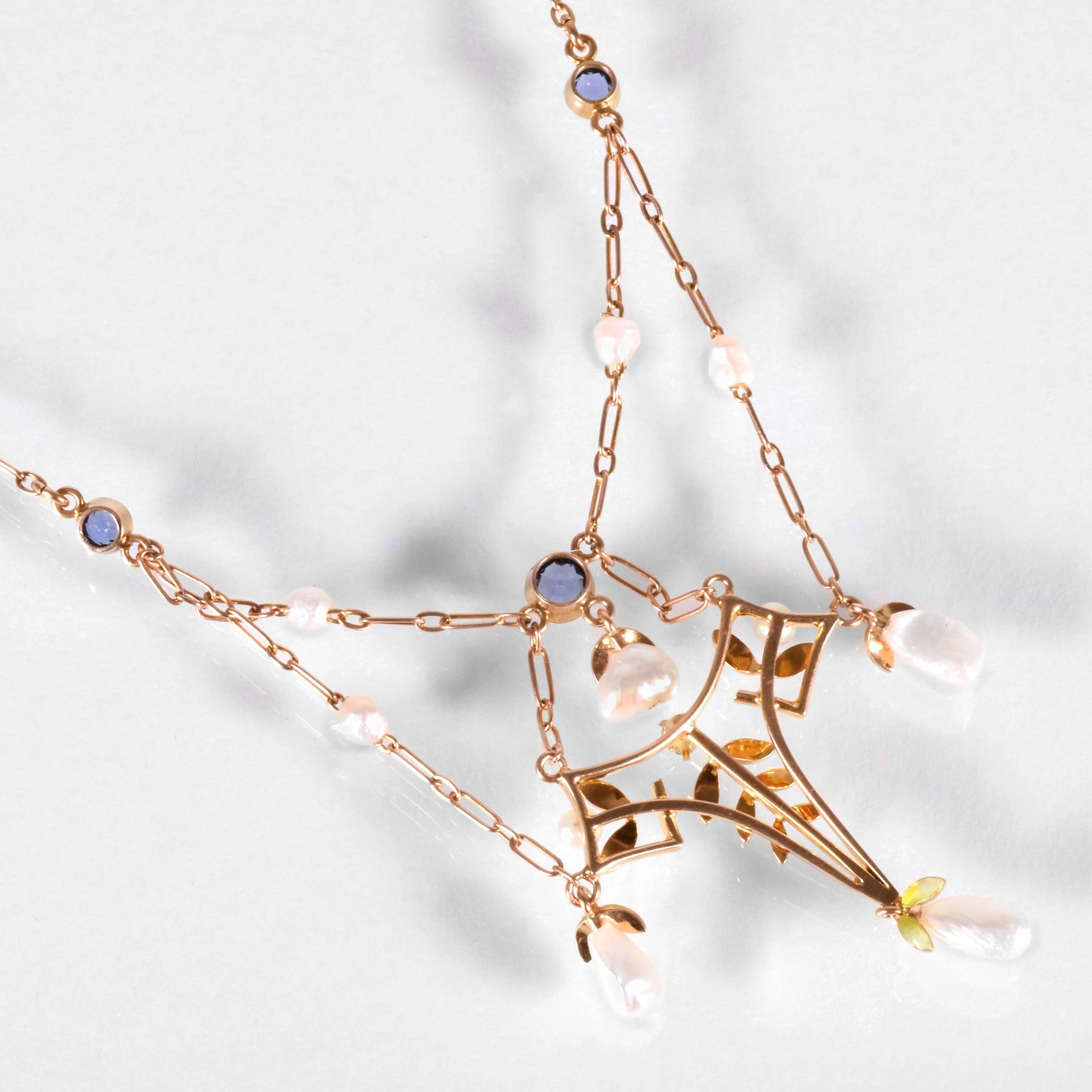 Antique Necklace - Antique 14k Rose Gold Edwardian Enamel Diamond Blue Sapphire and Fresh Water Pearl Necklace