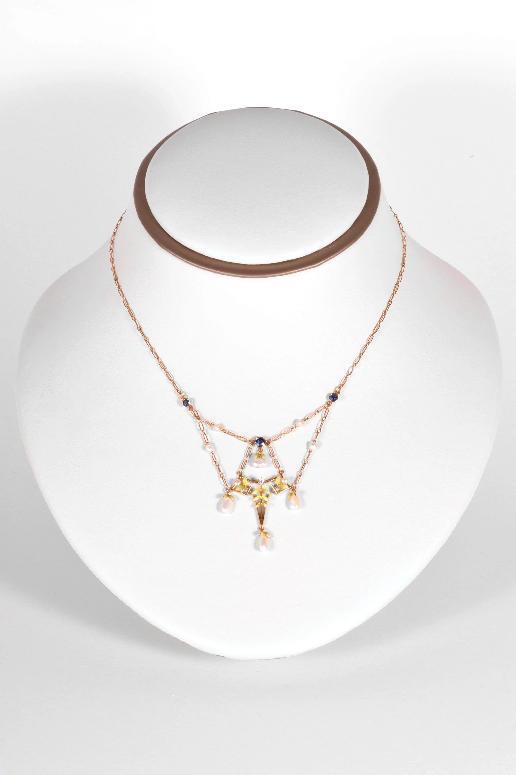 Antique Necklace - Antique 14k Rose Gold Edwardian Enamel Diamond Blue Sapphire and Fresh Water Pearl Necklace