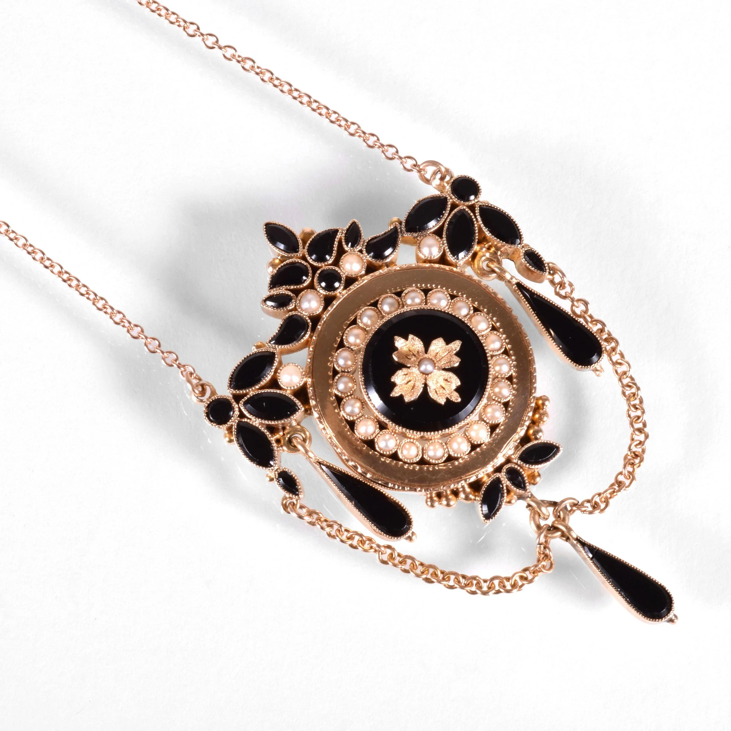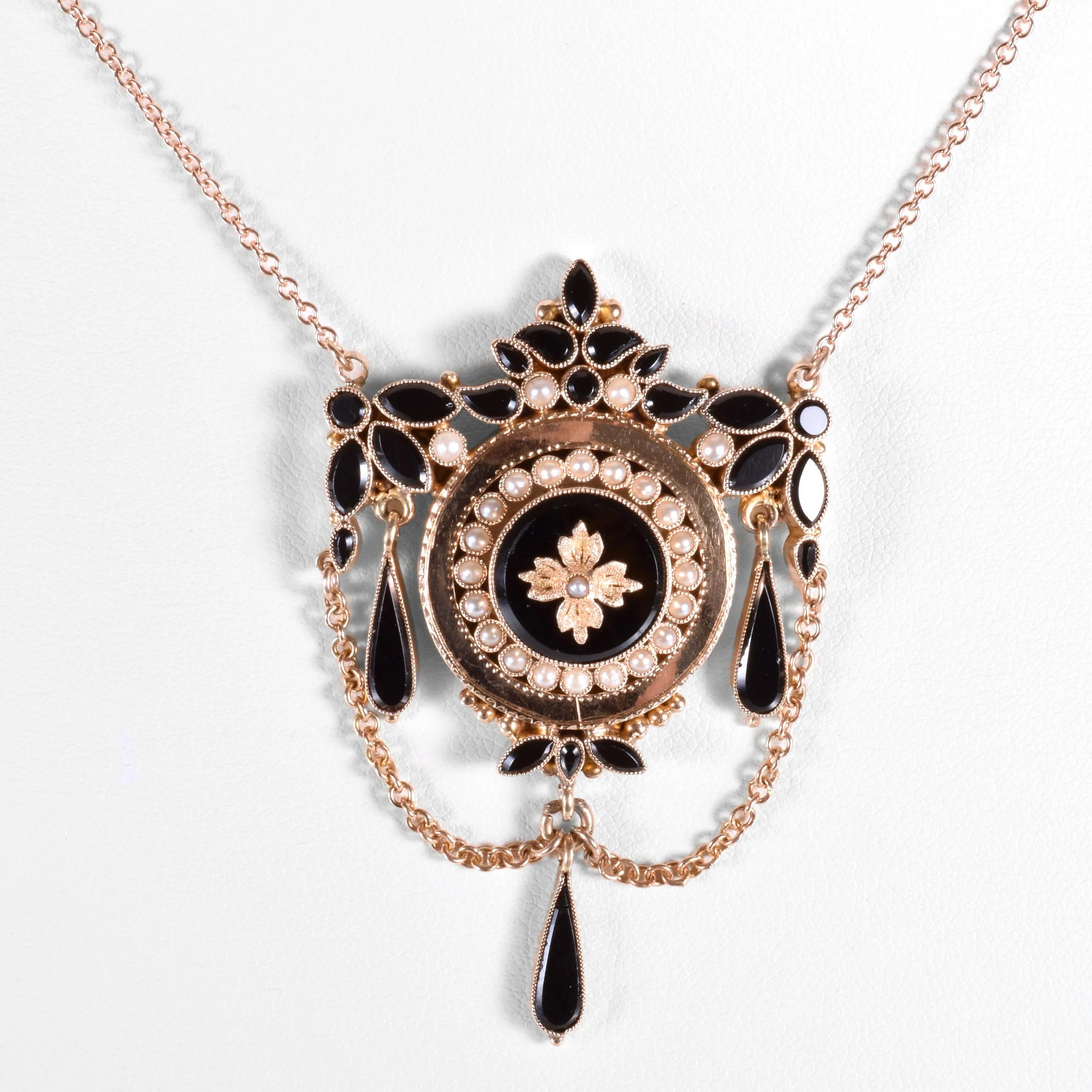 Antique Necklace - Antique 14k Rose Gold Victorian Black Onyx & Seed Pearl Conversion Necklace
