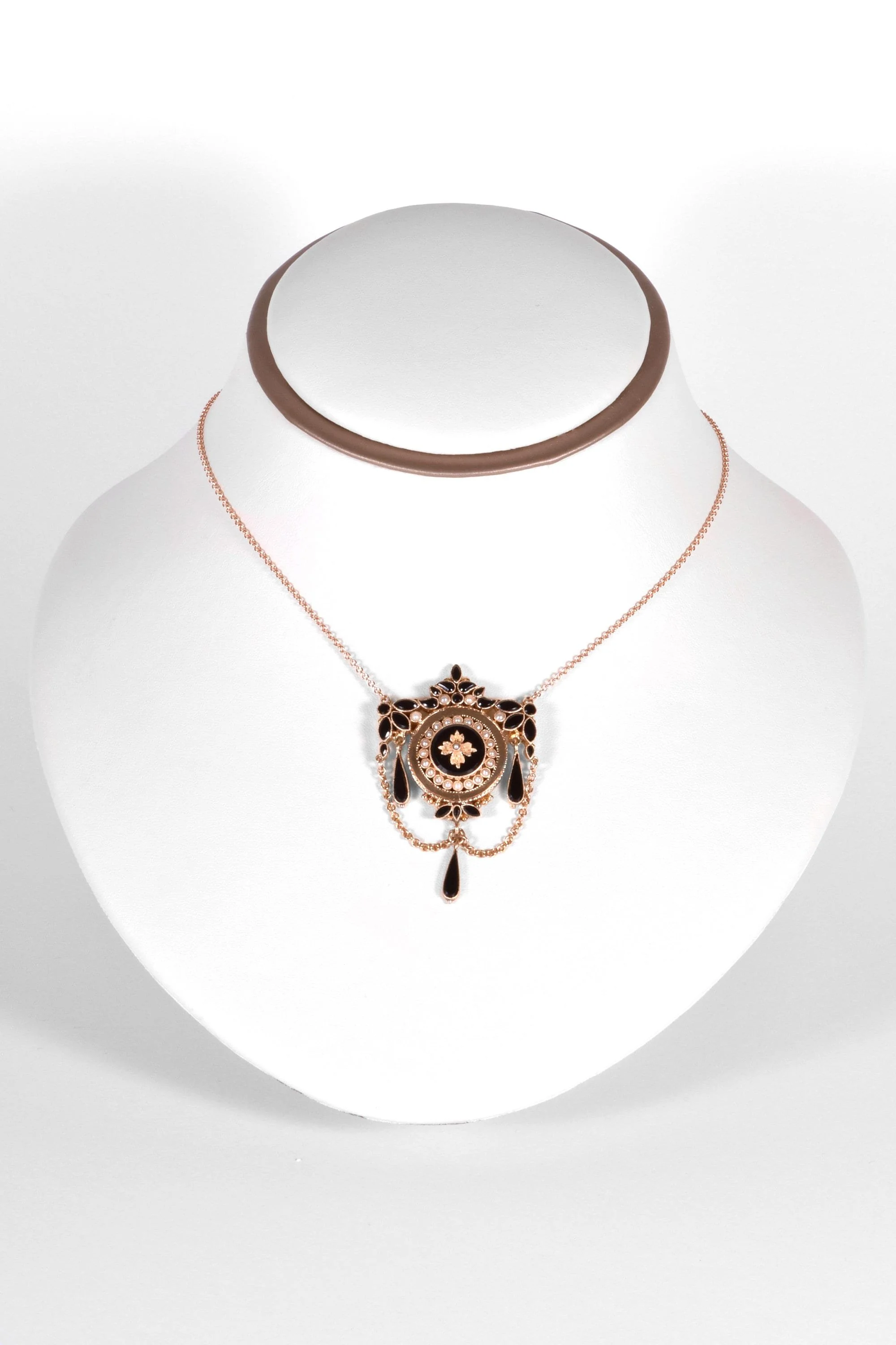Antique Necklace - Antique 14k Rose Gold Victorian Black Onyx & Seed Pearl Conversion Necklace