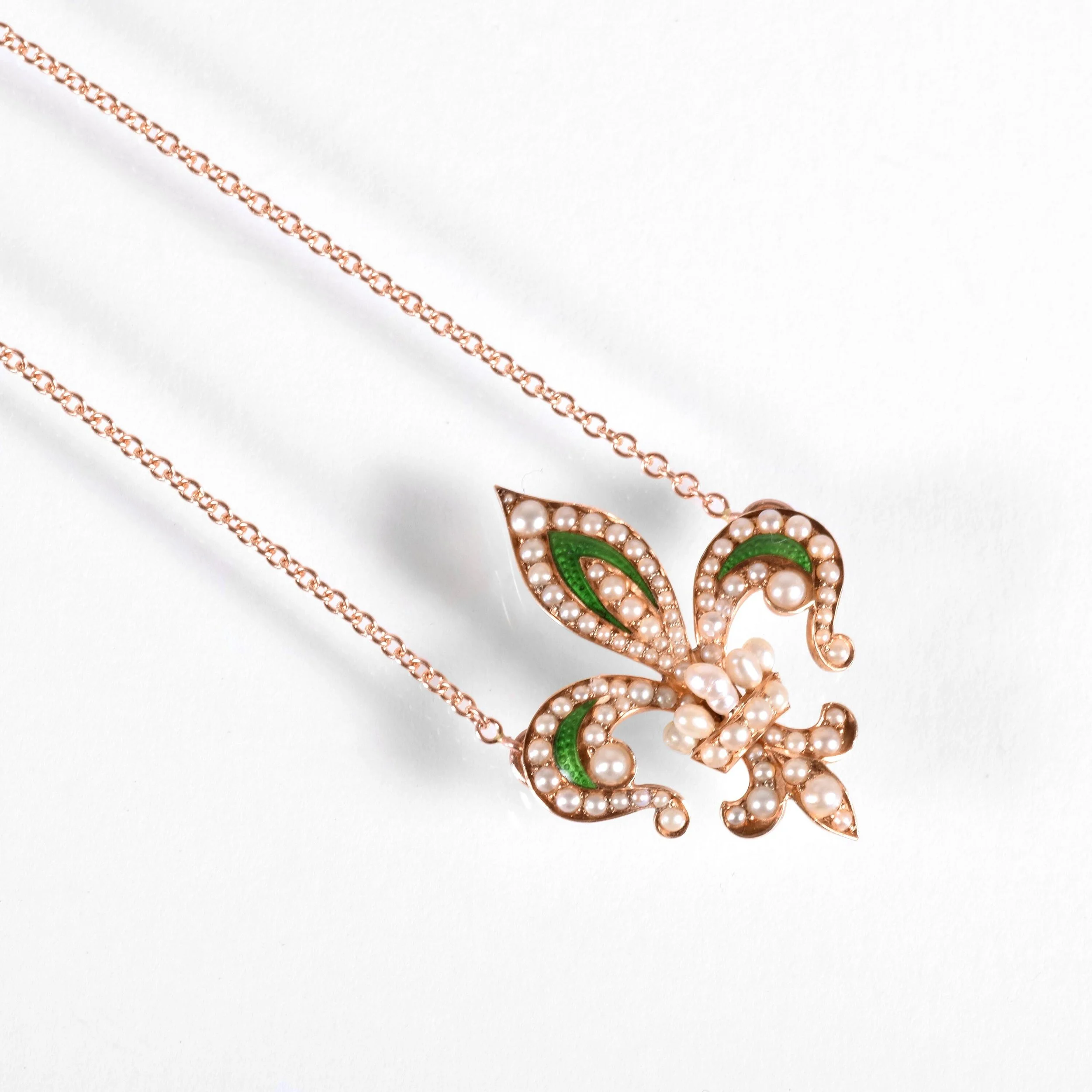 Antique Necklace - Antique 14k Two-Tone Victorian Enamel & Seed Pearl Fleur De Lis Conversion Necklace