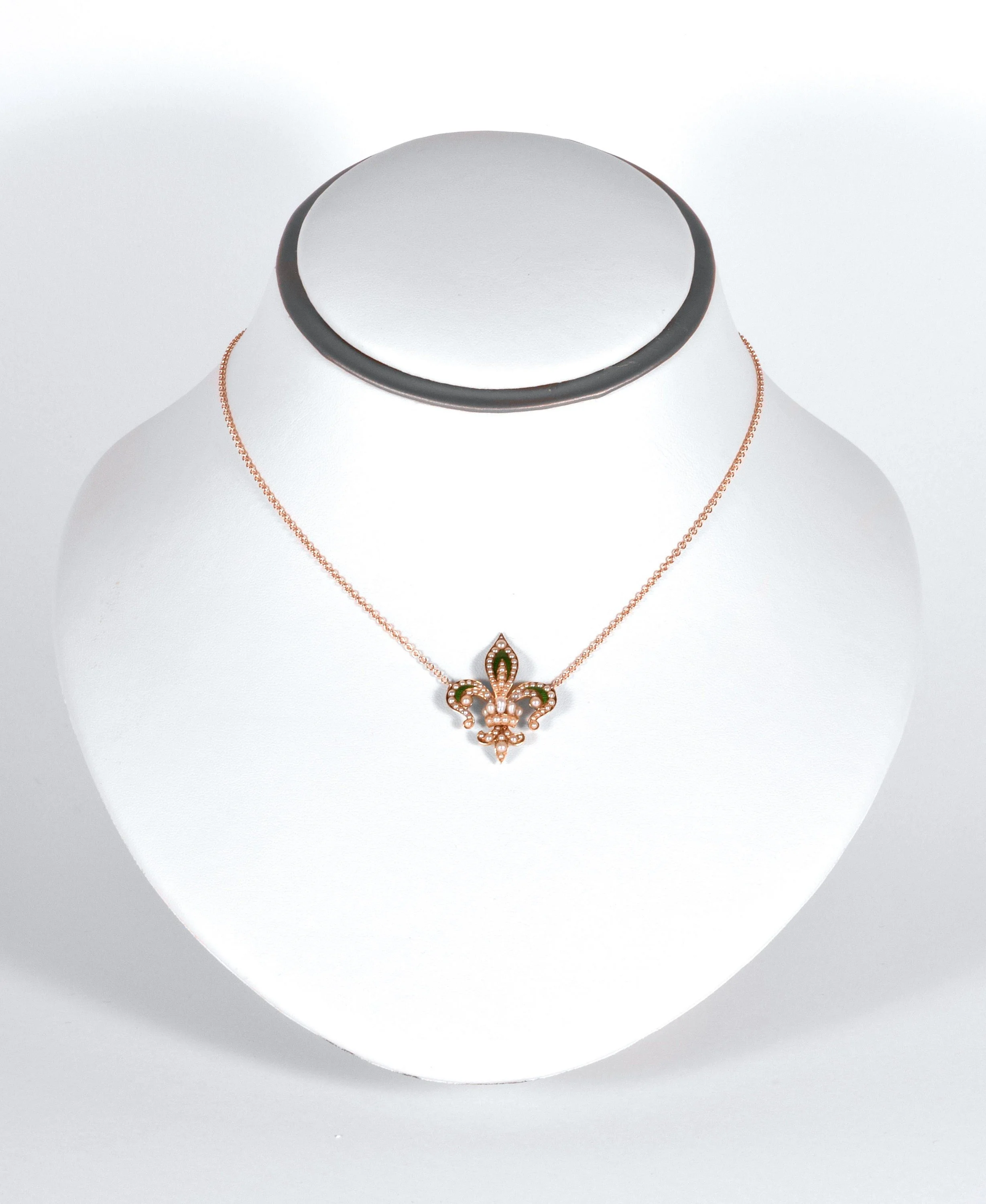 Traditionally associated with French Royalty, the Fleur De Lis, thought by many, symbolizes purity and chastity. This one is truly outstanding, and such an eye-catcher! This Victorian beauty was originally worn as a treasured brooch but we have reimagined it in our shop to the necklace you see here. It now hangs elegantly around the neck. This antique piece is adorned with sweet seed pearls and vivid green enamel.