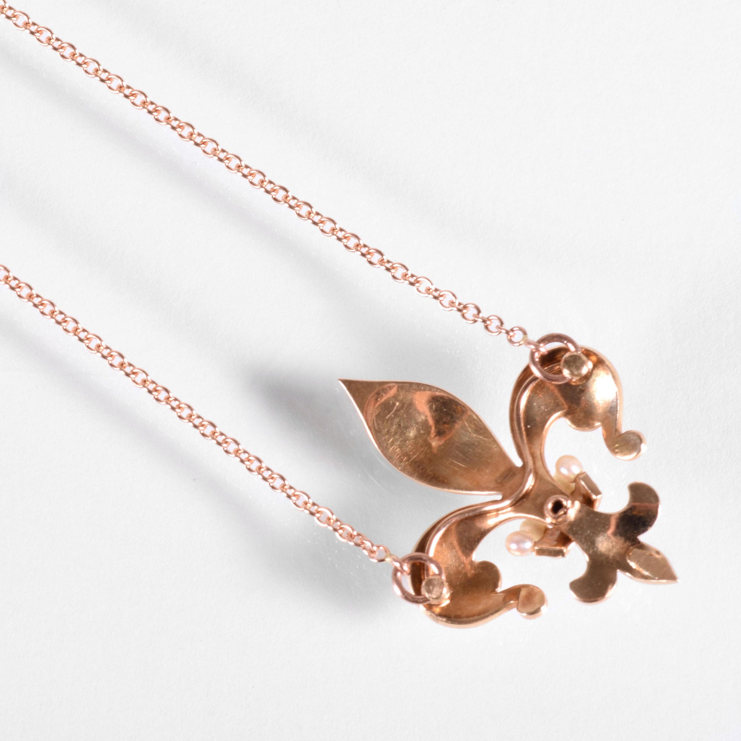Antique Necklace - Antique 14k Two-Tone Victorian Enamel & Seed Pearl Fleur De Lis Conversion Necklace Seed Pearls Enamel Pendant measures approximately 1 1/8" tall and approximately 7/8" wide New 14k rose gold chain measures 19" long with two adjustable jump rings at 18" and 17"