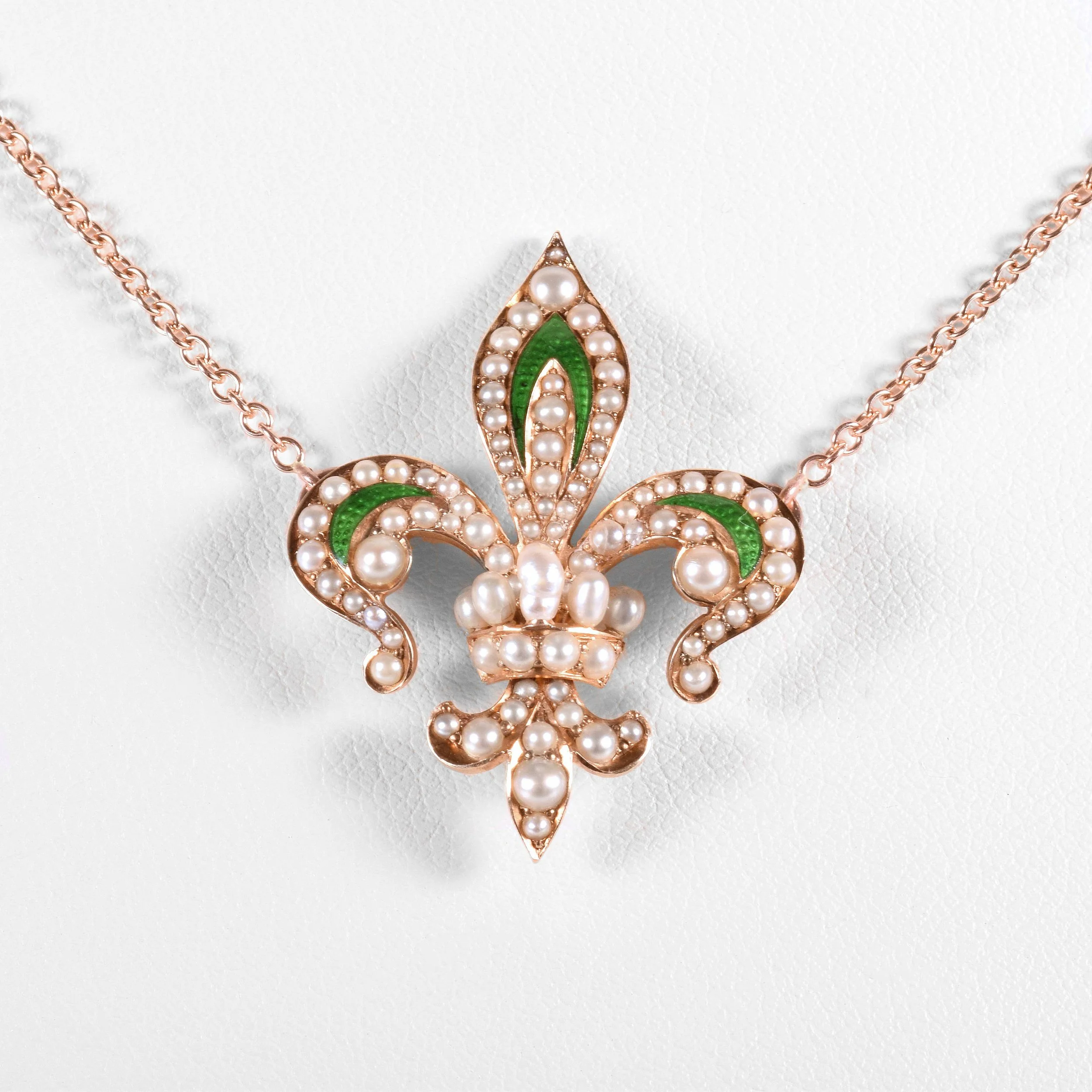 Antique Necklace - Antique 14k Two-Tone Victorian Enamel & Seed Pearl Fleur De Lis Conversion Necklace