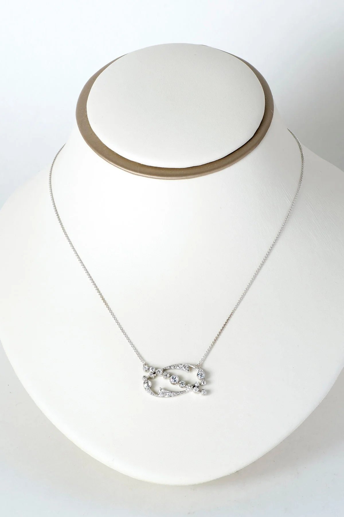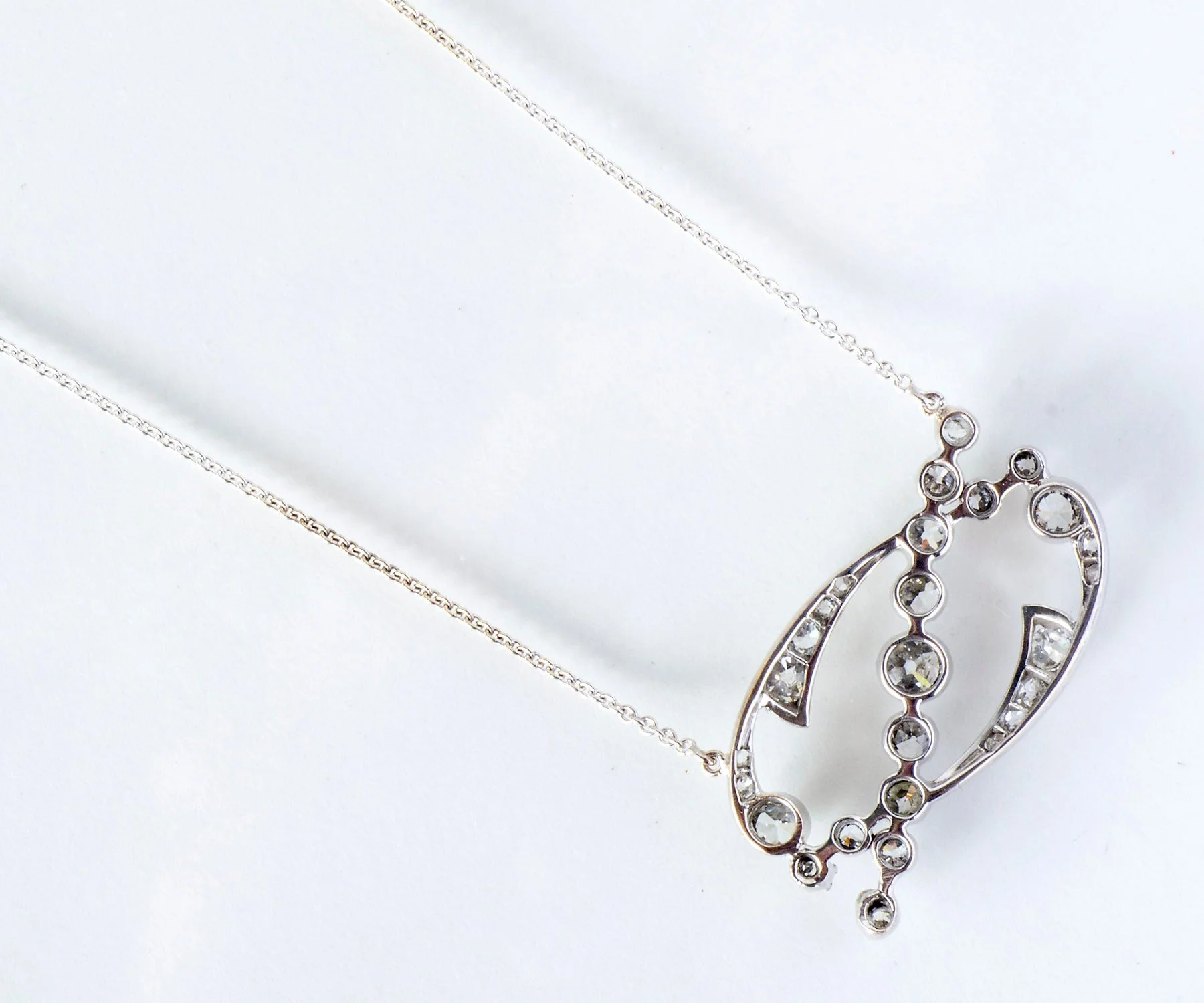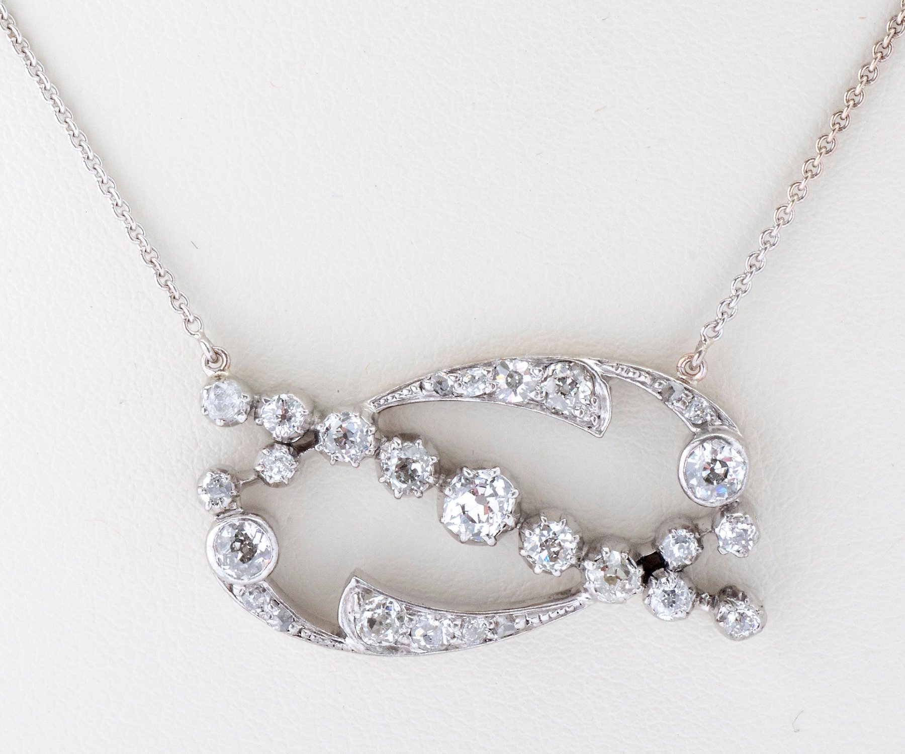 This is a truly gorgeous pendant. Originally an antique 14k white gold brooch, it has been converted into a beautiful necklace. It has twenty seven European cut diamonds totaling 1.30 carats with a unique swirl design. Easily worn as an everyday piece for that unique person who loves diamonds, or for special or dressy occasions.