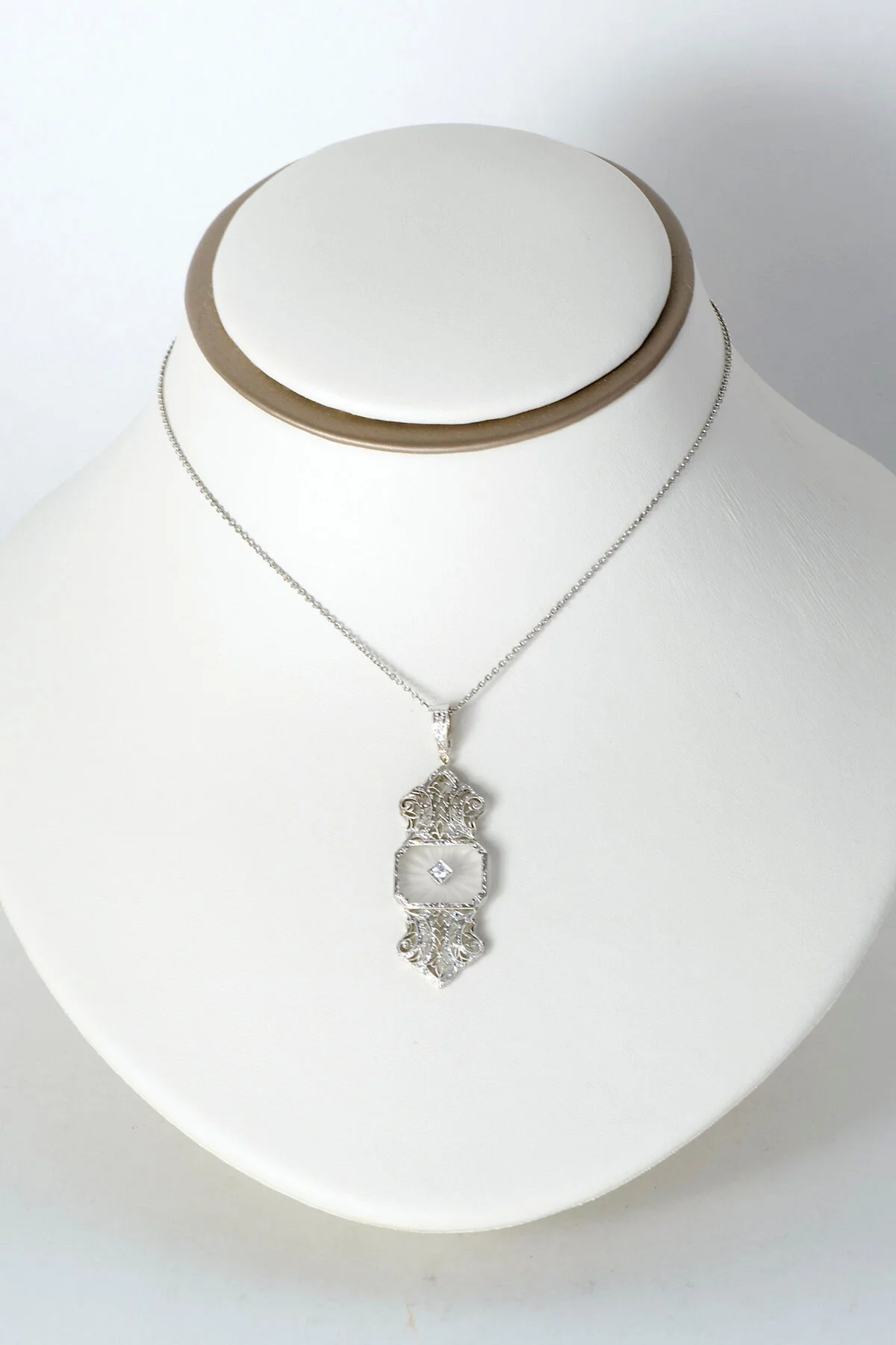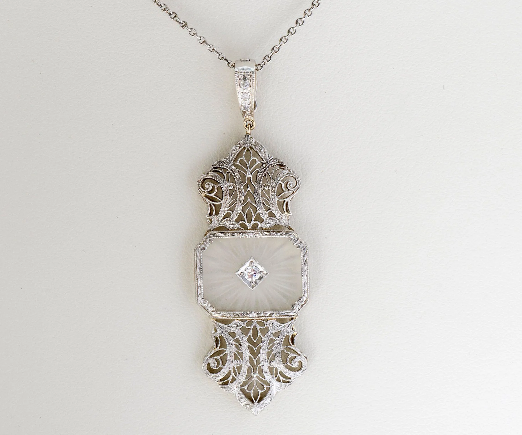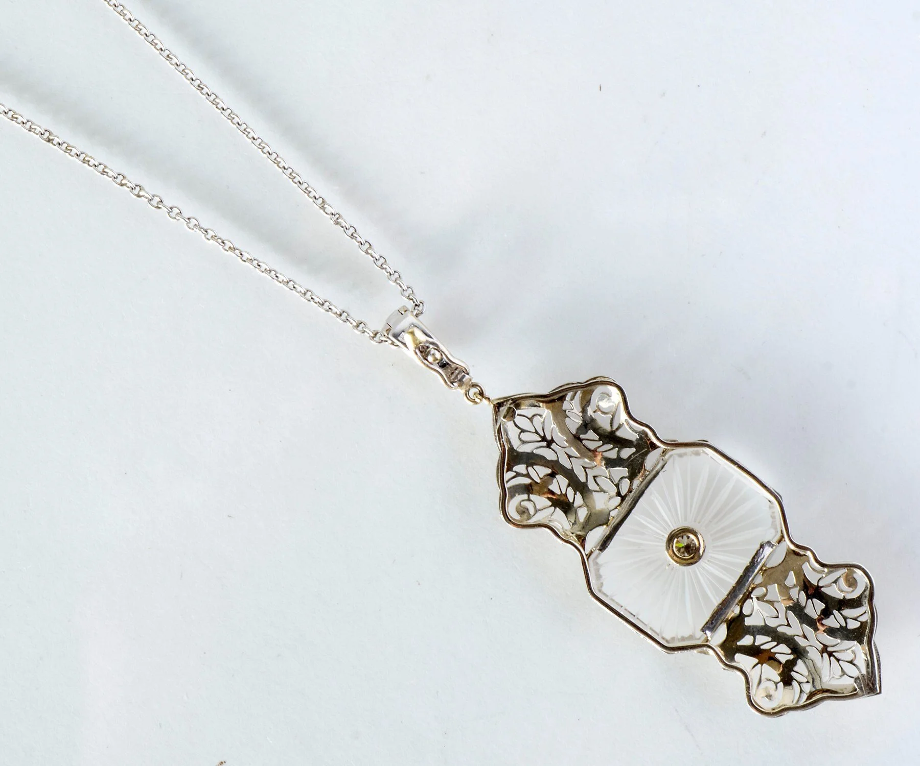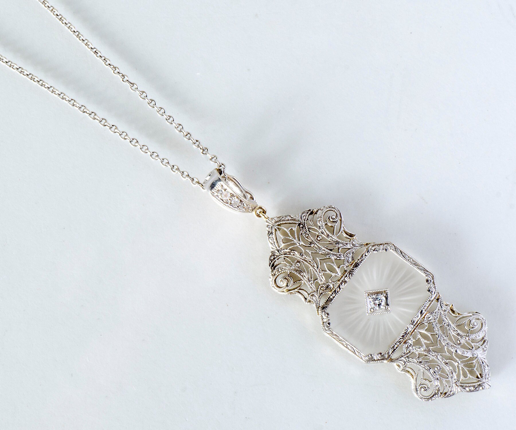 Antique Necklace - Antique 14k White Gold Crystal Quartz Diamond Filigree Pendant 14K White Gold 4 diamonds= .10ct