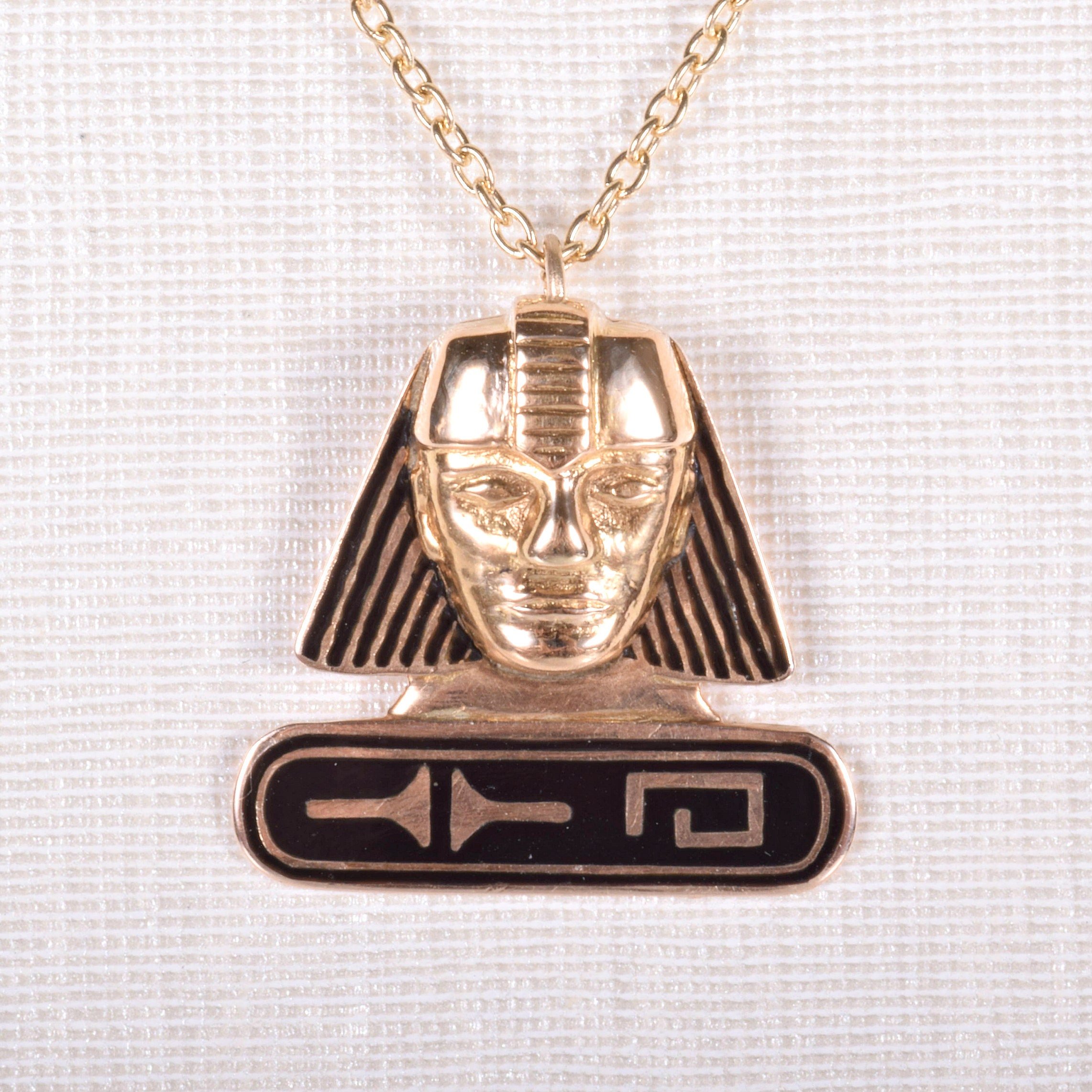 Egyptian revival in jewelry was begun when Napoleon returned to Paris from Egypt with exciting design inspiration. It appears that due to its popularity, Egyptian-inspired jewels continued into the Art Deco period. Enter this killer of a pendant piece! Artful, dimensional and striking, this antique treasure is sure to turn heads!