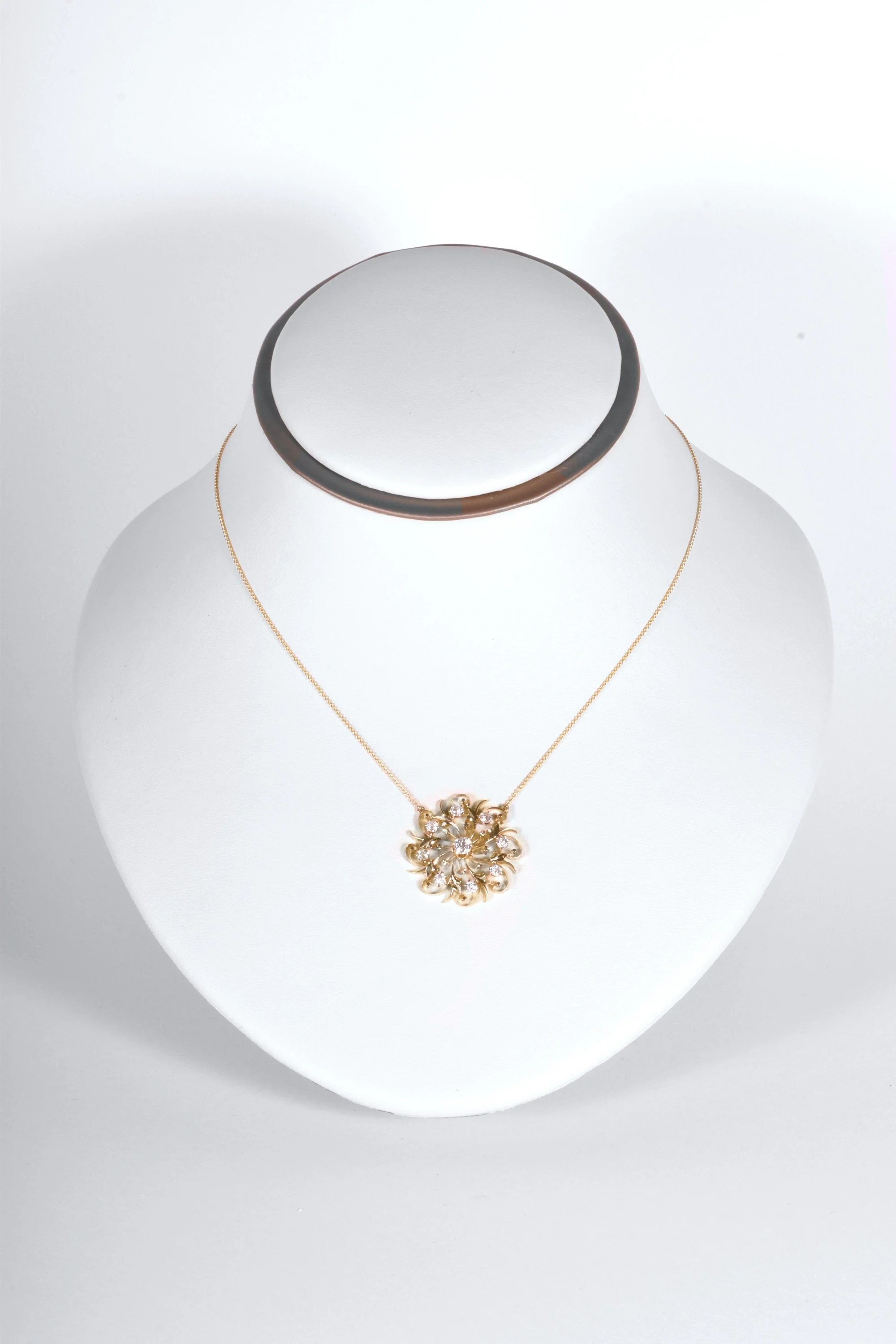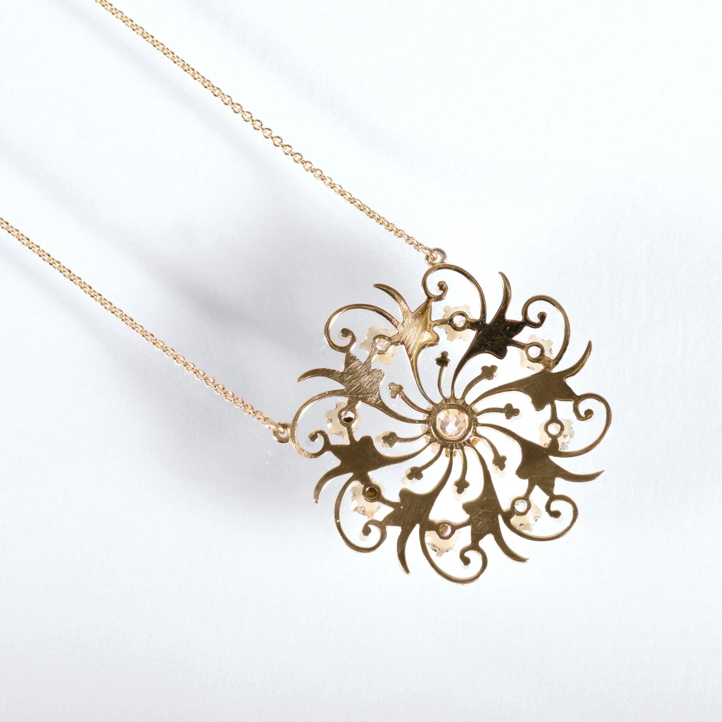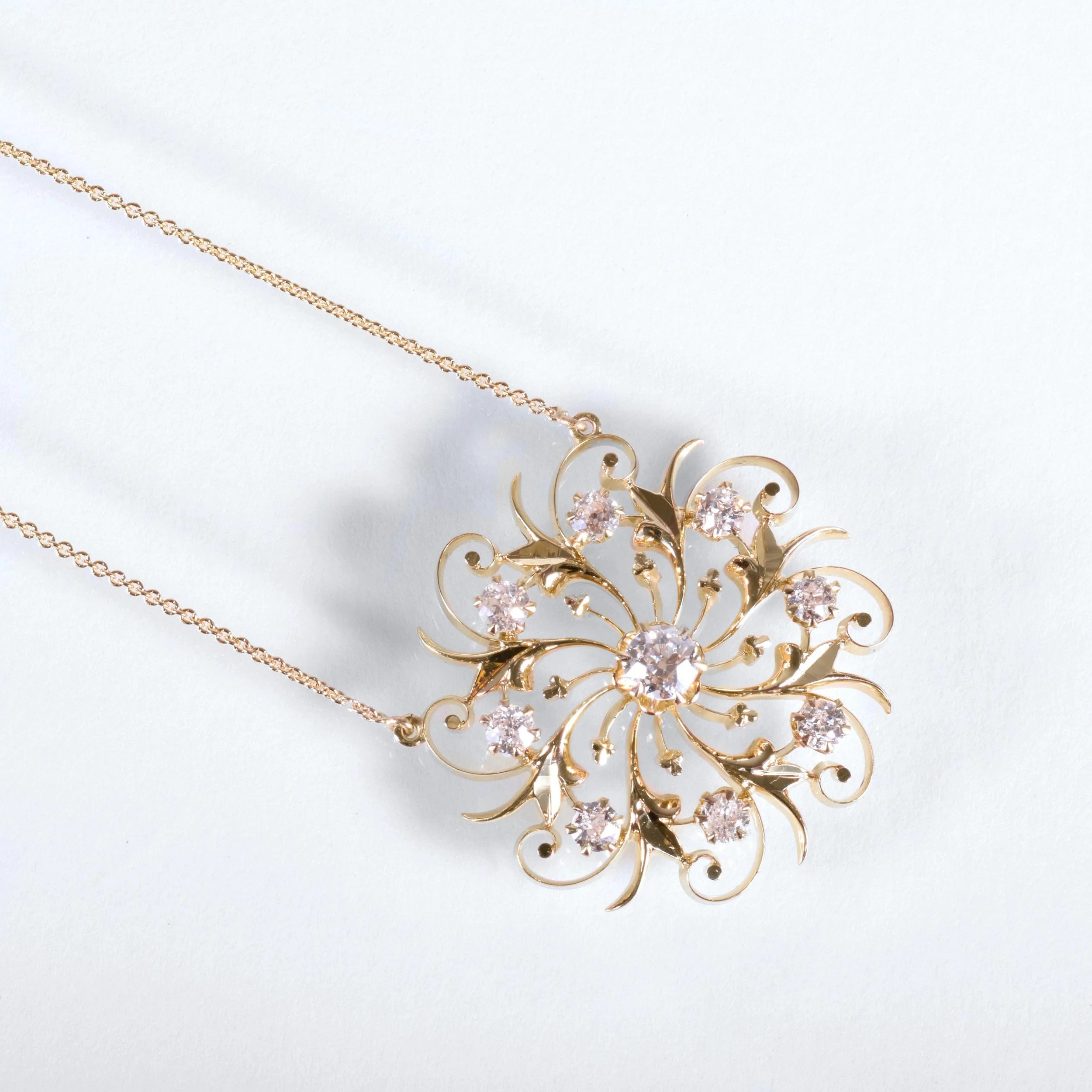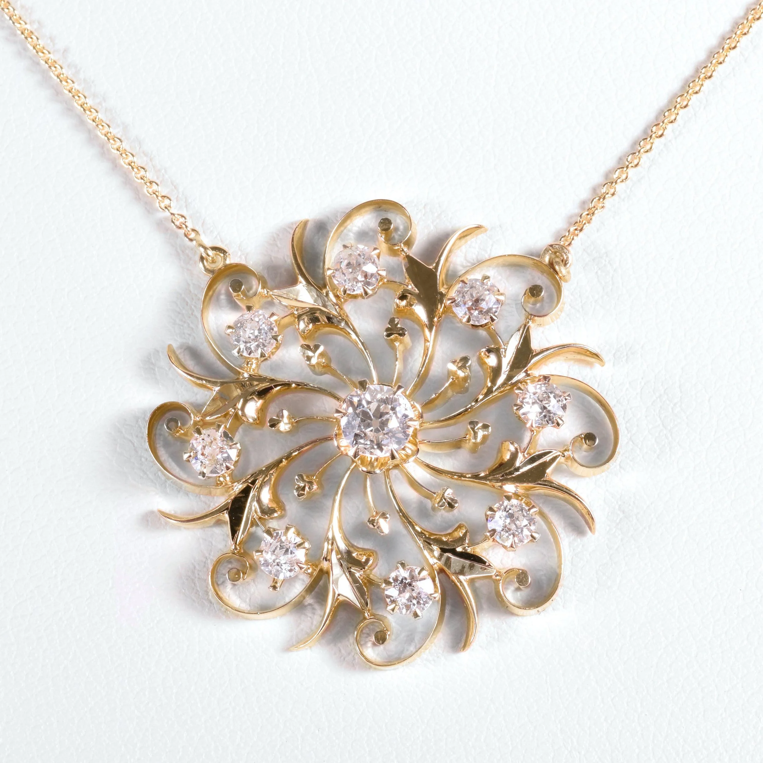 Here we have a gorgeous statement making antique starburst diamond pendant. This lovely necklace is made of 14k yellow gold with nine dreamy European cut diamonds. Originally this alluring piece was an antique brooch and was converted to a fetching necklace. The starburst design was popular during the Victorian era in mid to late 1800's and early in the 20th century. Reminiscent of a floral motif starburst design, it is an exquisite and captivating treasure to add to your collection.