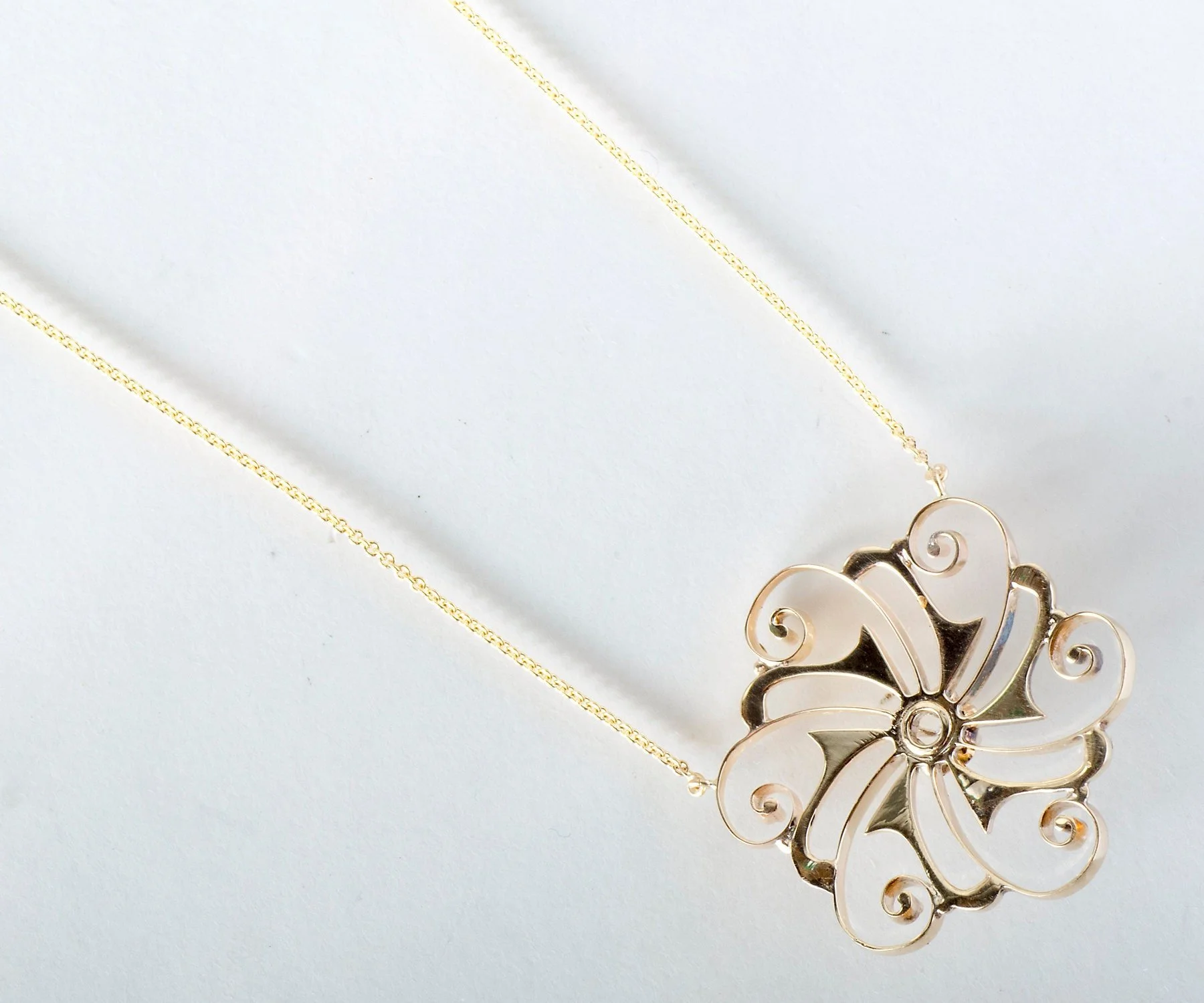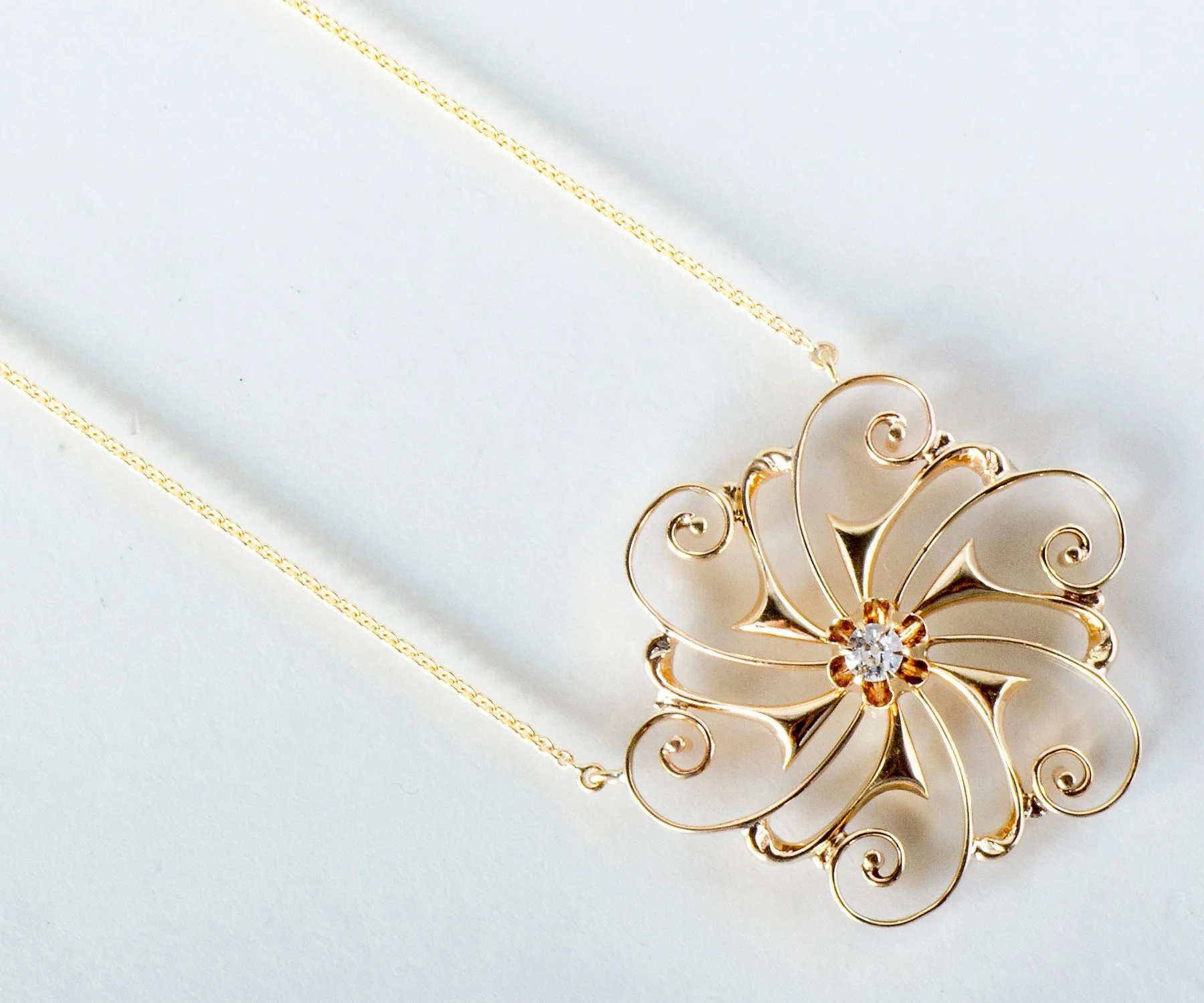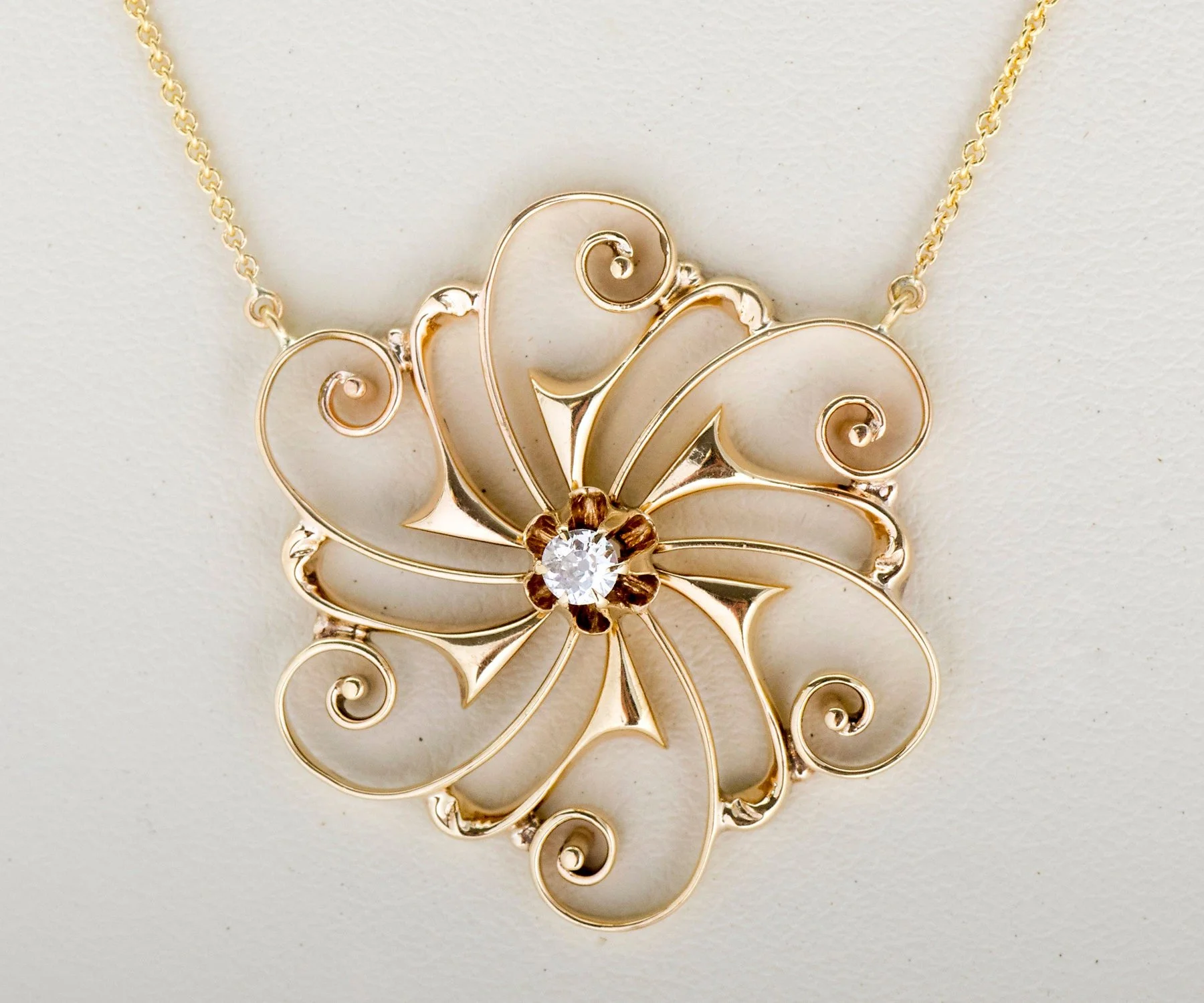 What a sweet and charming antique diamond necklace! Enjoy for your special day (your something old!) and everyday thereafter. This unique necklace will go with everything in your wardrobe. Originally this ring was a brooch and we converted it to the necklace you see here today. Created in 14k yellow gold, dangling from a new chain and holding a lovely European cut diamond within a buttercup setting at the center.