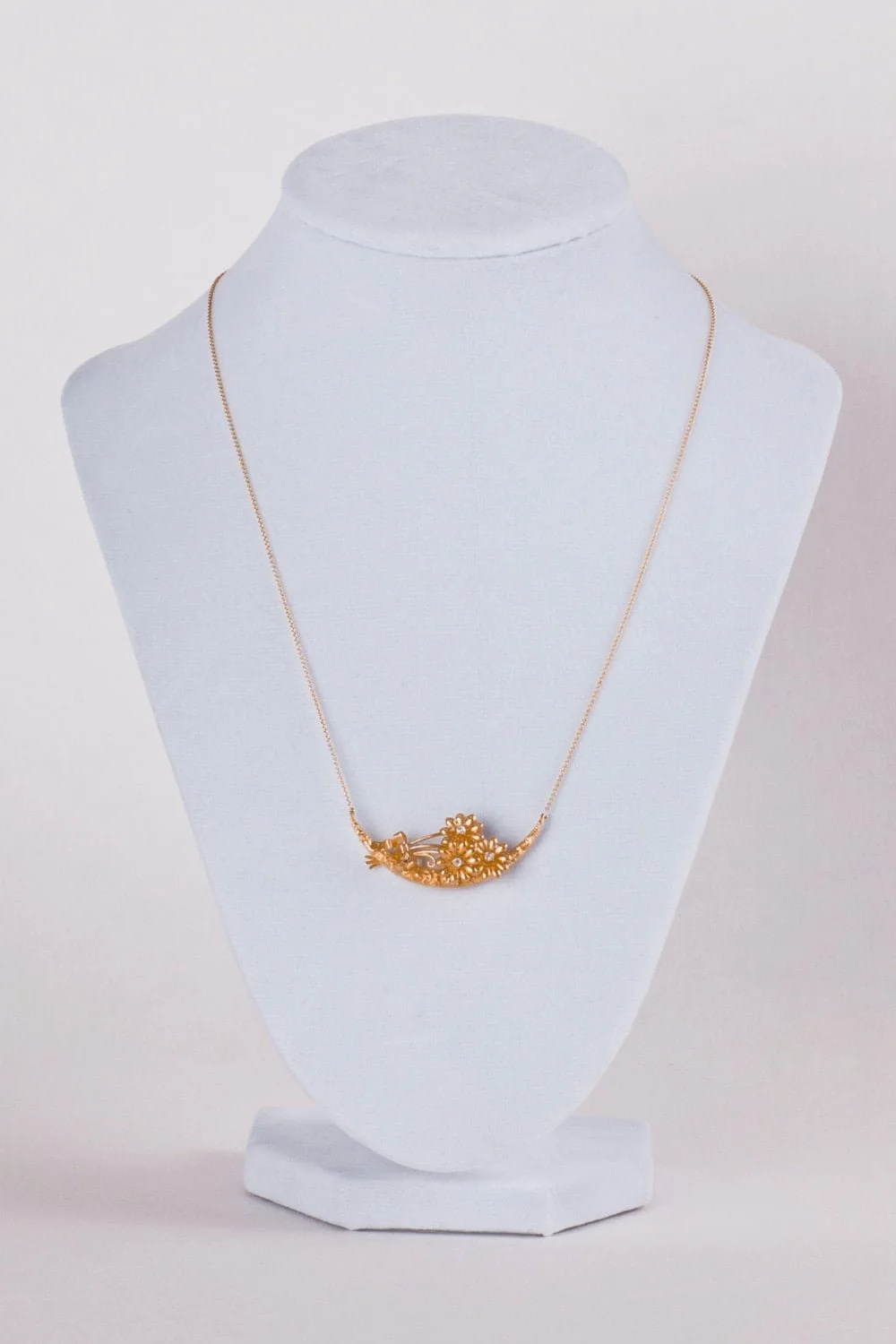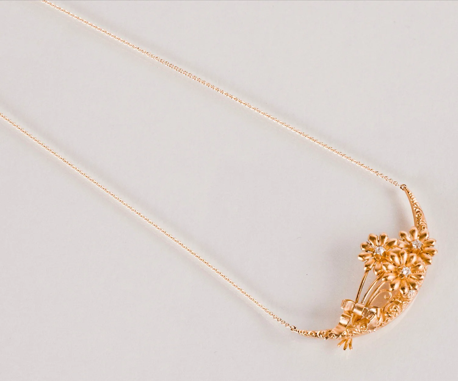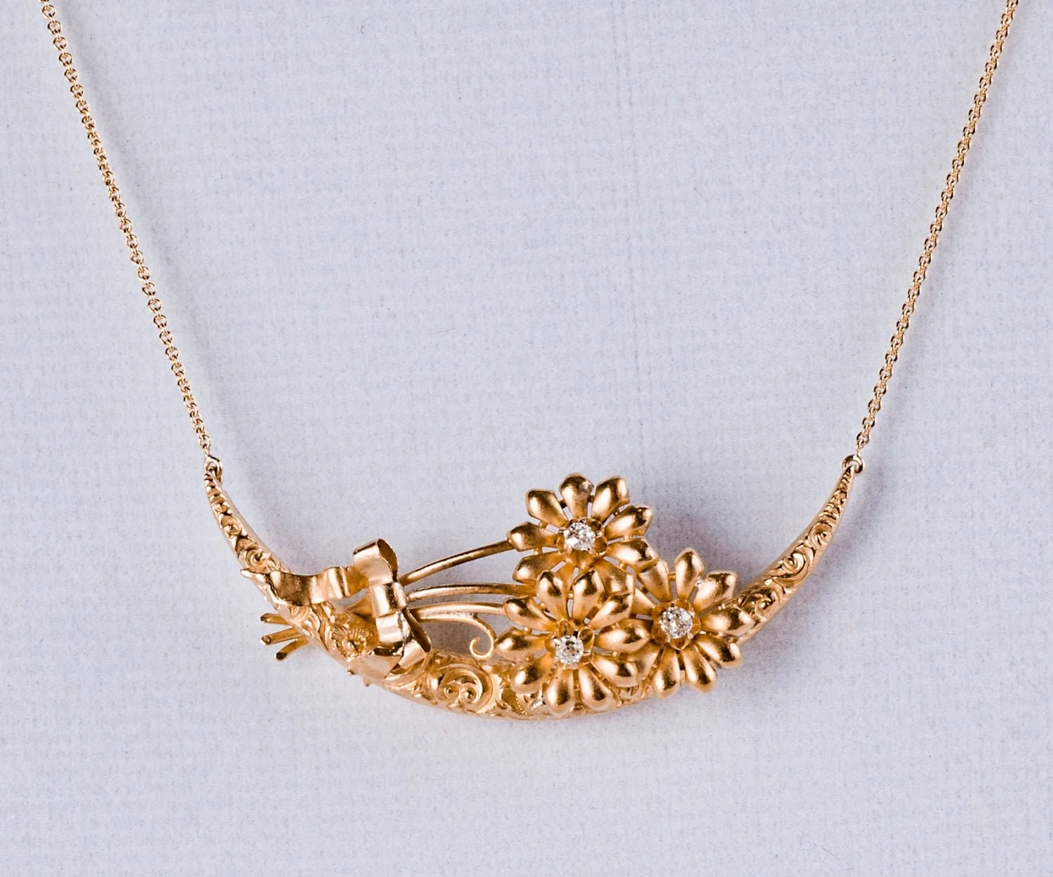 This gorgeous diamond daisy bouquet is tied with a delicate ribbon bow in all 14k yellow gold. This early 1900s piece was originally a pin that we recently converted to a one-of-a-kind necklace. We think this beauty would serve perfect as a wedding gift for a bride to wear on her wedding day.