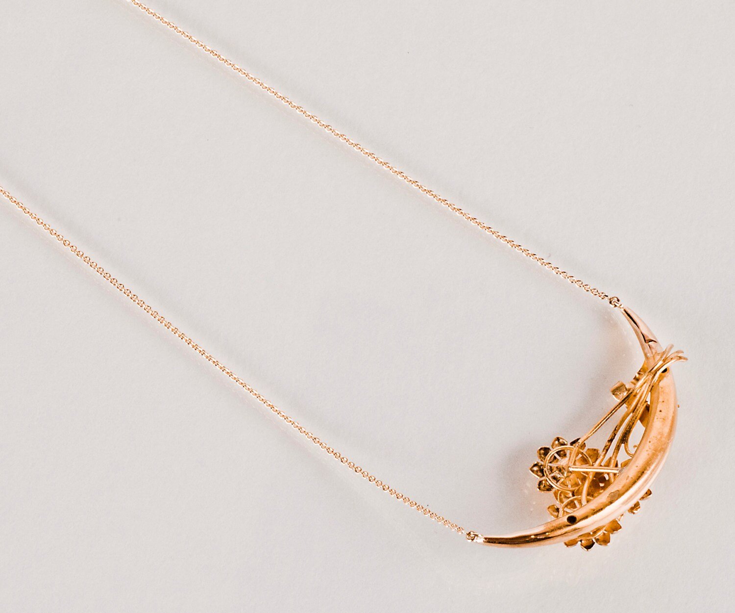 Antique Necklace - Antique 14k Yellow Gold Diamond Flower Bouquet Necklace 14k Yellow Gold Early 1900s 3 European Cut Diamonds =.05ct New 14k Yellow Gold Chain Length of necklace measures 18" Length of center flower section measures 1-5/8"