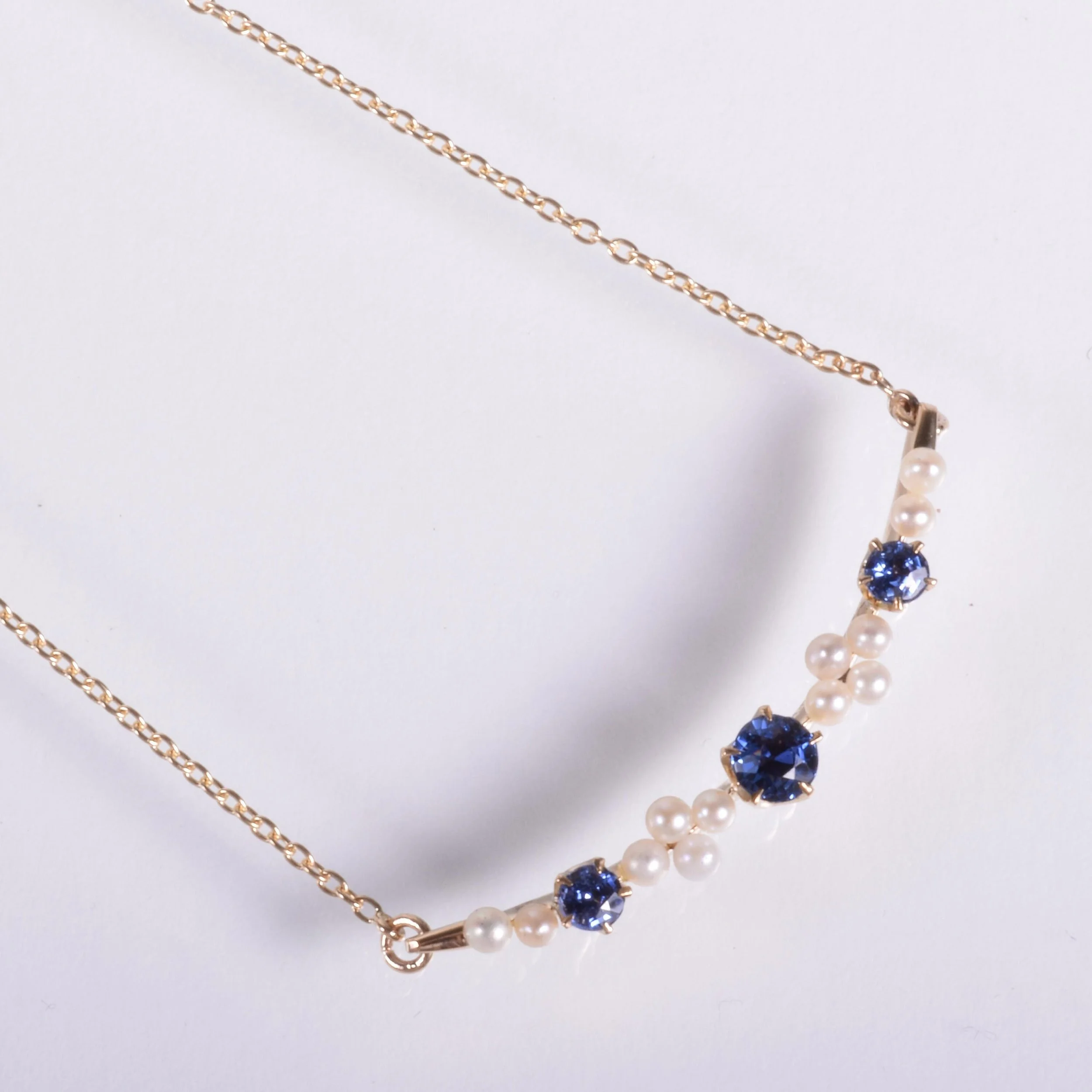 Crescent shaped brooches are so alluring. We turned this one from the 1920's into the necklace you see here today. Filled with gorgeous blue sapphires and heavenly seed pearls and set in bright 14k yellow gold. Wear this antique dream piece on the daily with either jeans, work clothes or evening wear. It WILL be noticed!