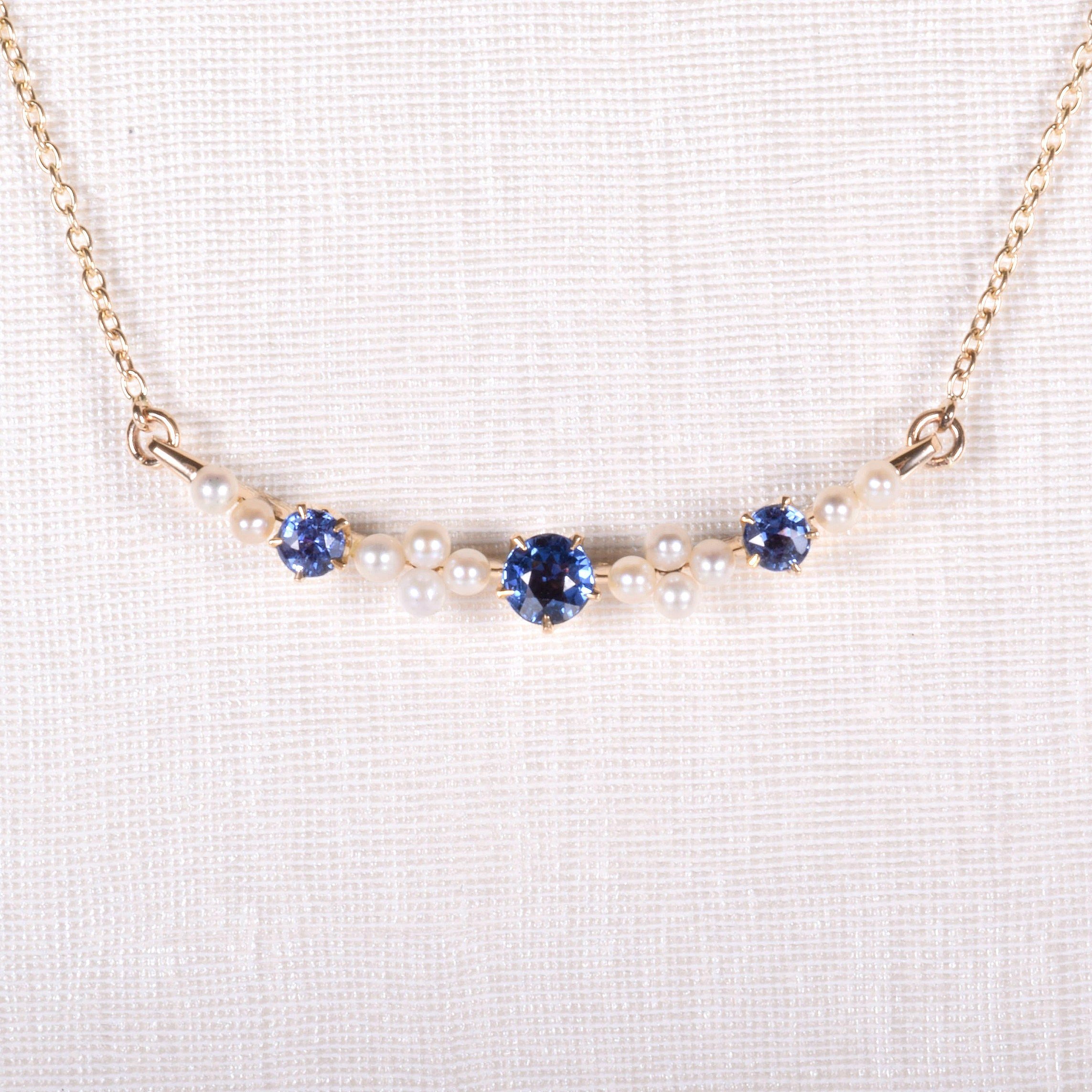 Crescent shaped brooches are so alluring. We turned this one from the 1920's into the necklace you see here today. Filled with gorgeous blue sapphires and heavenly seed pearls and set in bright 14k yellow gold. Wear this antique dream piece on the daily with either jeans, work clothes or evening wear. It WILL be noticed!