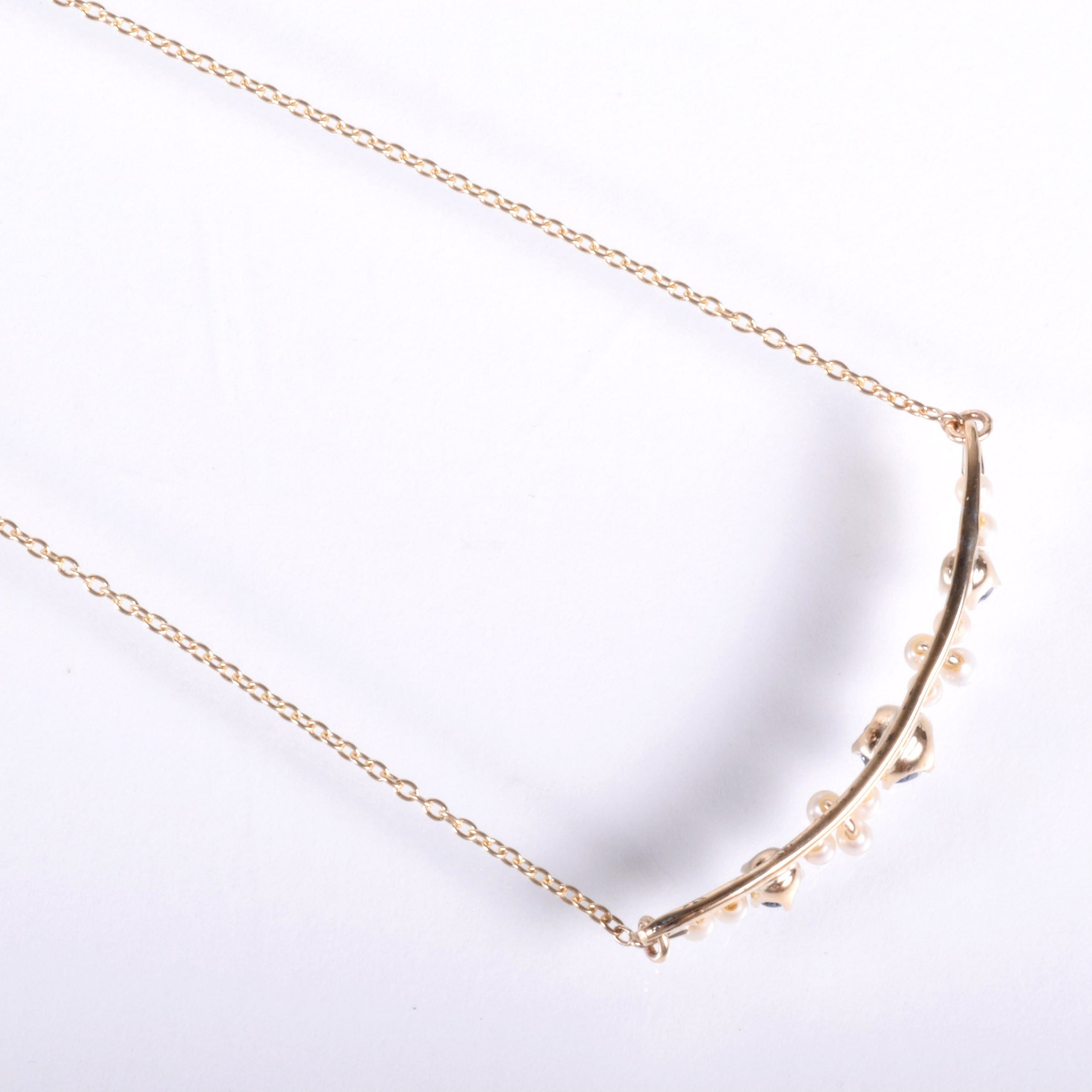 Antique Necklace - Antique 14k Yellow Gold Pearl & Sapphire Crescent Conversion Necklace Circa 1920's 14k Yellow Gold Seed Pearls Blue Sapphires Pendant measures approximately 1 3/8" long and 3/8" wide Entire length of necklace is 18.5" with a jump ring at 17.5"