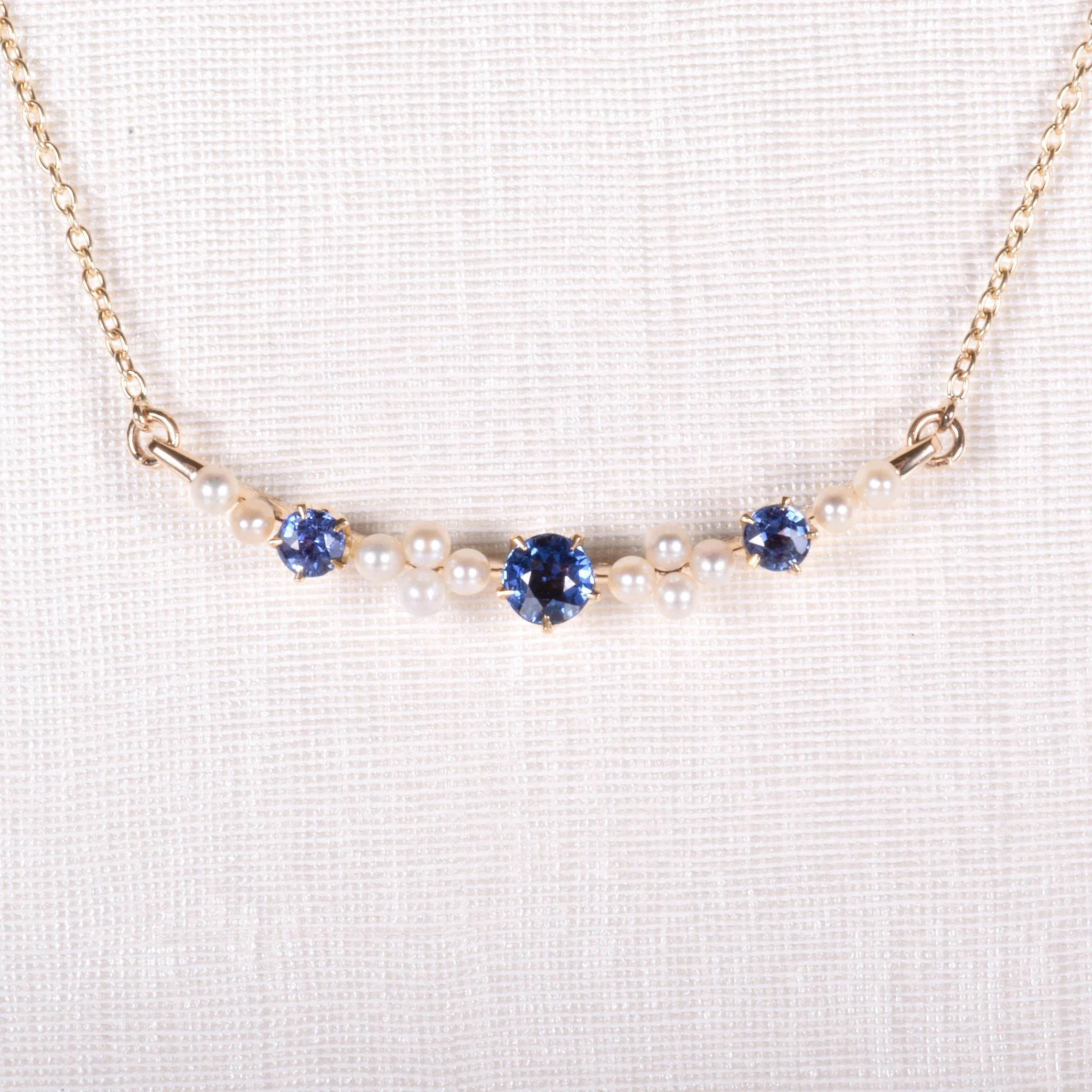 Crescent shaped brooches are so alluring. We turned this one from the 1920's into the necklace you see here today. Filled with gorgeous blue sapphires and heavenly seed pearls and set in bright 14k yellow gold. Wear this antique dream piece on the daily with either jeans, work clothes or evening wear. It WILL be noticed!