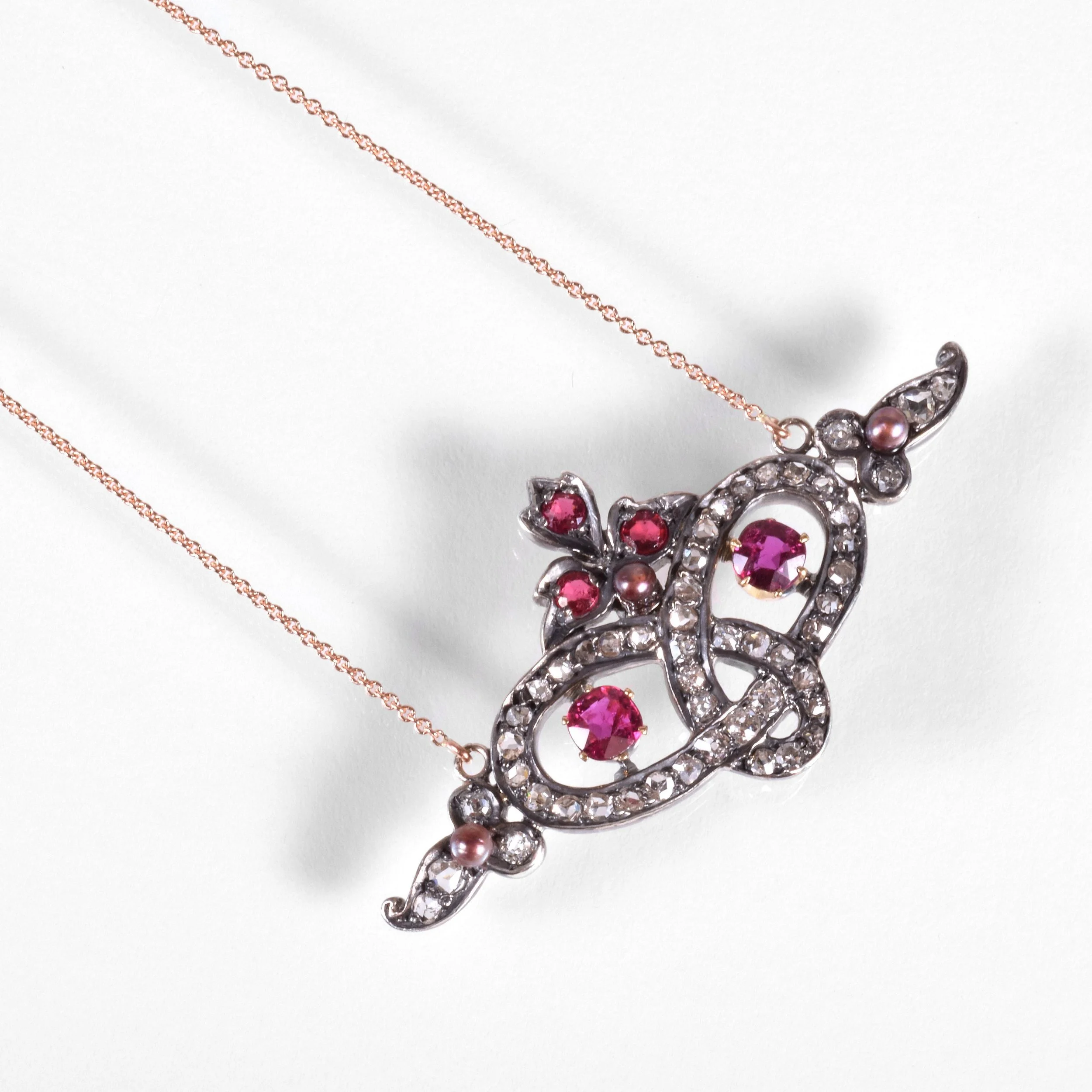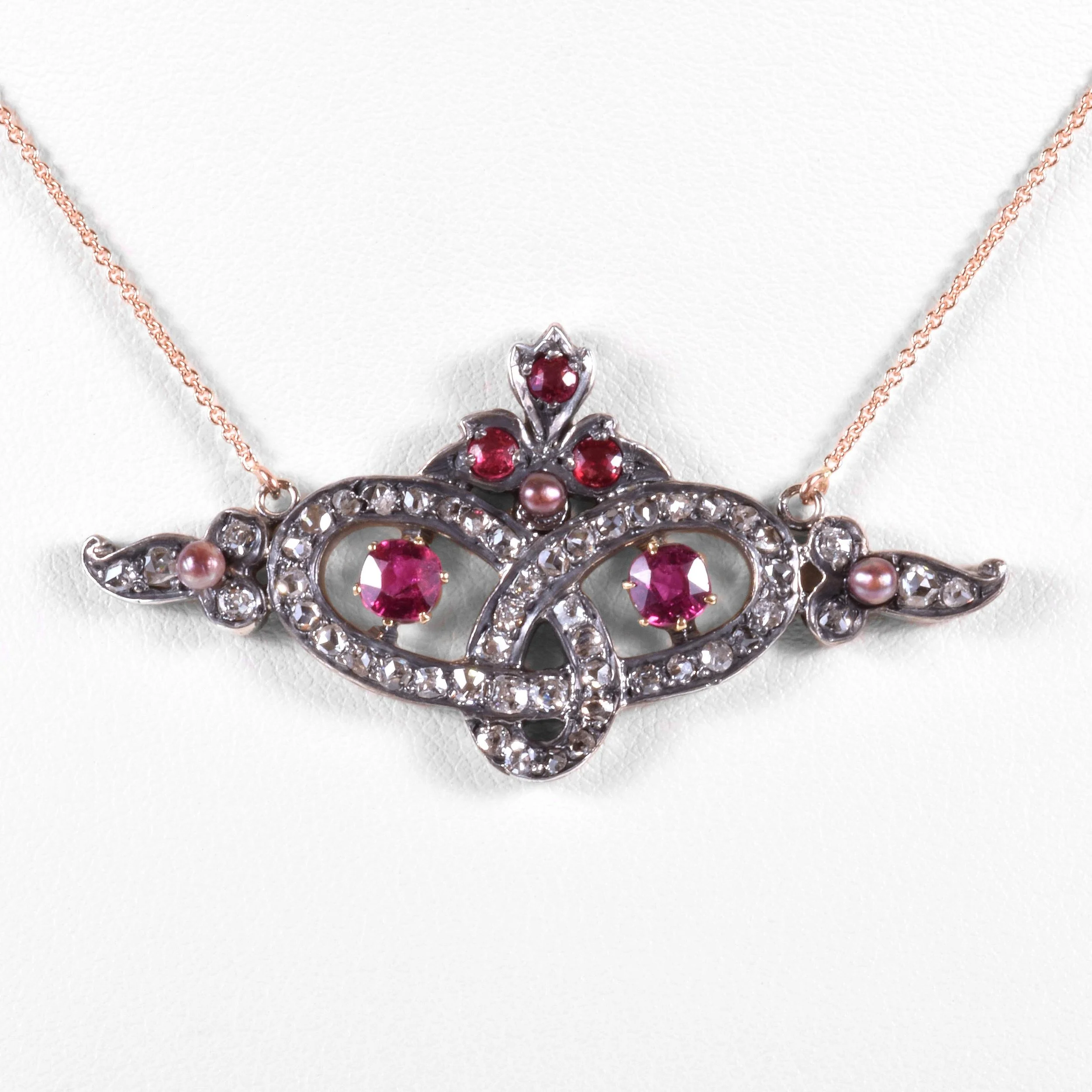 Antique Necklace - Antique 14k Yellow & Rose Gold Sterling Silver Georgian Diamond, Ruby and Natural Seed Peal Conversion Necklace 14k Yellow & Rose Gold Sterling Silver 49 Mine Cut Diamonds =1cts 5 Red Rubys =.55cts 3 Natural Seed Pearls Pendant measures approximately 7/8" tall and 1.75" wide New 14k rose gold chain measures 21" long with an adjustable jump ring at 19"