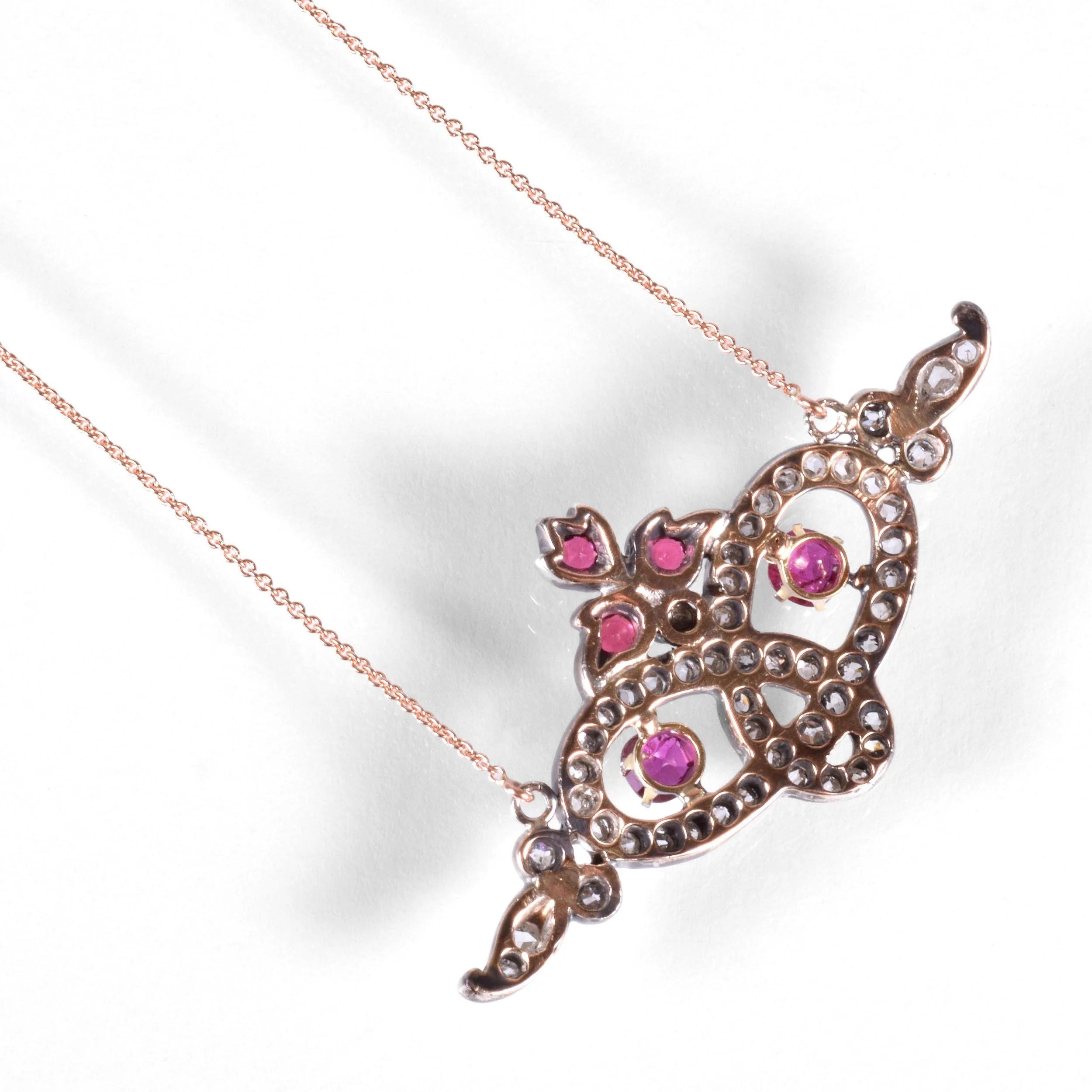 Antique Necklace - Antique 14k Yellow & Rose Gold Sterling Silver Georgian Diamond, Ruby and Natural Seed Peal Conversion Necklace 14k Yellow & Rose Gold Sterling Silver 49 Mine Cut Diamonds =1cts 5 Red Rubys =.55cts 3 Natural Seed Pearls Pendant measures approximately 7/8" tall and 1.75" wide New 14k rose gold chain measures 21" long with an adjustable jump ring at 19"