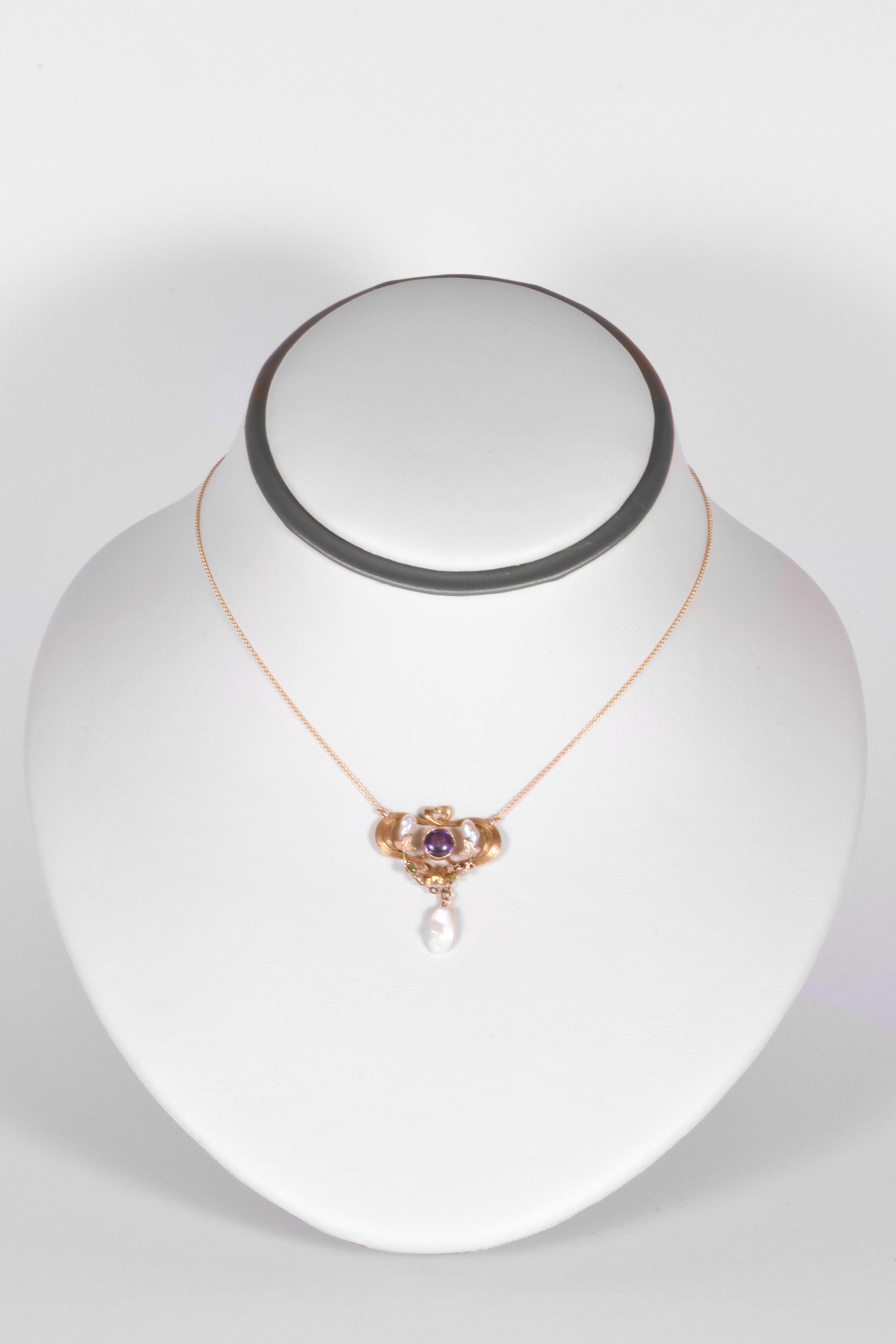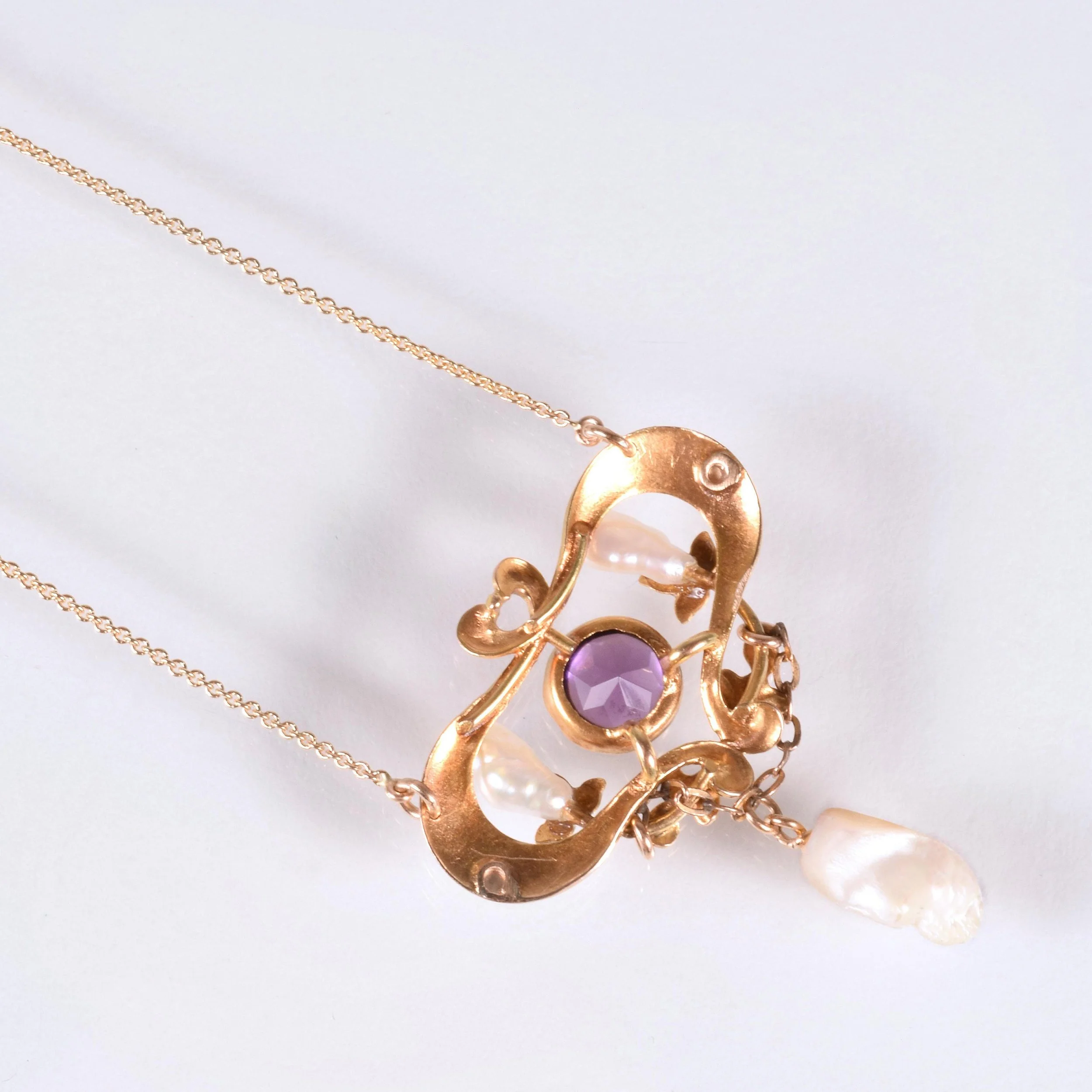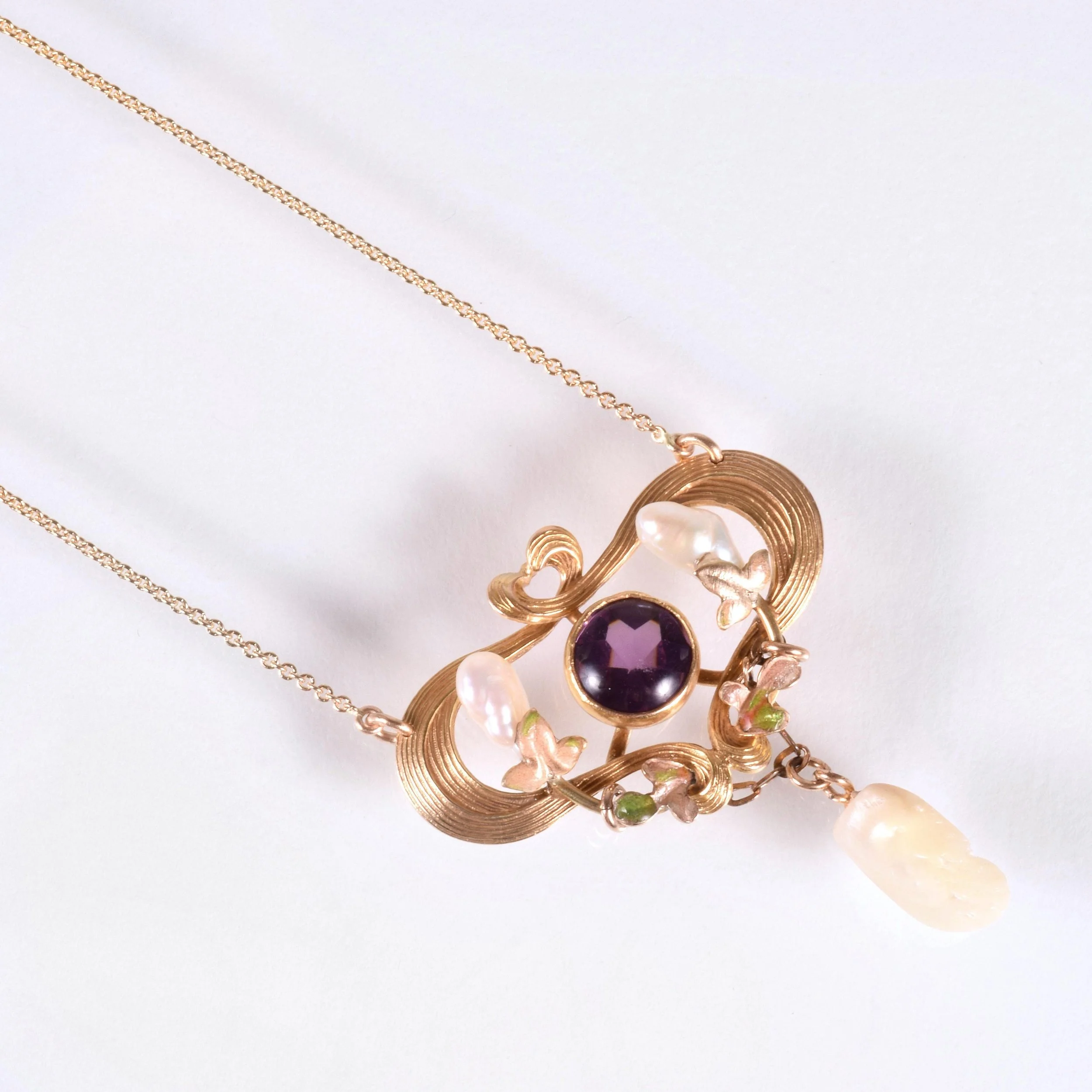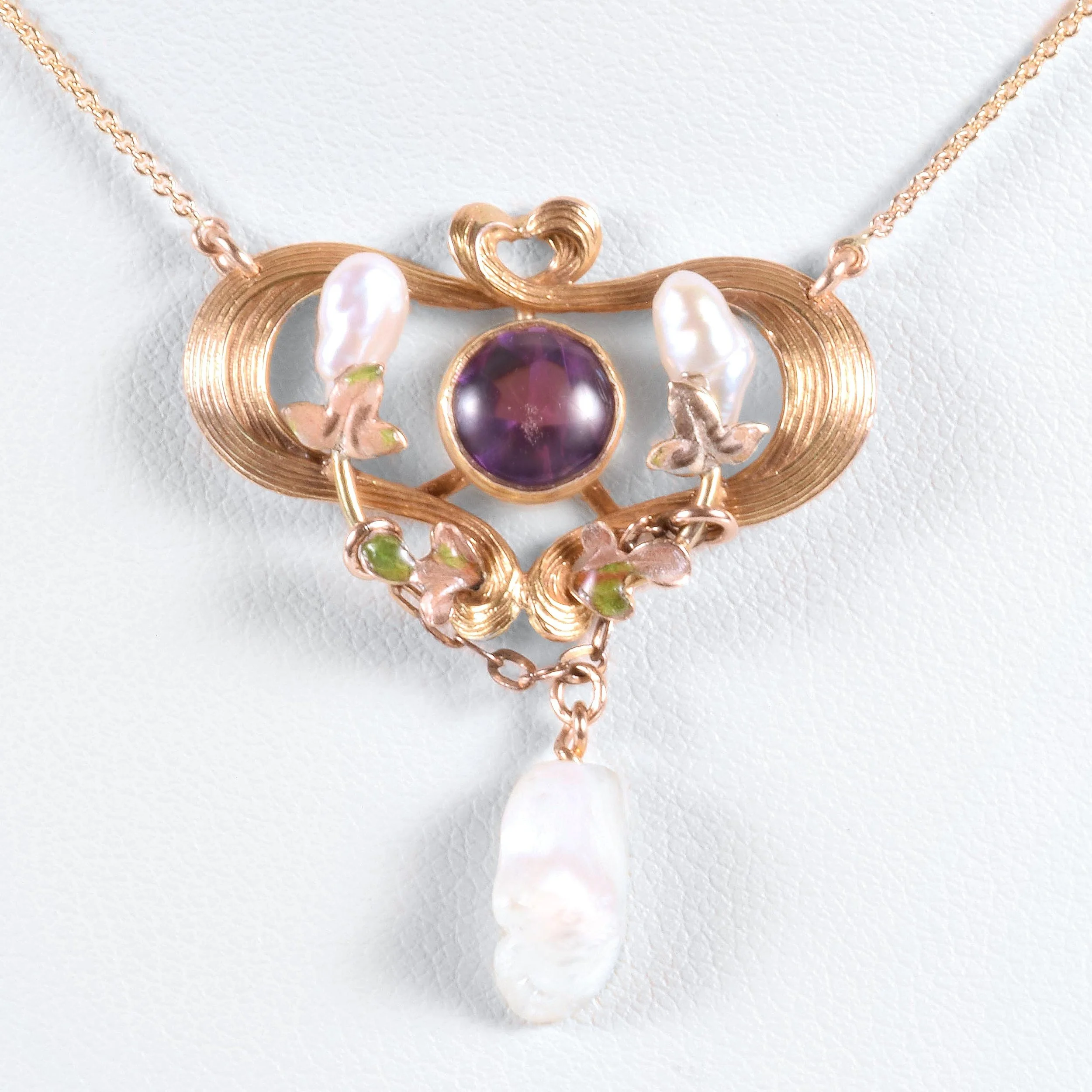 Antique Necklace - Antique 14k Yellow & Rose Gold Victorian Enamel Amethyst and Fresh Water Pearl Conversion Necklace 14k Yellow & Rose Gold Amethyst & Fresh Water Pearls Pendant measures 1 3/8" tall and 1" wide New 14k yellow gold chain measures 21" long with an adjustable jump ring at 19"