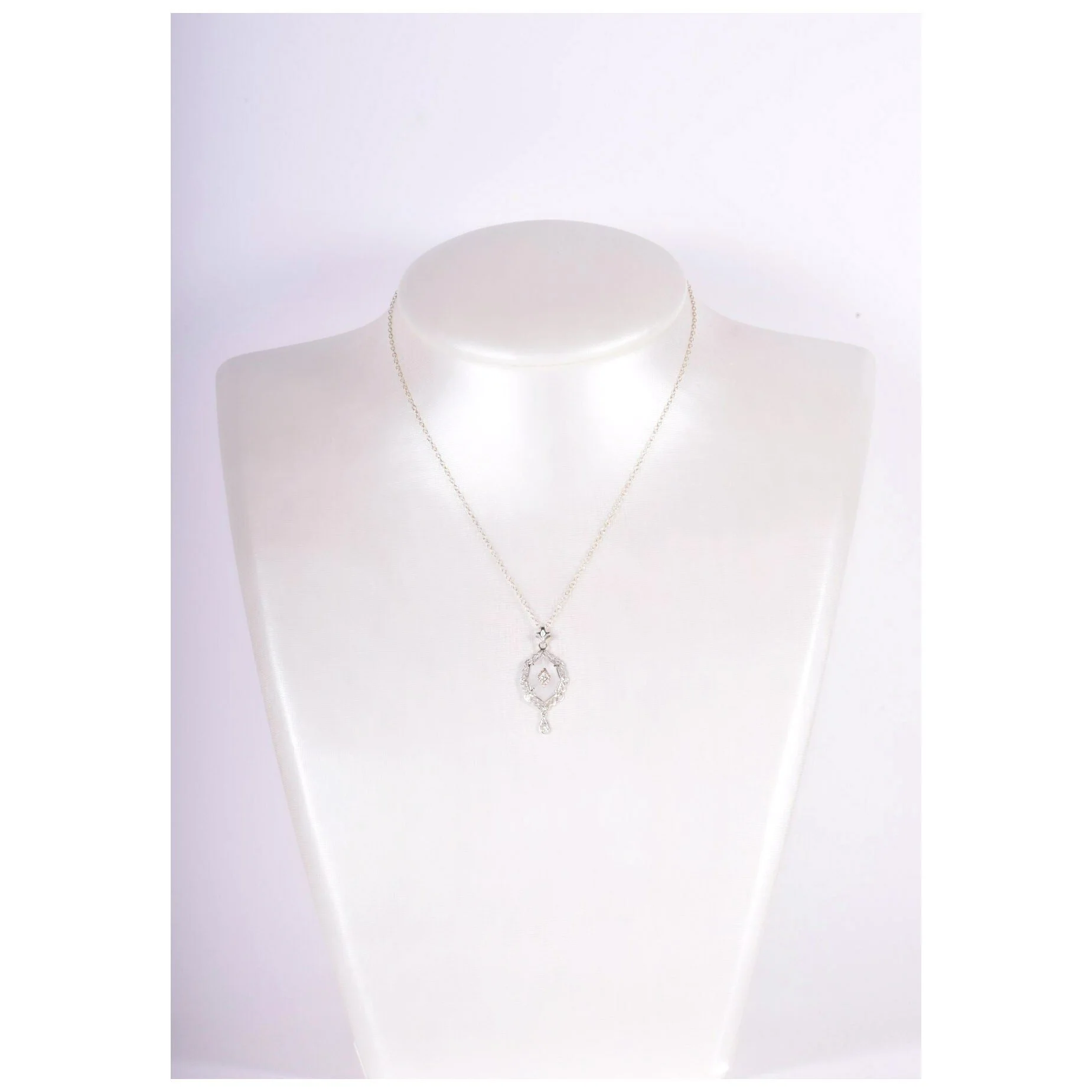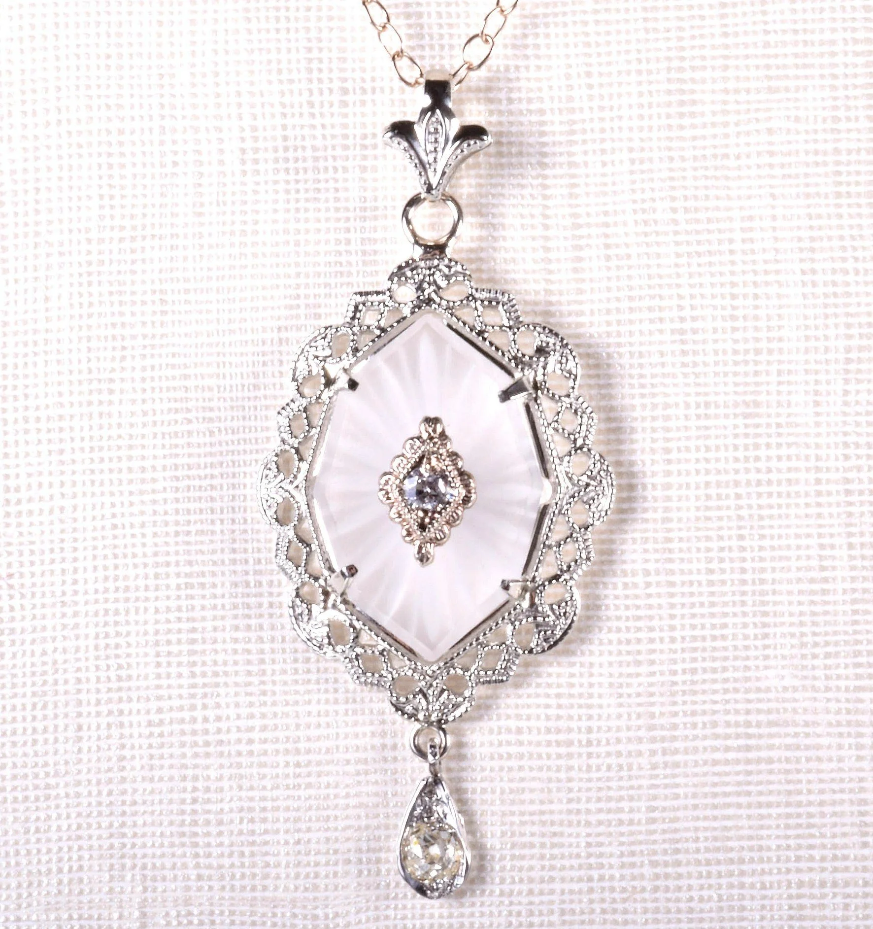 Antique Necklace - Antique 1920's 14k White Gold Crystal & Diamond Filigree Pendant Circa 1920's 14k White Gold Frosted Crystal (1) European Cut & (1) Mine Cut Diamond = approx. .13ctw Pendant measures approximately 1 3/8" tall and 5/8" wide. Chain measures 16.5" long.