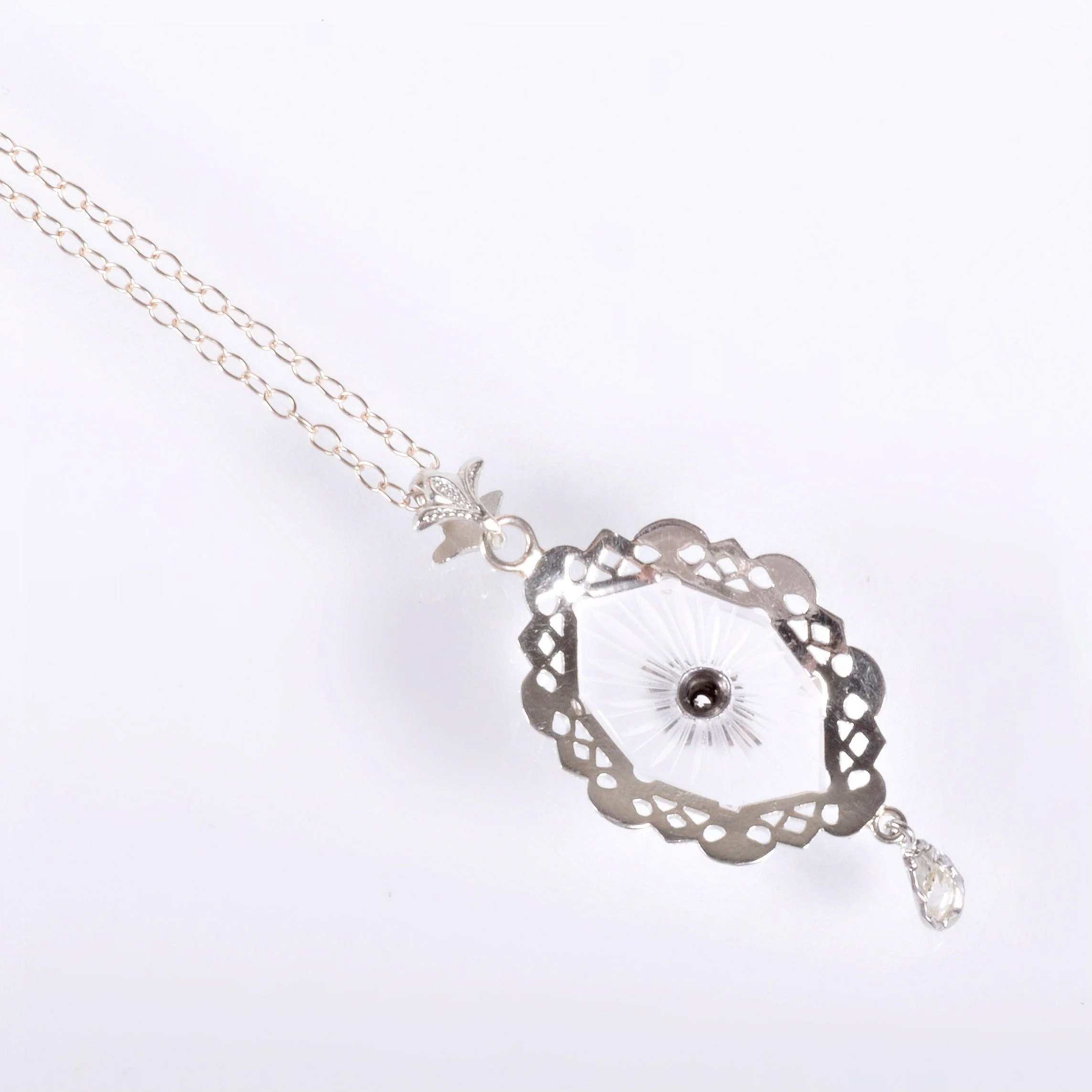 Antique Necklace - Antique 1920's 14k White Gold Crystal & Diamond Filigree Pendant