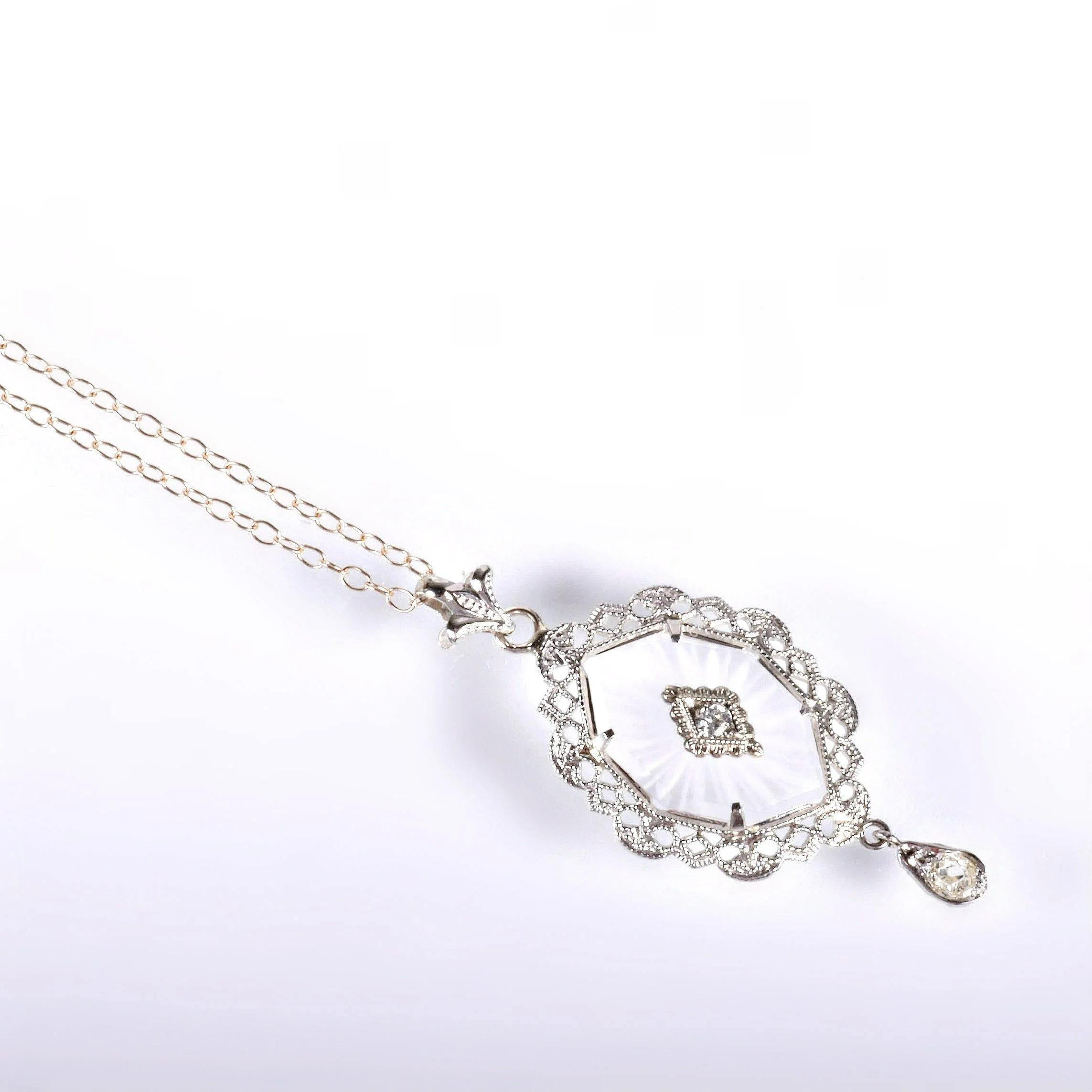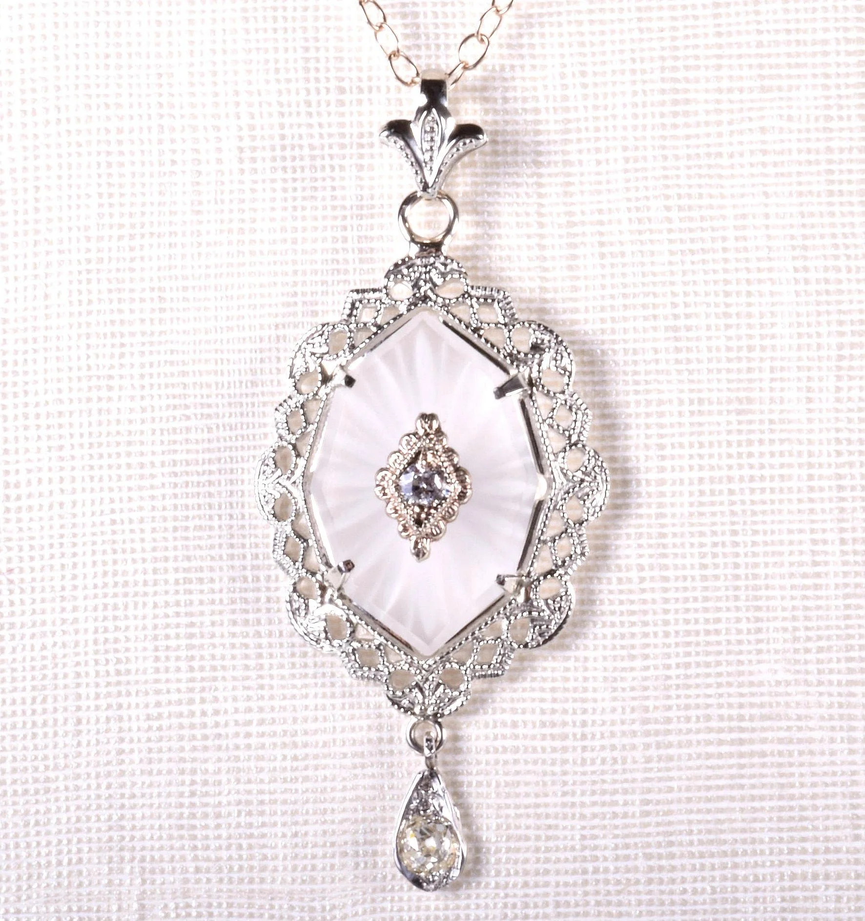 Antique Necklace - Antique 1920's 14k White Gold Crystal & Diamond Filigree Pendant
