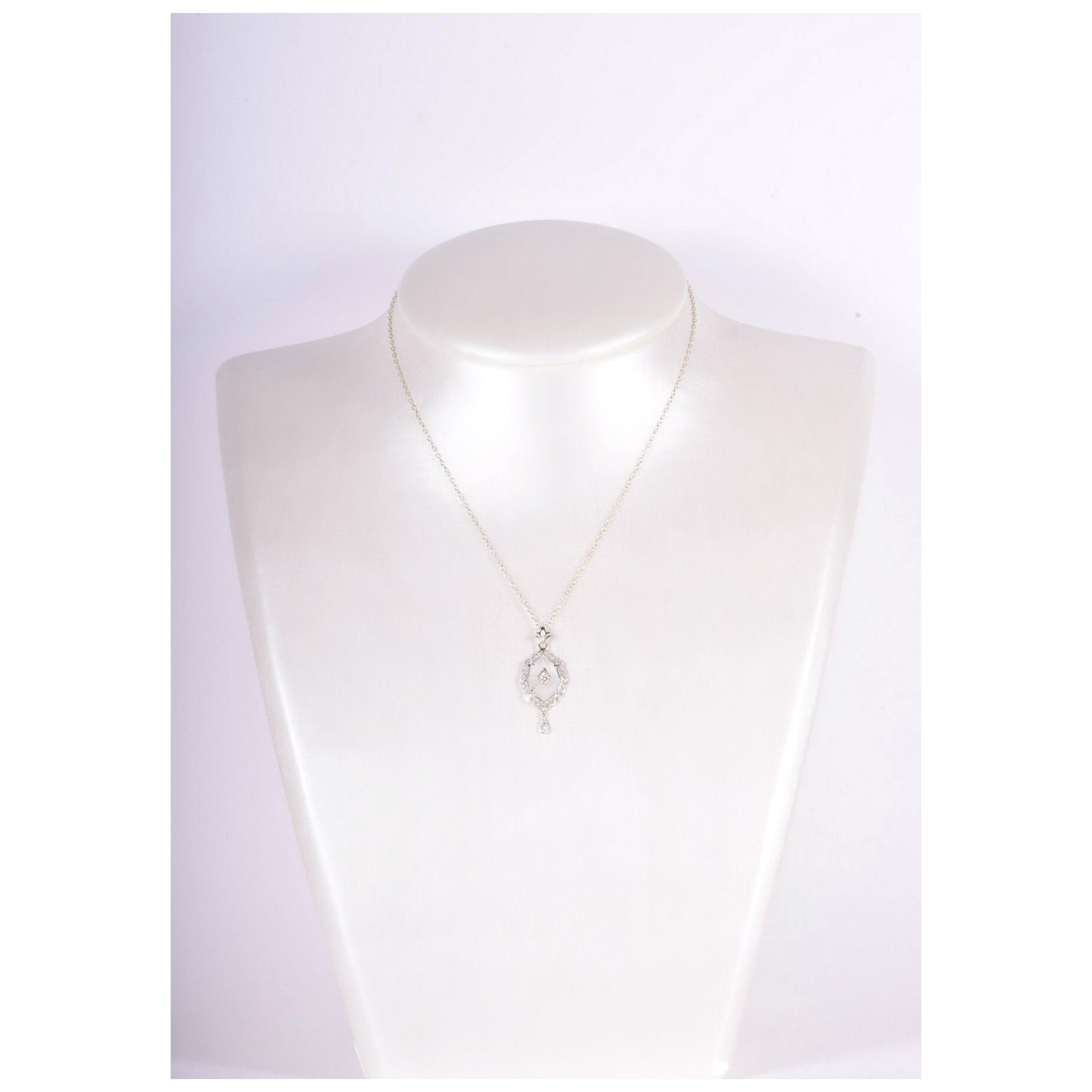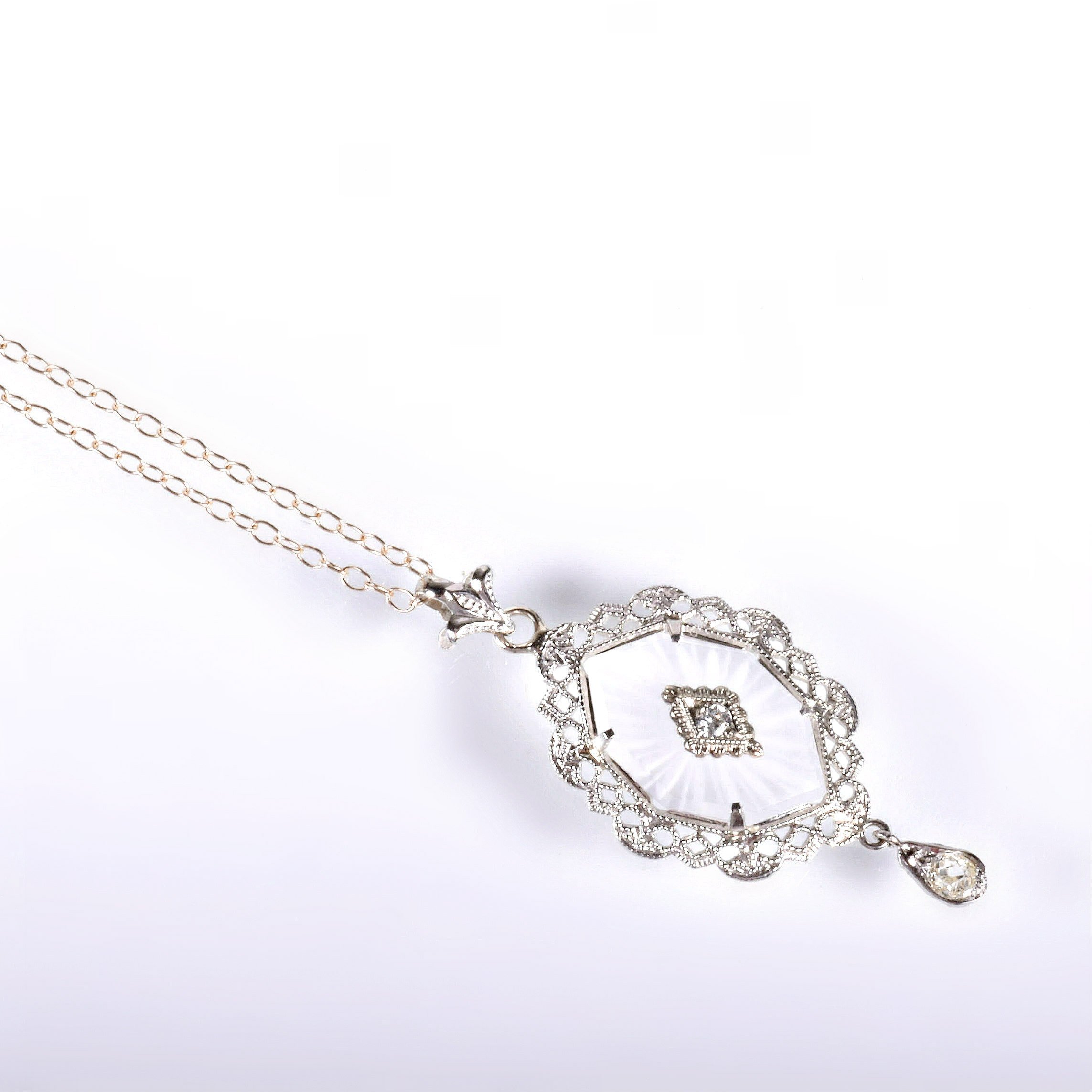 Antique Necklace - Antique 1920's 14k White Gold Crystal & Diamond Filigree Pendant Circa 1920's 14k White Gold Frosted Crystal (1) European Cut & (1) Mine Cut Diamond = approx. .13ctw Pendant measures approximately 1 3/8" tall and 5/8" wide. Chain measures 16.5" long.