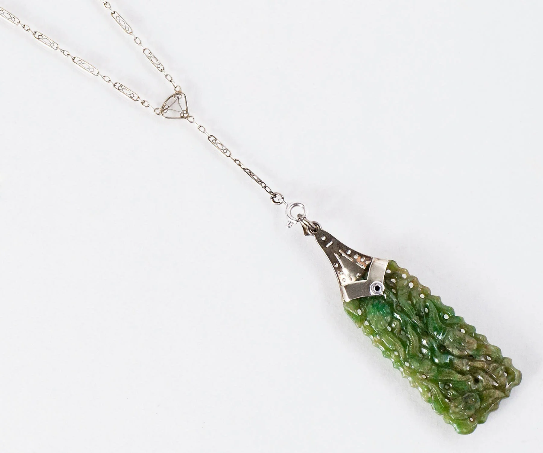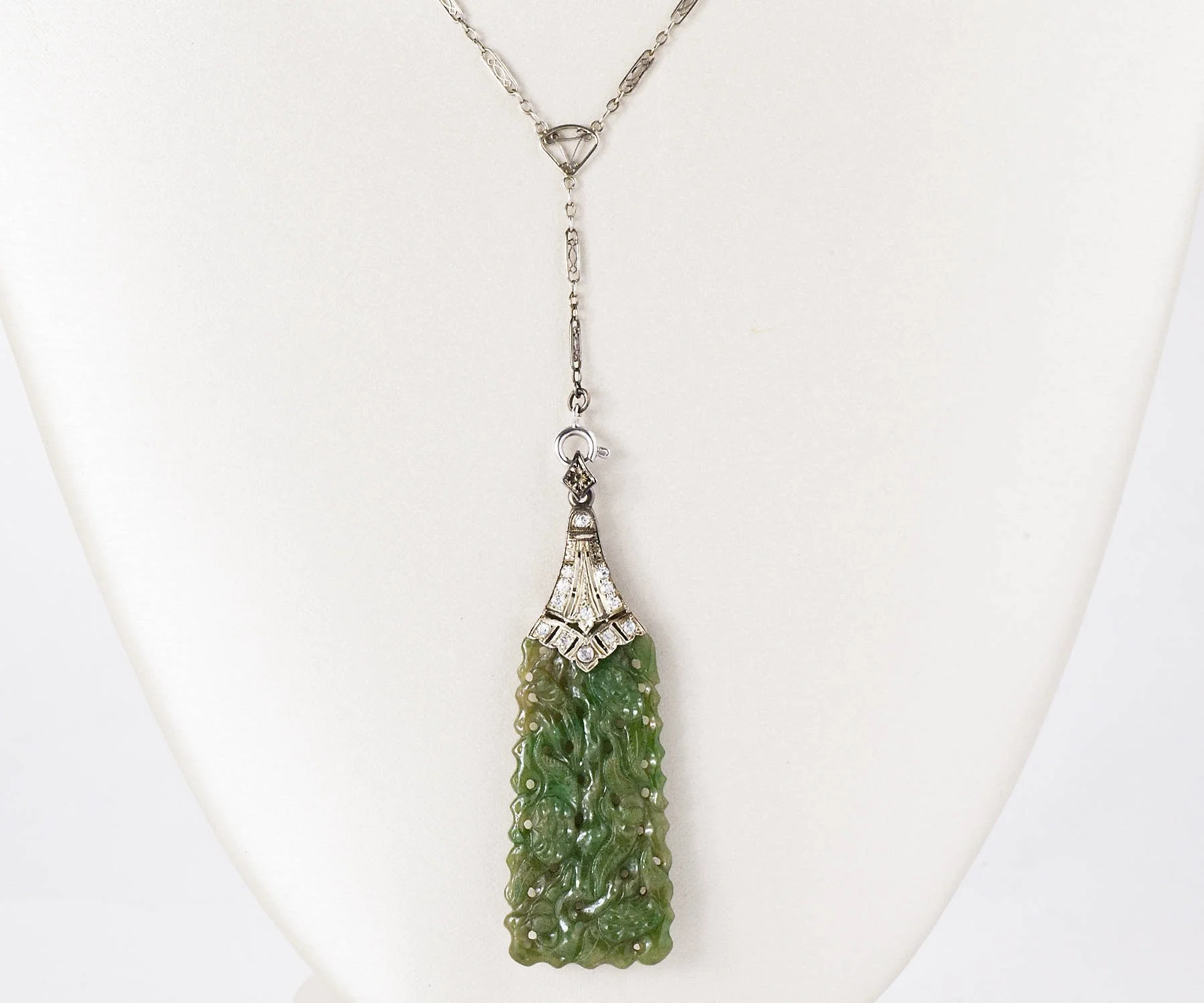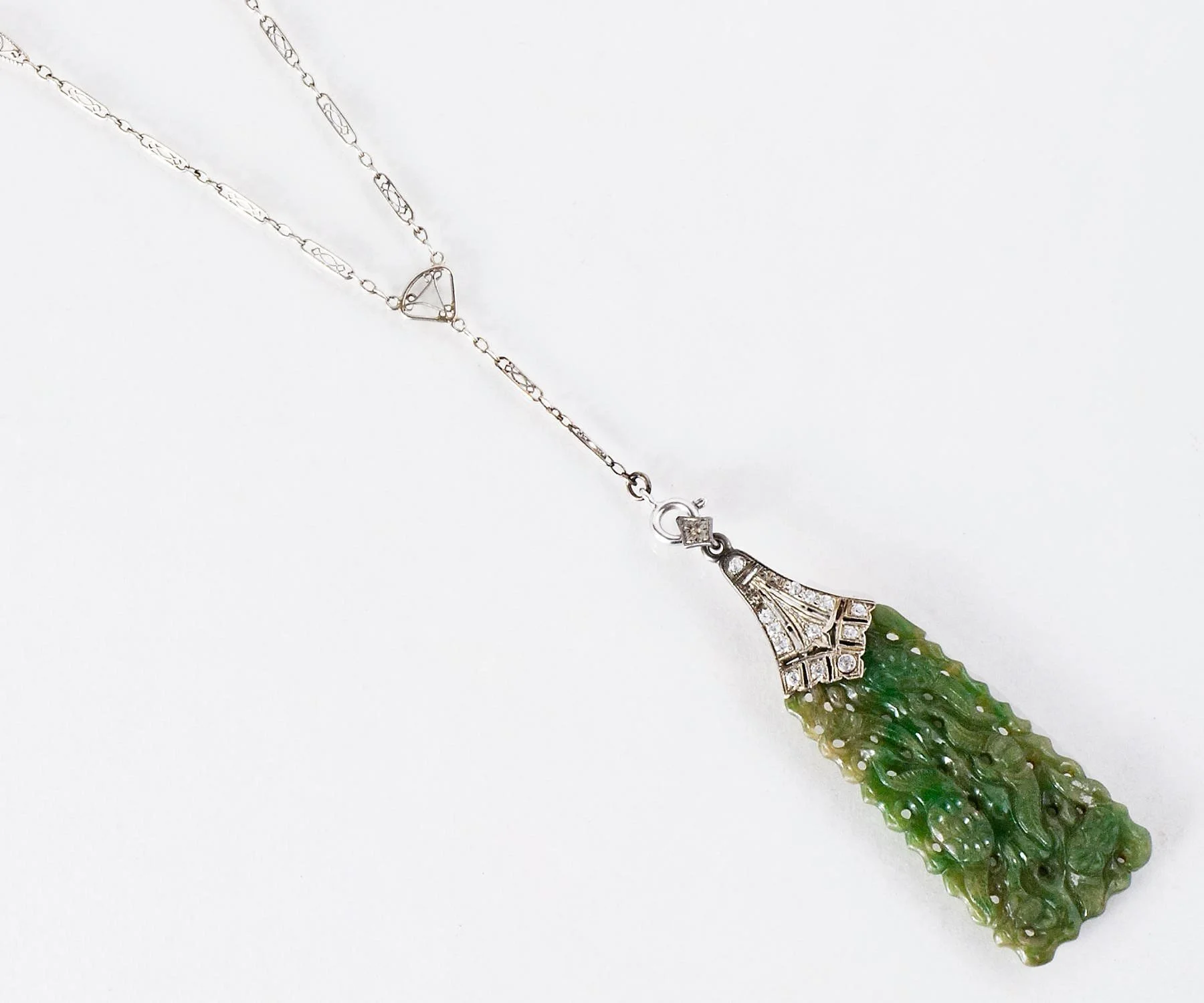 Antique Necklace - Antique Art Deco Carved Green Jadeite and Diamond Necklace