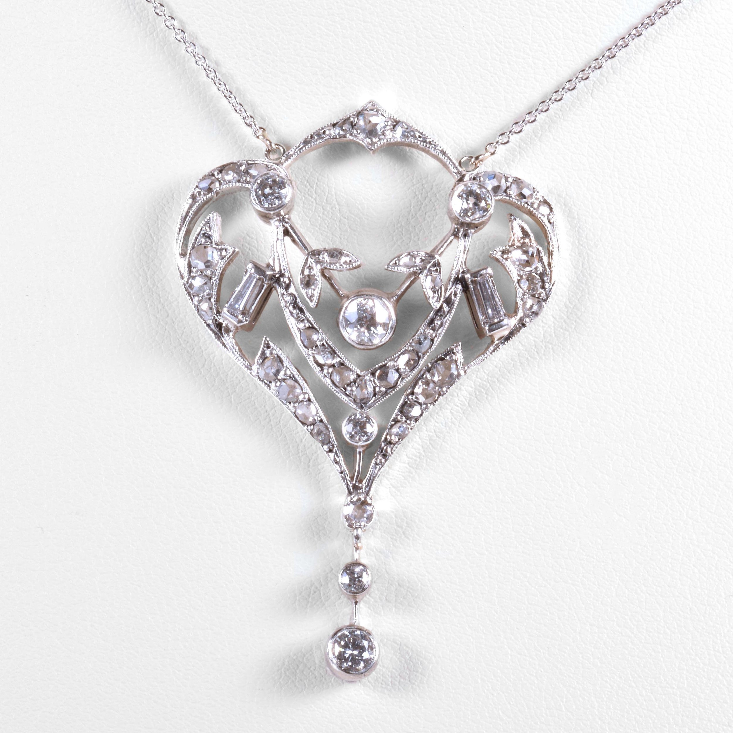 Antique Necklace - Antique Art Nouveau 14k White Gold Diamond Conversion Necklace 14k White Gold 36 Rose Cut Diamonds 6 Old European Cut Diamonds 2 Baguette Cut Diamonds All Diamonds =1.30cts SI1-I1/G-K Pendant measures approximately 1 7/8" tall and 1.25" wide New 14k white gold chain measures 18 1/2" long with an adjustable jump ring at 16 1/2"