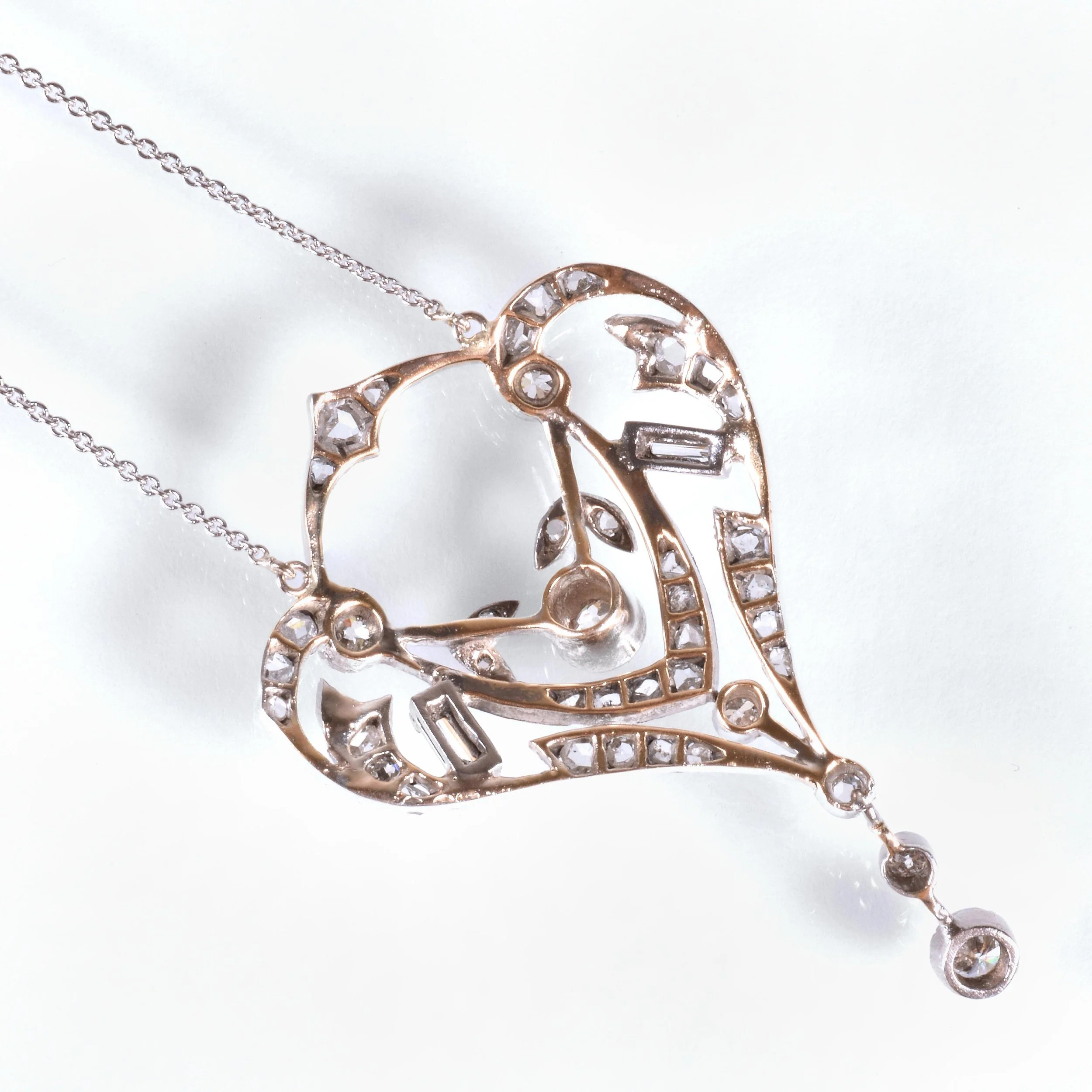 This is a striking piece coming to you from the Art Nouveau jewelry design era. A stunning, graceful statement will be made when you wear this ravishing pendant around your neck. Delicate lines, open-work and curves define this antique treasure along with adorning European rose-cut and baguette diamonds. Crafted in 14 karat white gold. This one is very special indeed and will be the talk of the town! The multi-shaped diamonds are both prong & bezel set with fine milgrain finishing and dangling shimmering diamonds adding to the femininity of this necklace.