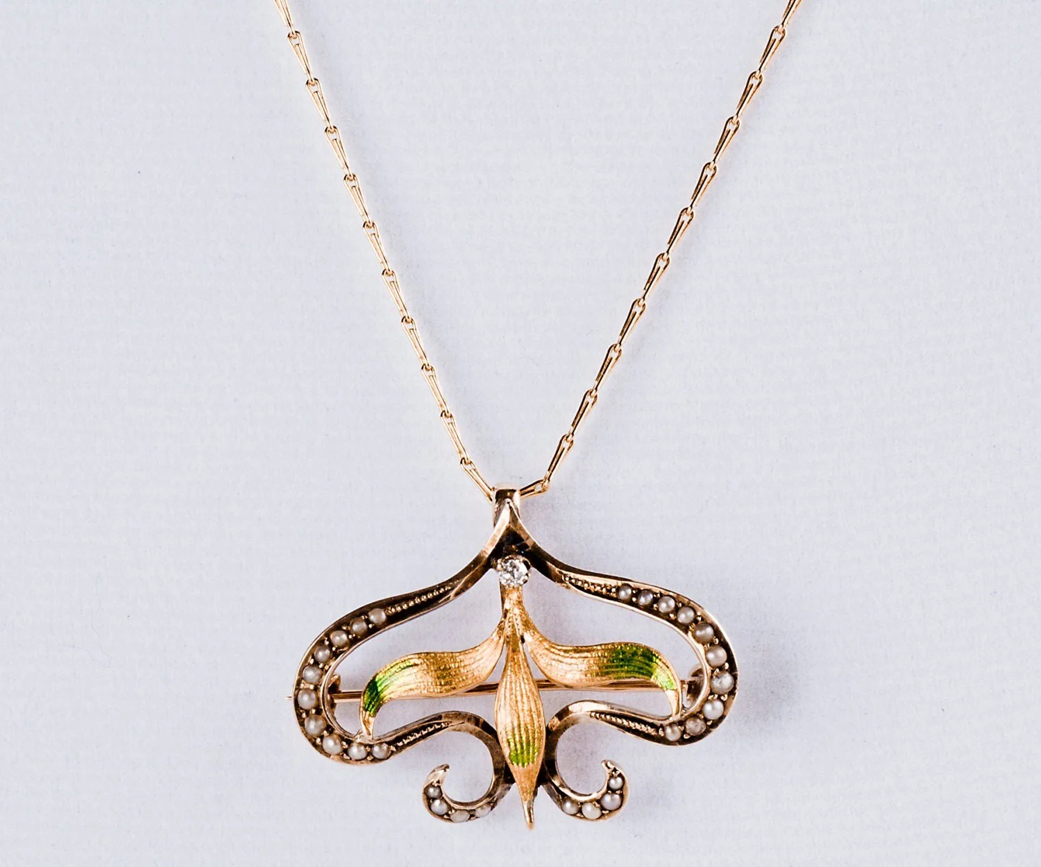 This lovely Art Nouveau pendant was once a well loved brooch and has been converted to a pendant for today's easy wear. Beautifully feminine with free flowing lines, any woman would appreciate it's colorful design. Shimmering enamel work in green, yellow and orange hues is displayed within an alluring frame of natural seed pearls and topped off with a mine cut diamond.