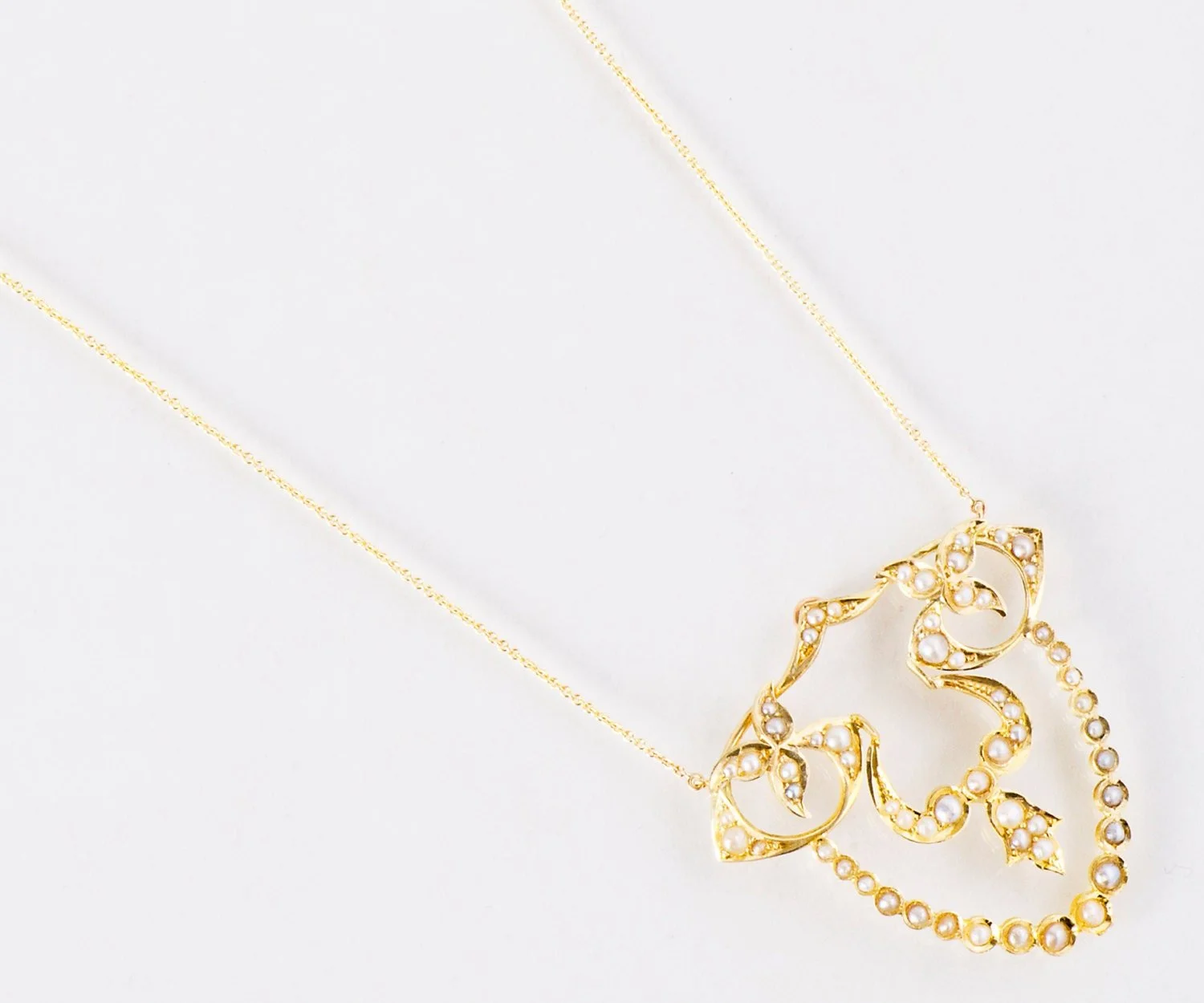 Originally an beaming yellow gold brooch from the 1890's, this piece has been converted in our shop along with so many other unique treasures to make them more wearable in today's world! We especially love the Art Nouveau pieces, with their flowing, curvy designs. This particular pendant is filled with shimmering natural seed pearls in varying sizes.