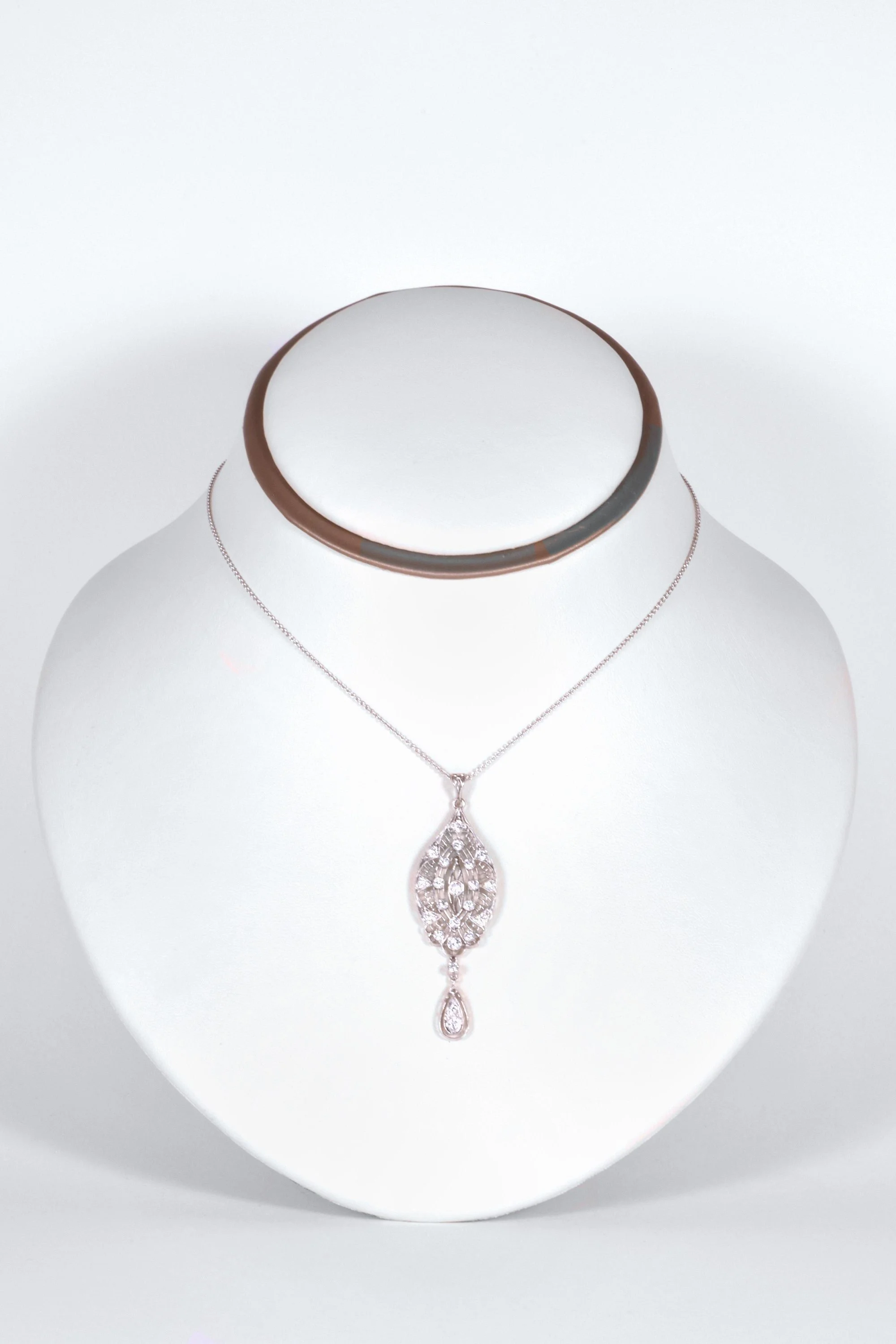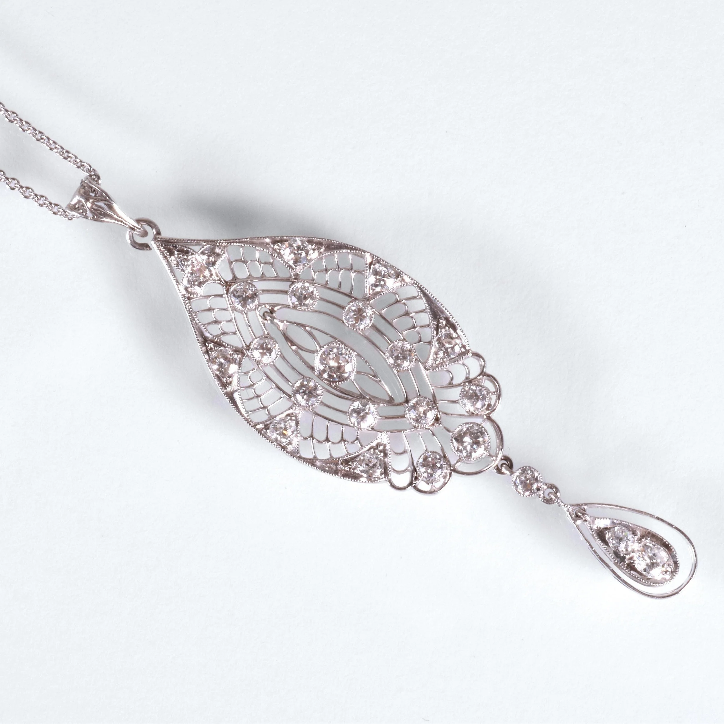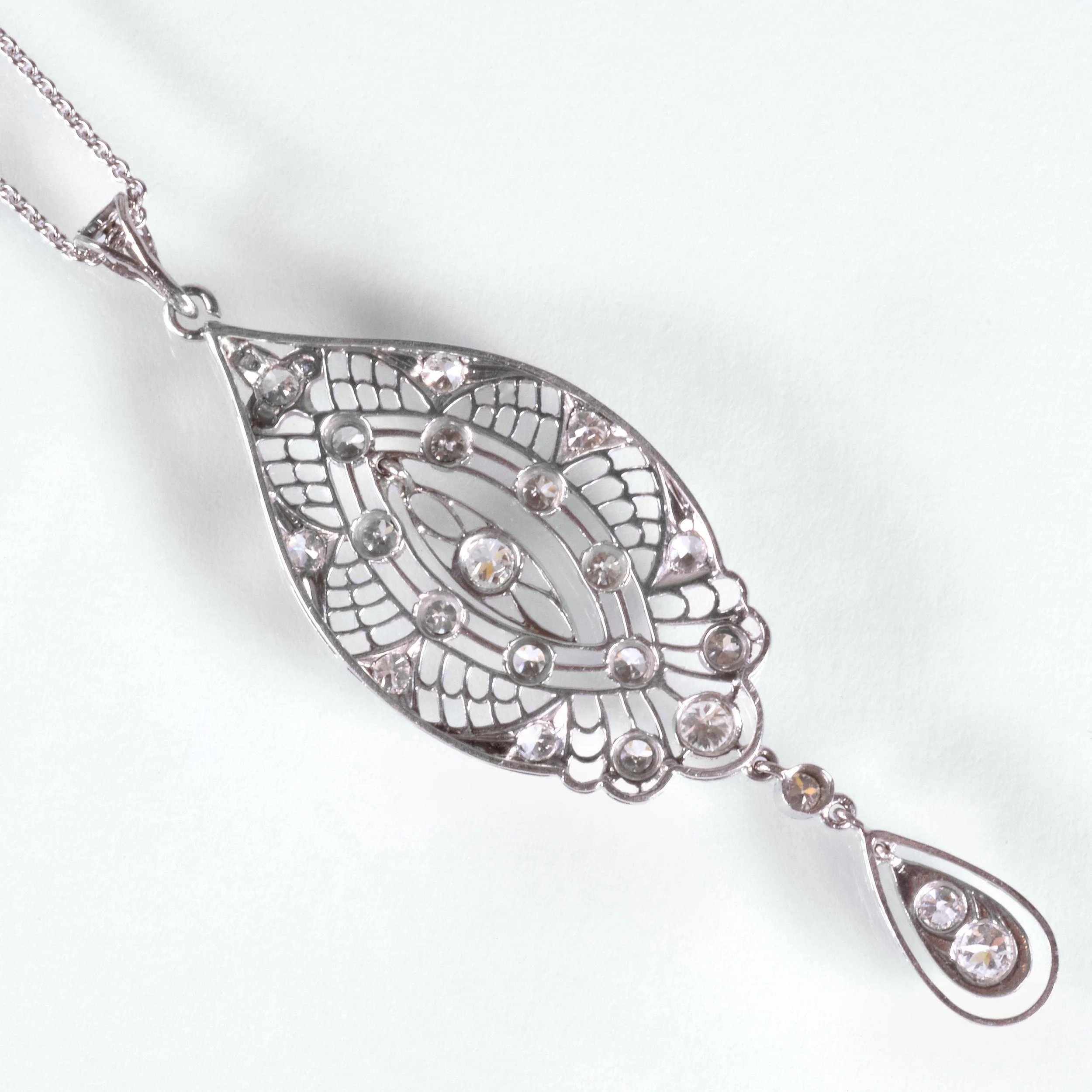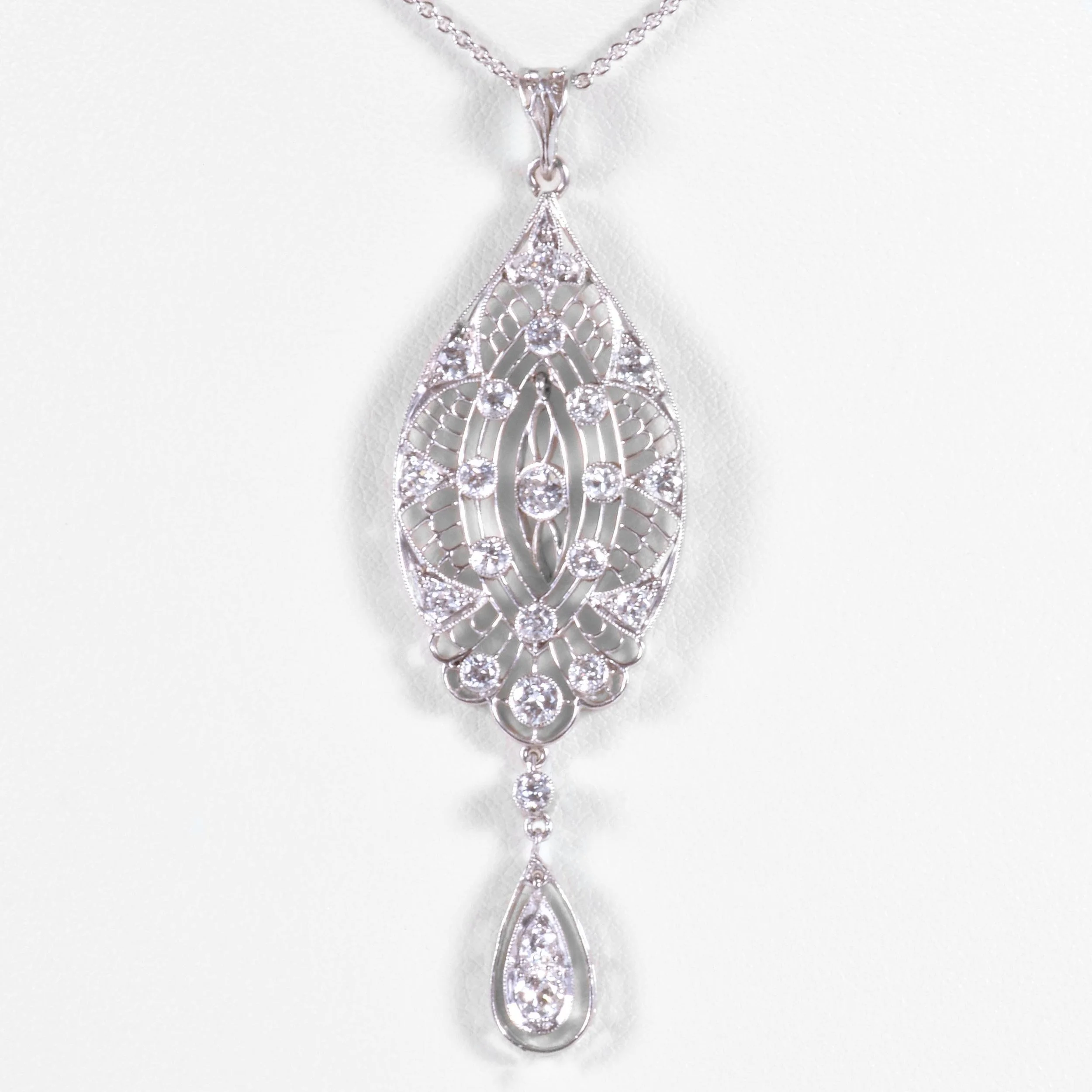 Antique Necklace - Antique Edwardian Platinum & 14k White Gold Diamond Necklace Platinum & 14k White Gold 22 European Cut Diamonds =1.50cts/ VVS-VS/F-G Pendant measures just under 3/4" wide and 2.25" tall at the center New 14k white gold chain measures 18" long with a jump loop at 16"