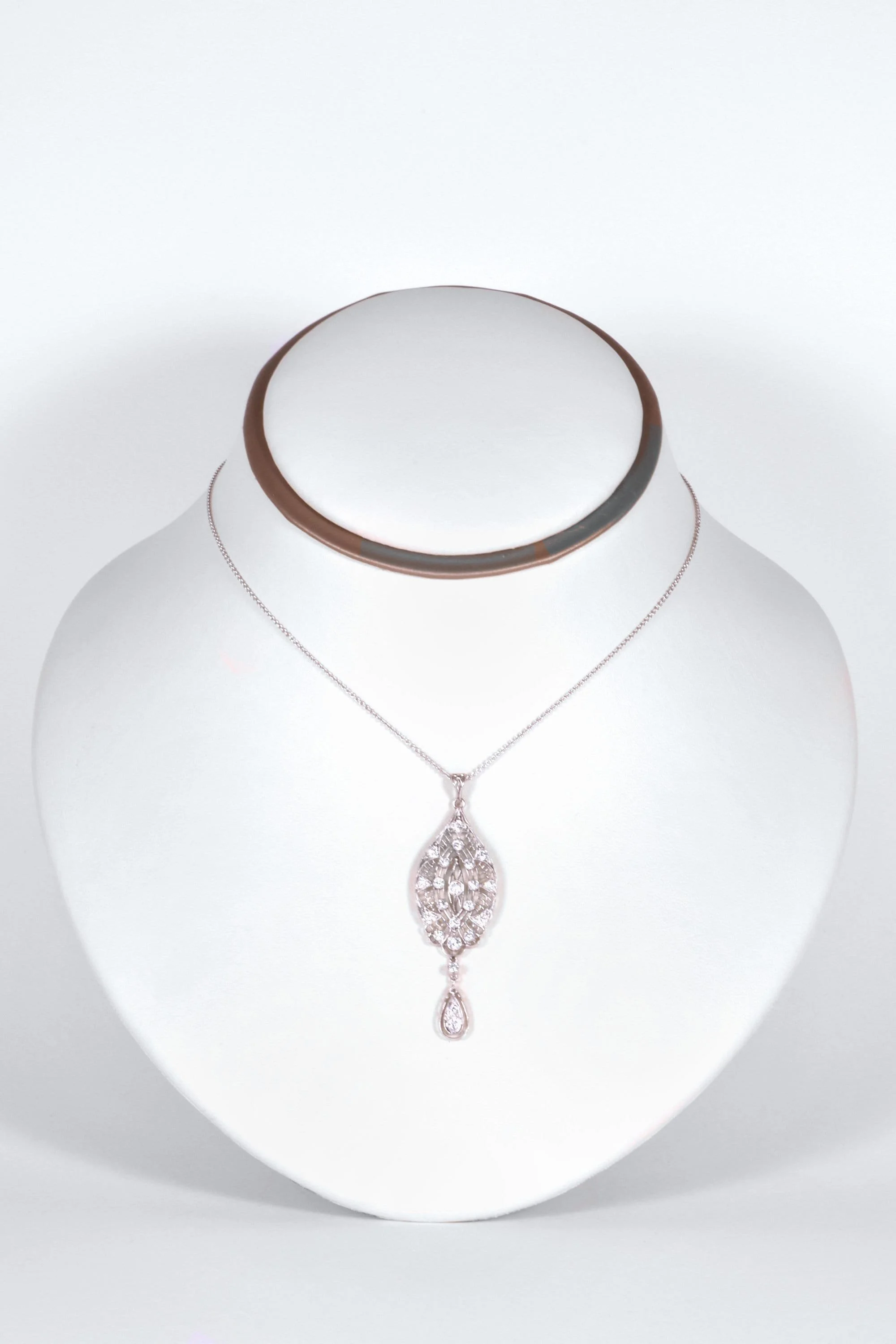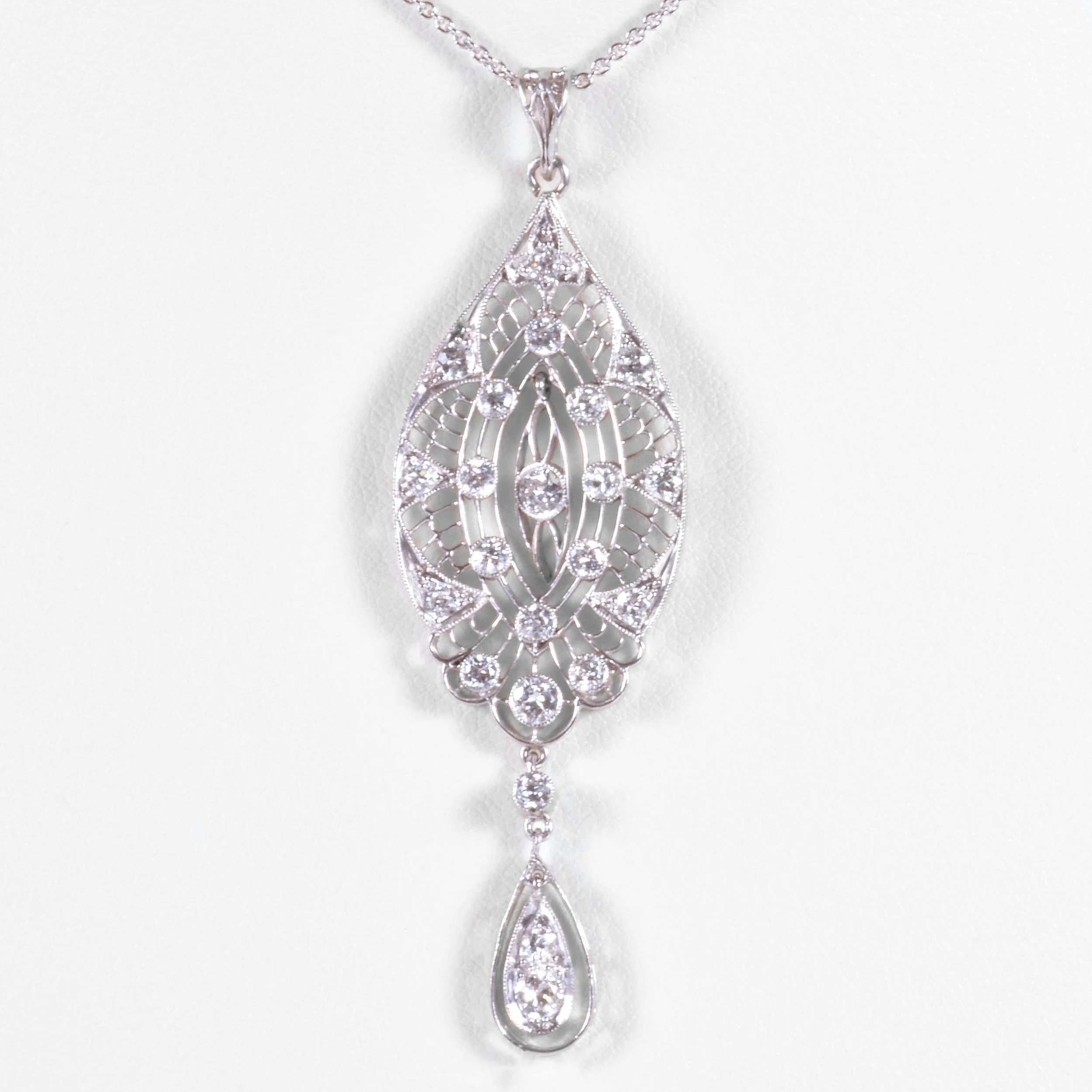 Antique Necklace - Antique Edwardian Platinum & 14k White Gold Diamond Necklace Platinum & 14k White Gold 22 European Cut Diamonds =1.50cts/ VVS-VS/F-G Pendant measures just under 3/4" wide and 2.25" tall at the center New 14k white gold chain measures 18" long with a jump loop at 16"