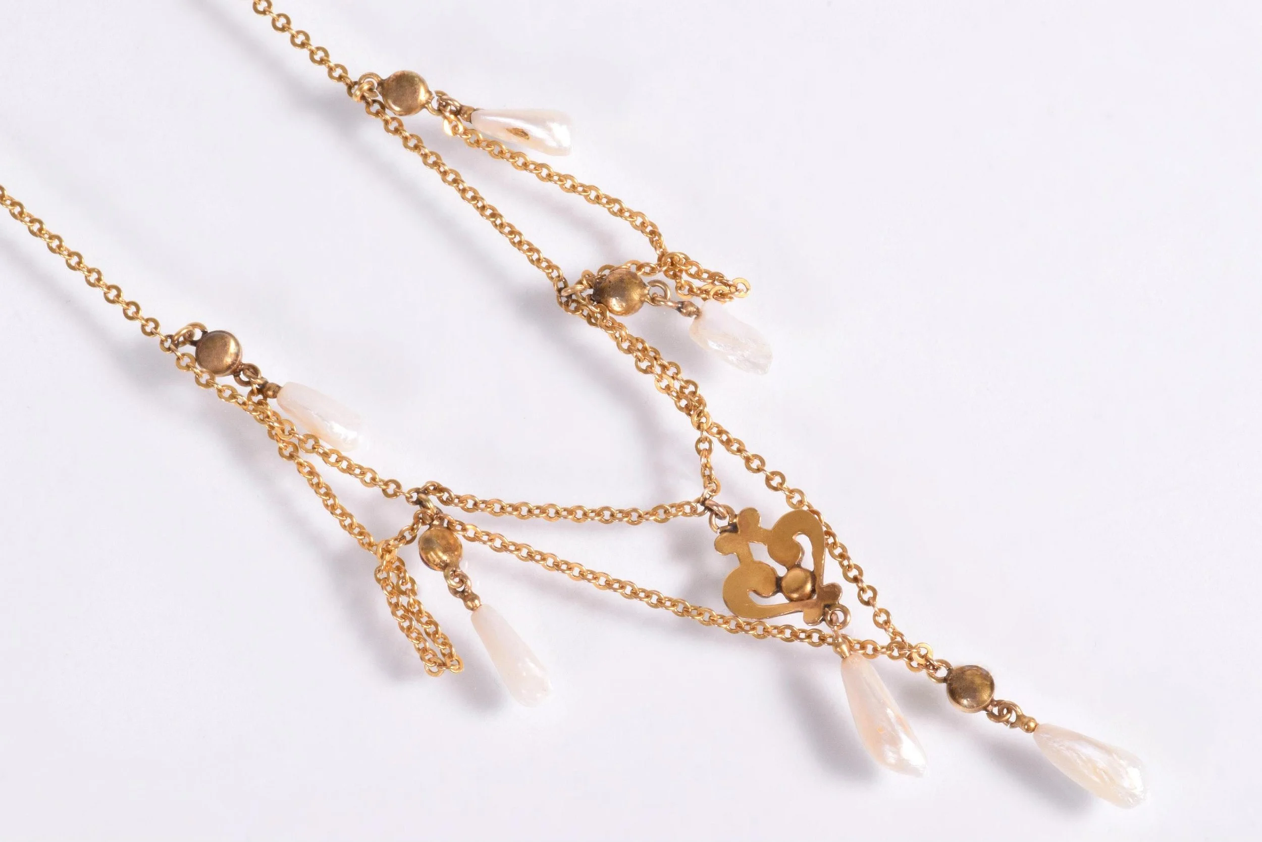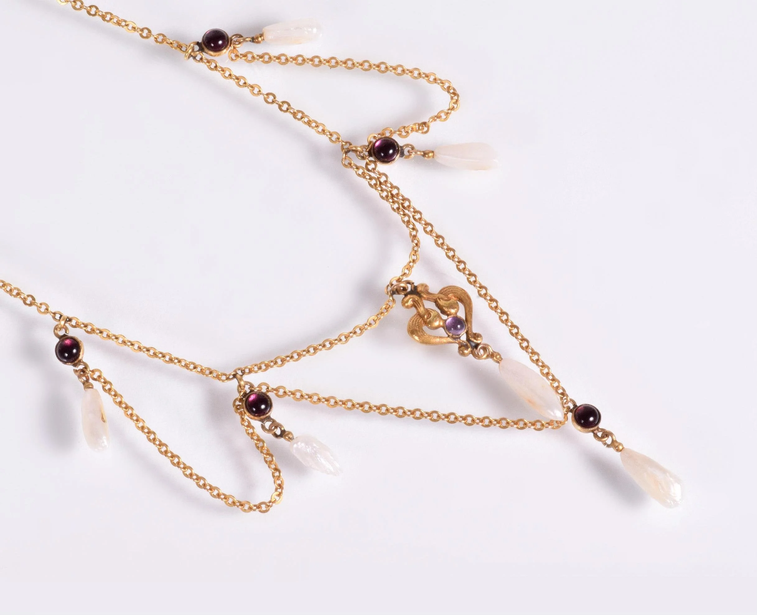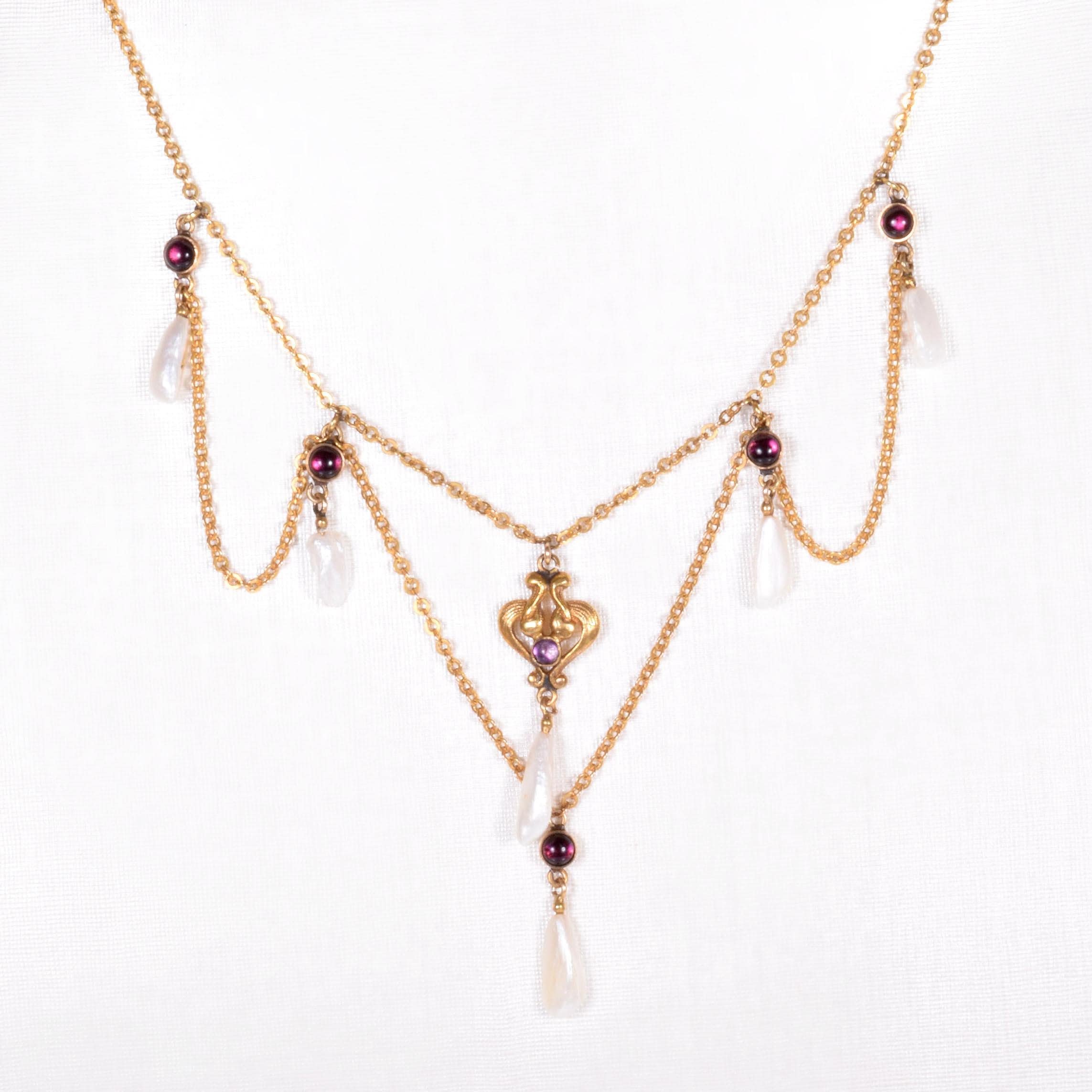 Antique Necklace - Antique Victorian 14k Gold Amethyst & Natural Pearl Lavalier Necklace