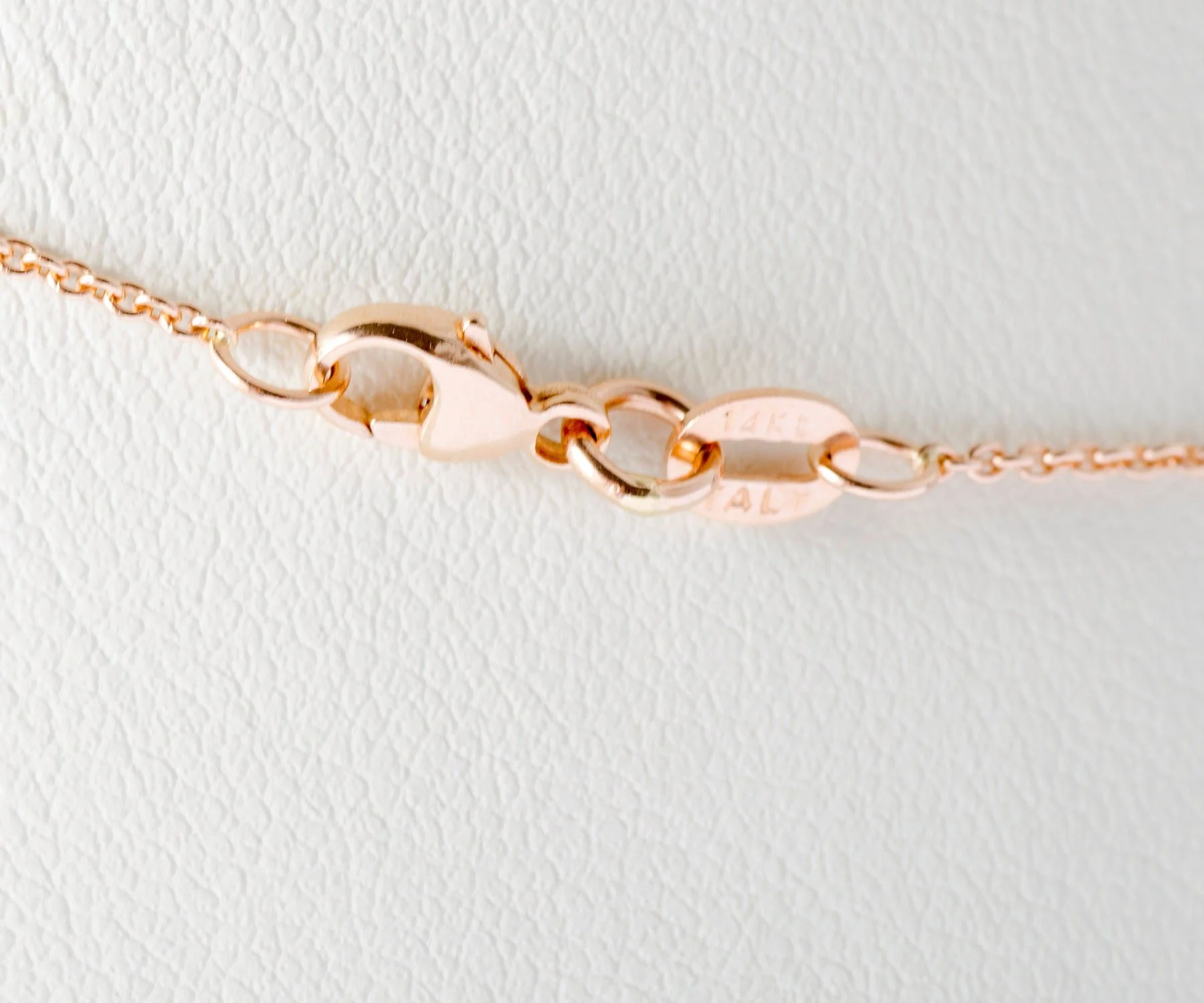 Sweet buttercup settings holding gorgeous white to champagne rose cut diamonds adorn this stunning 14k rose gold bar pendant. The pendant is Victorian and lived its first life as a beautiful and we are sure, adored brooch. So, so pretty and feminine with leaf details are either end.