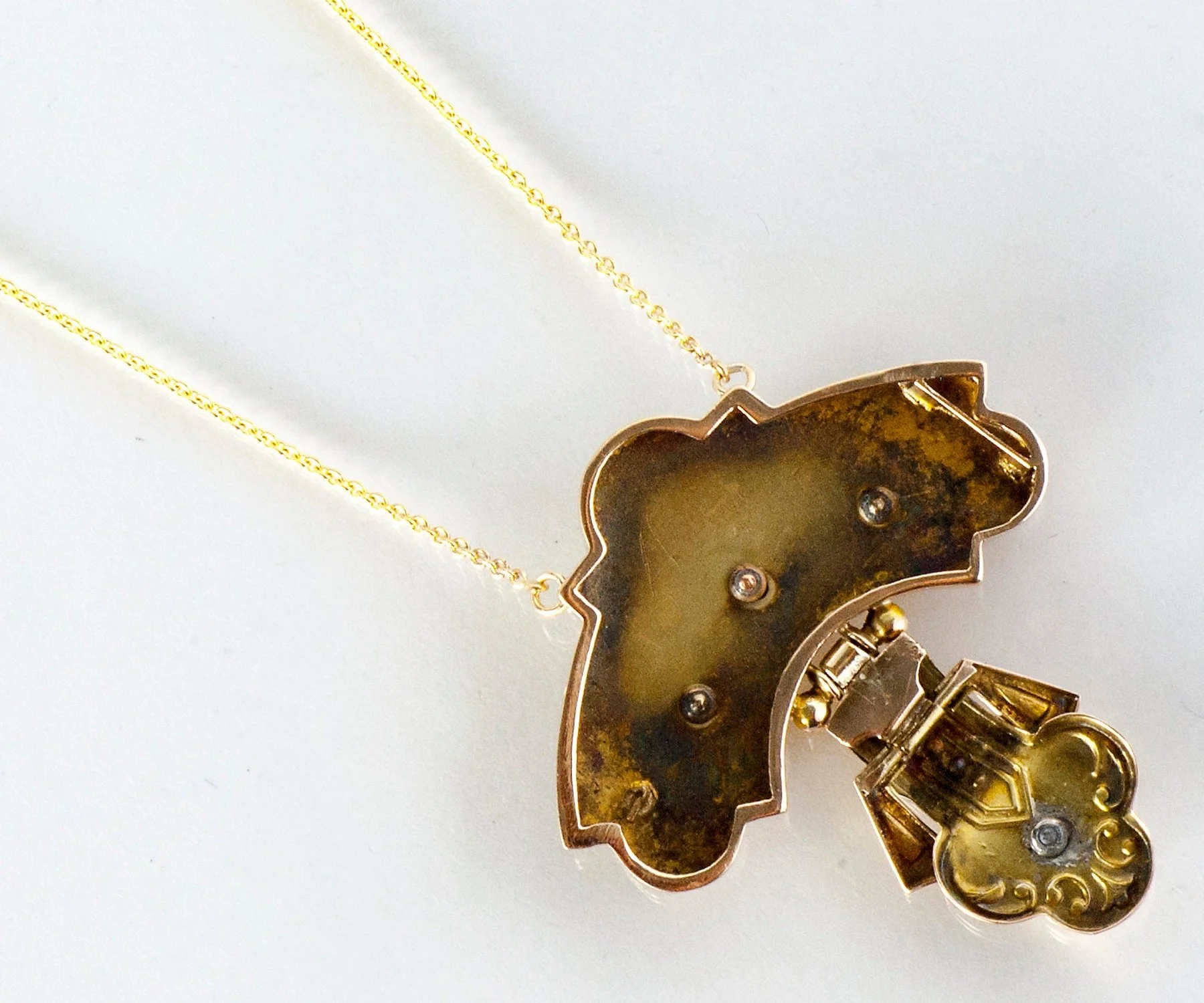 This Victorian necklace lived its first long life as a well-loved brooch. Now in the form of a necklace, we think it is much more wearable for most in todays world. Beautiful fine details are seen in black enamel on a 14k yellow gold backdrop. Varied textures and multiple dimensions draw the eyes. This regal looking necklace will compliment most anything you wear.