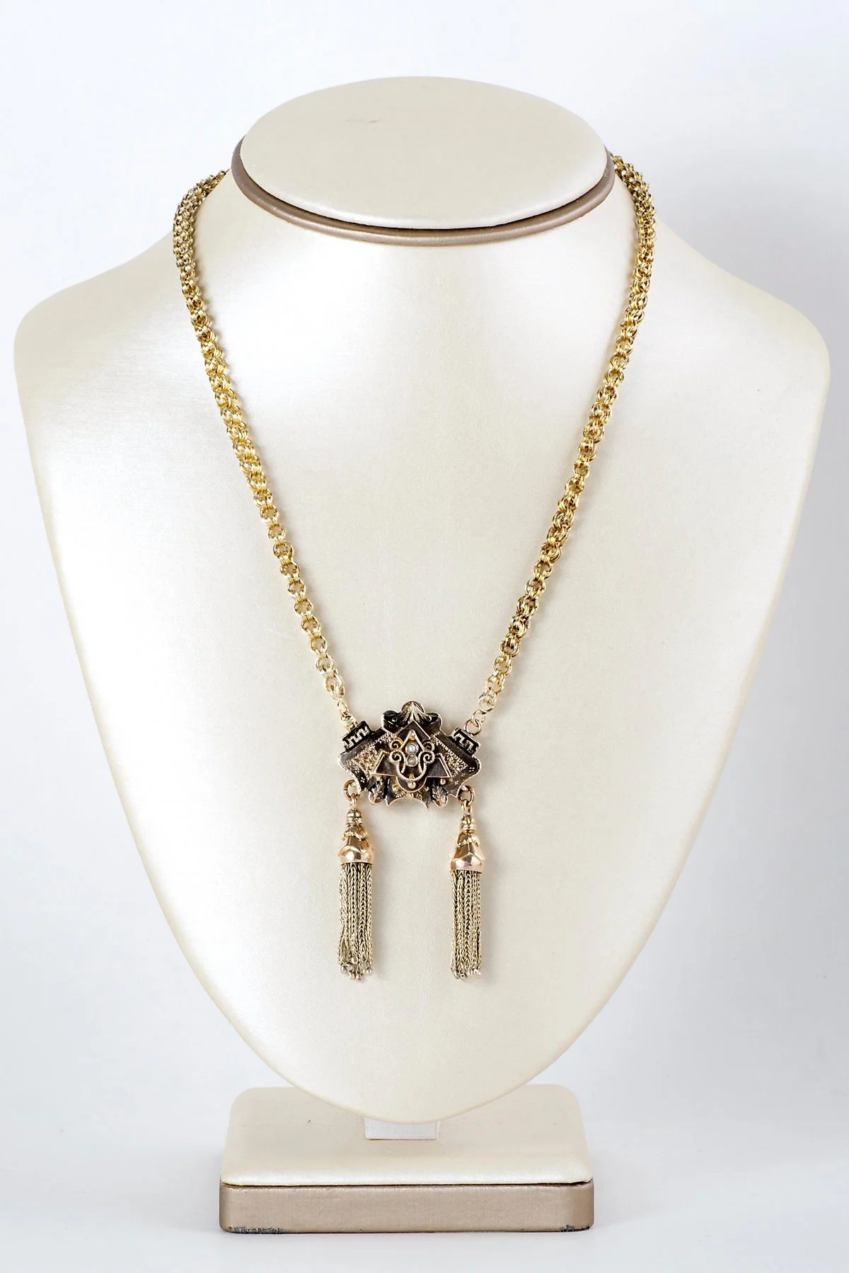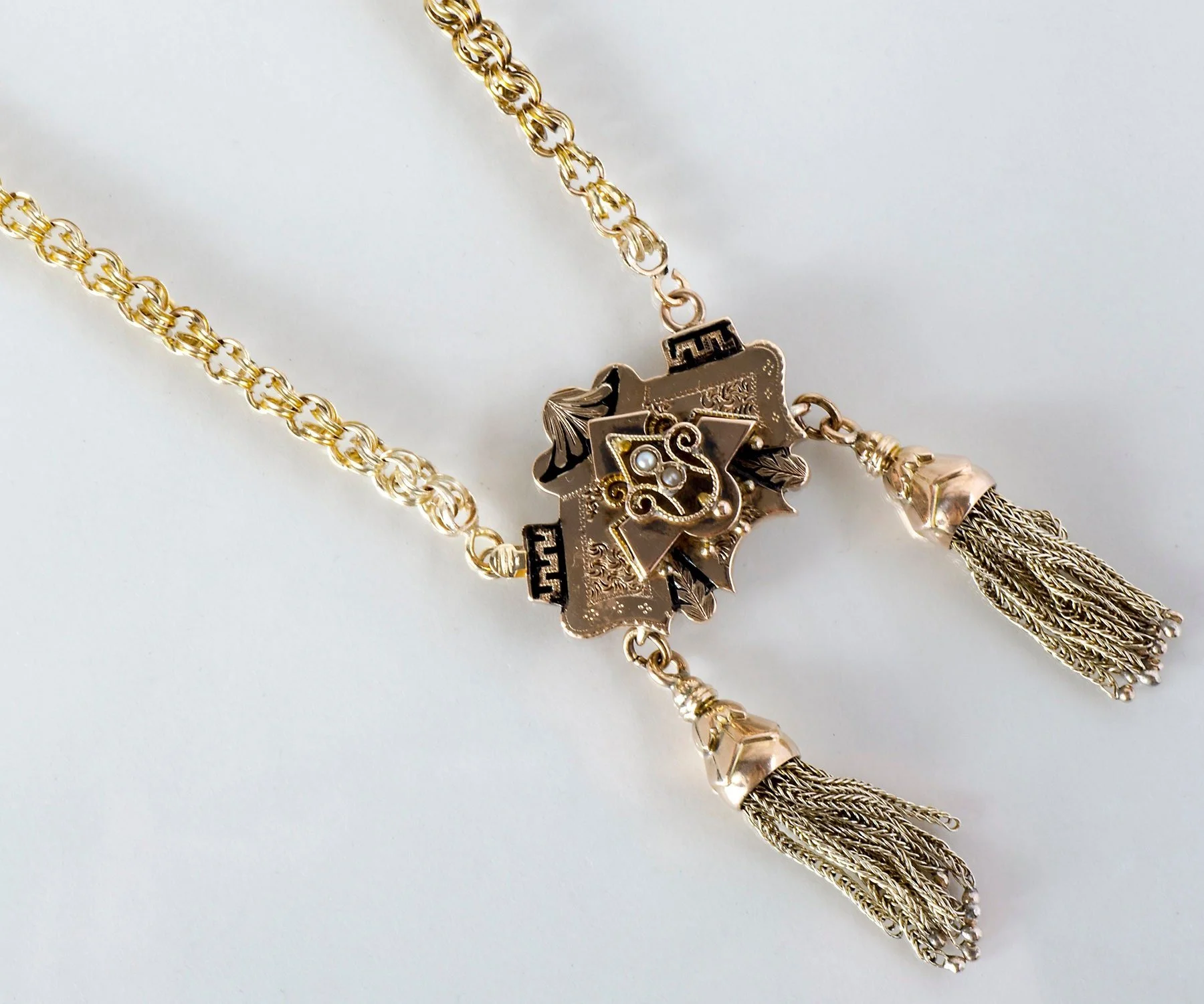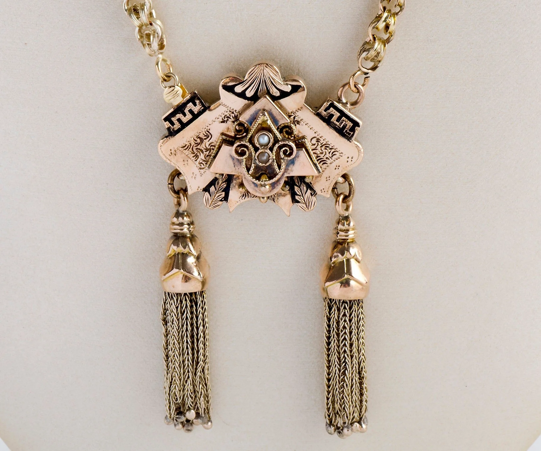 Antique Necklace - Antique Victorian 14k Yellow Gold Black Enamel Tassel Necklace Victorian Black Enamel Seed Pearls Tassels Pendant measures approximately 2 7/8" top to bottom and 1.25" side to side. Entire necklace measures approximately 18" long.