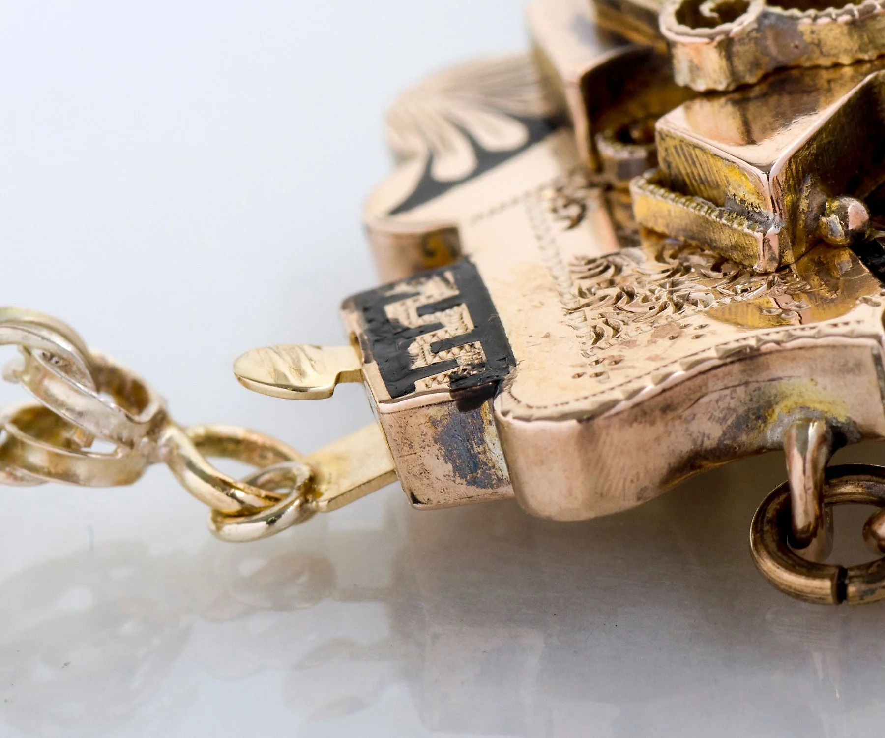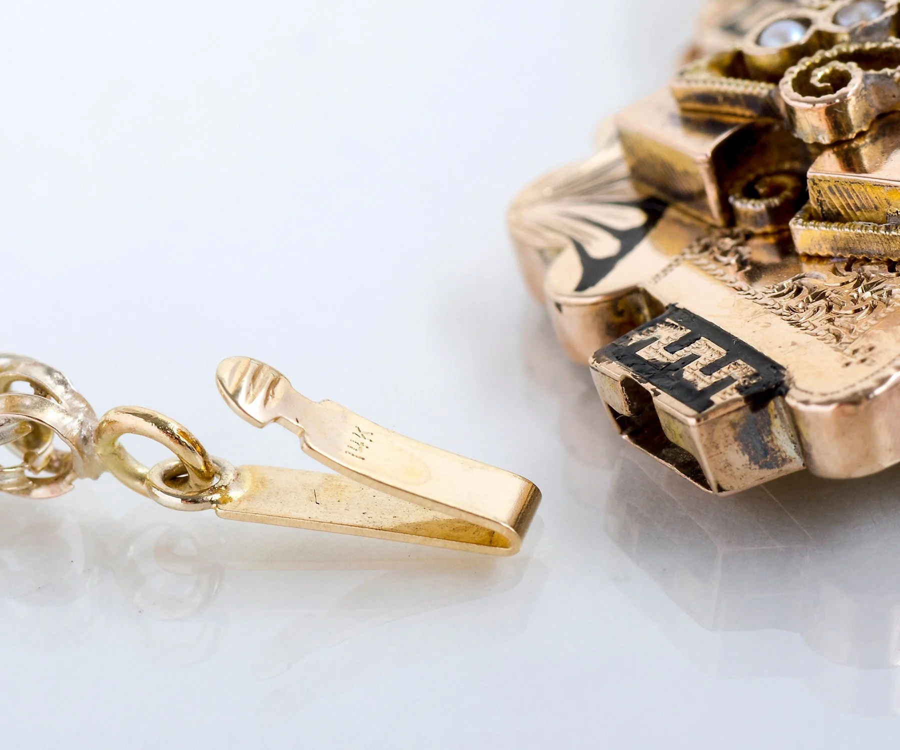 This fabulous antique Victorian necklace is divine! Created in 14k yellow gold and adorned with both seed pearls and black enamel details. A very eye-catching piece for sure and it should be enjoyed on a regular basis. Tassels dangle from bell shapes giving the pendant graceful movement. Make this treasure yours!
