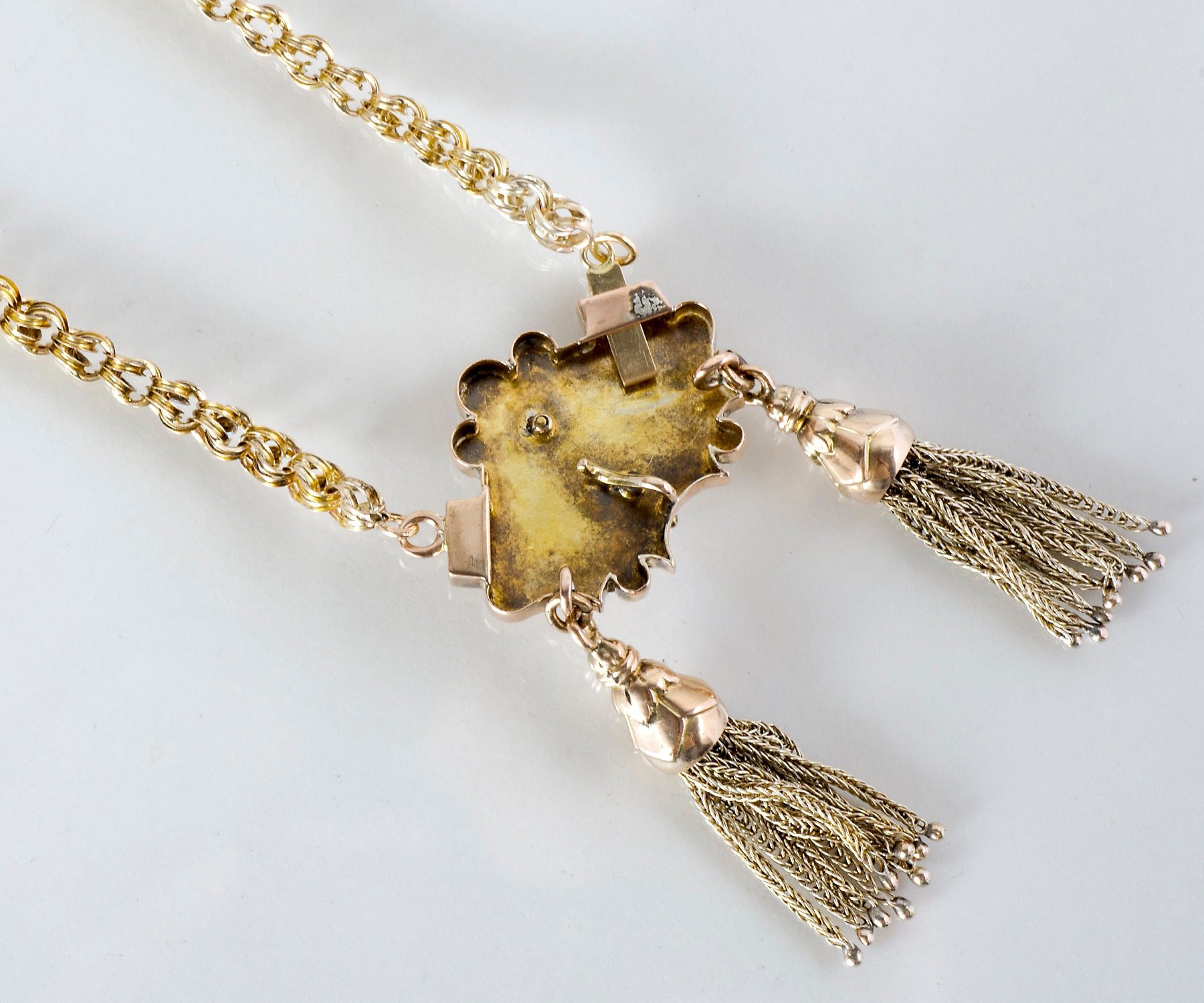 Antique Necklace - Antique Victorian 14k Yellow Gold Black Enamel Tassel Necklace Victorian Black Enamel Seed Pearls Tassels Pendant measures approximately 2 7/8" top to bottom and 1.25" side to side. Entire necklace measures approximately 18" long.