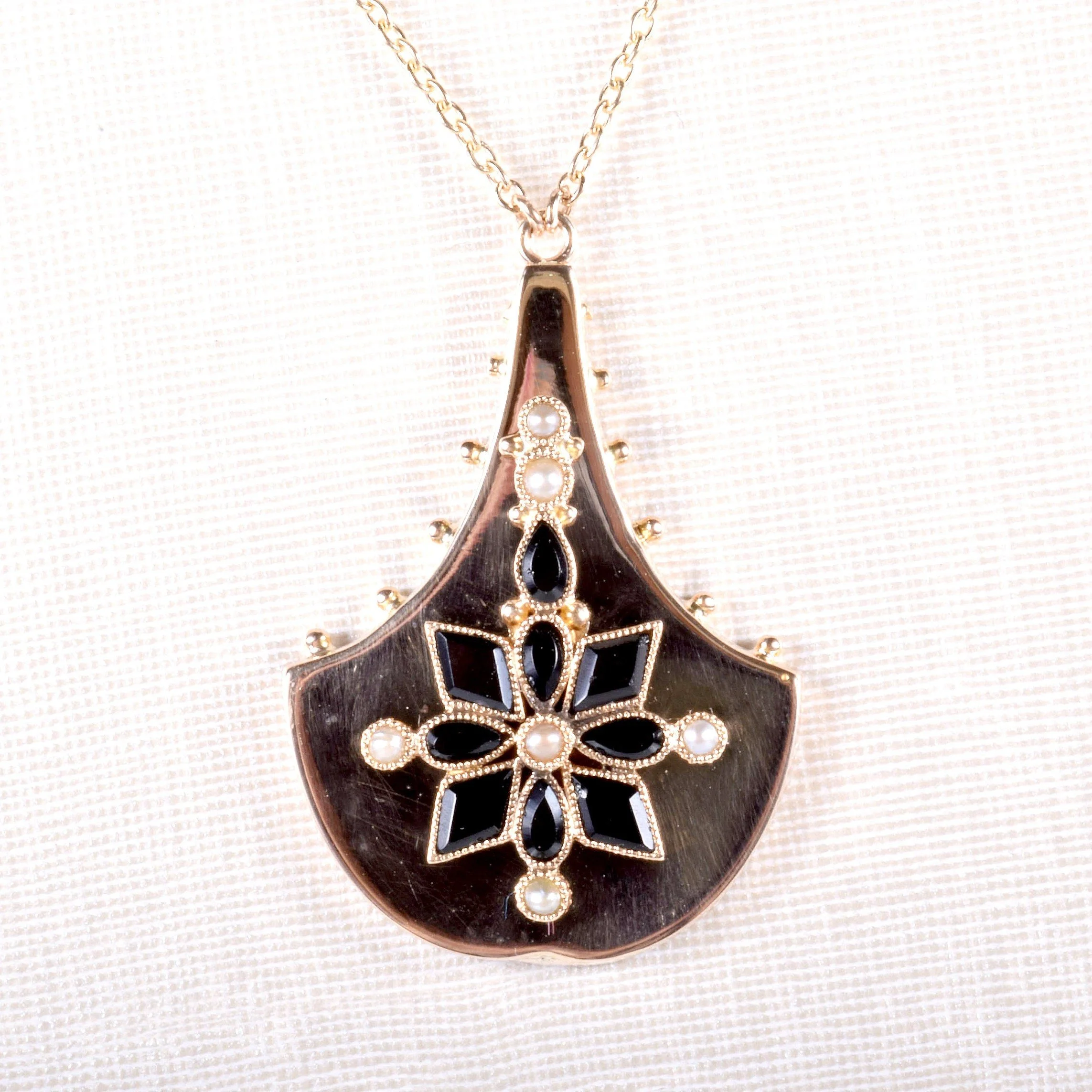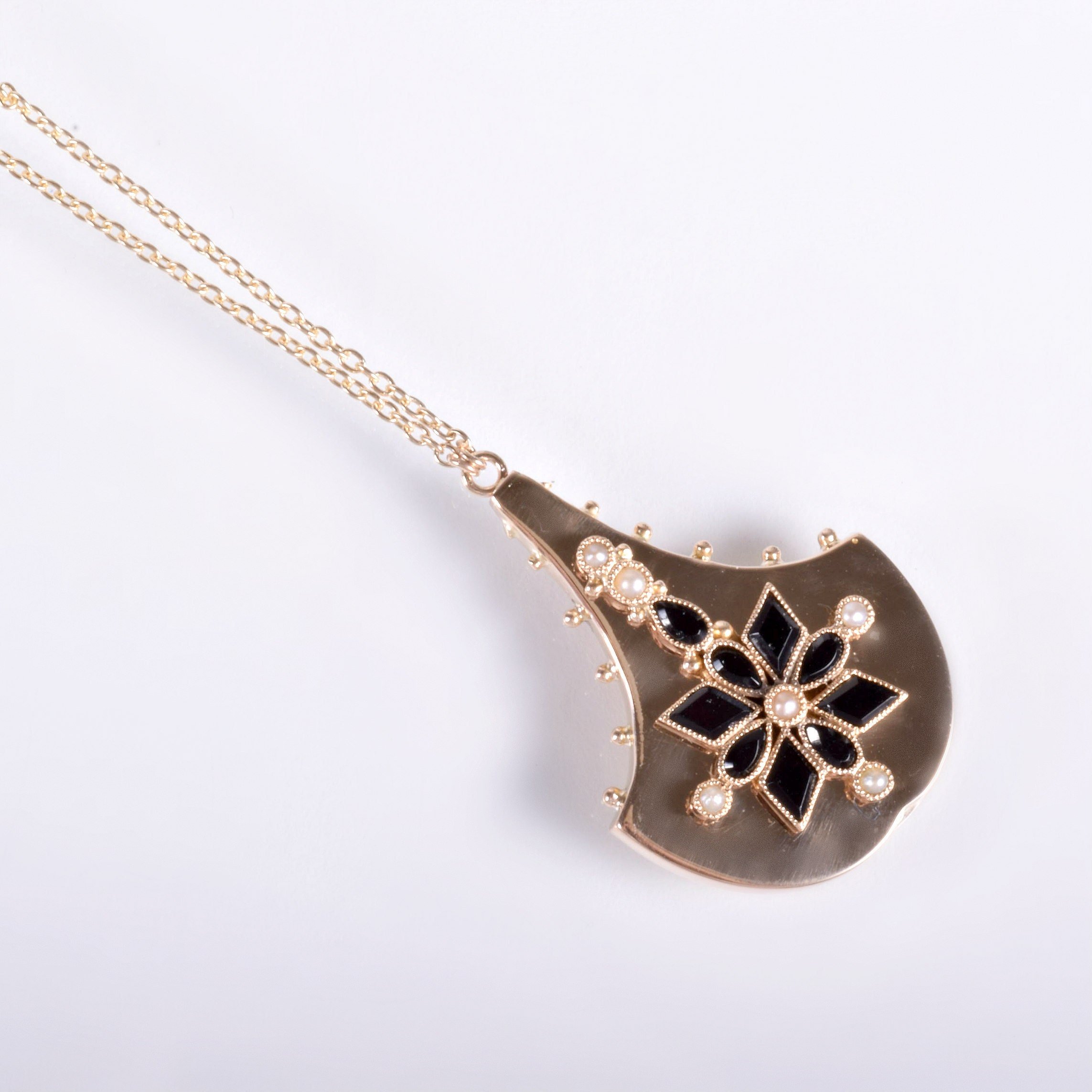 Antique Necklace - Antique Victorian 14k Yellow Gold Onyx & Seed Pearl Conversion Pendant Late 1800's 14k Yellow Gold Black Onyx Seed Pearls Pendant measures approximately 1 1/8" tall and 3/4" wide. New 14k yellow gold chain is 17" with a jump ring at 16".